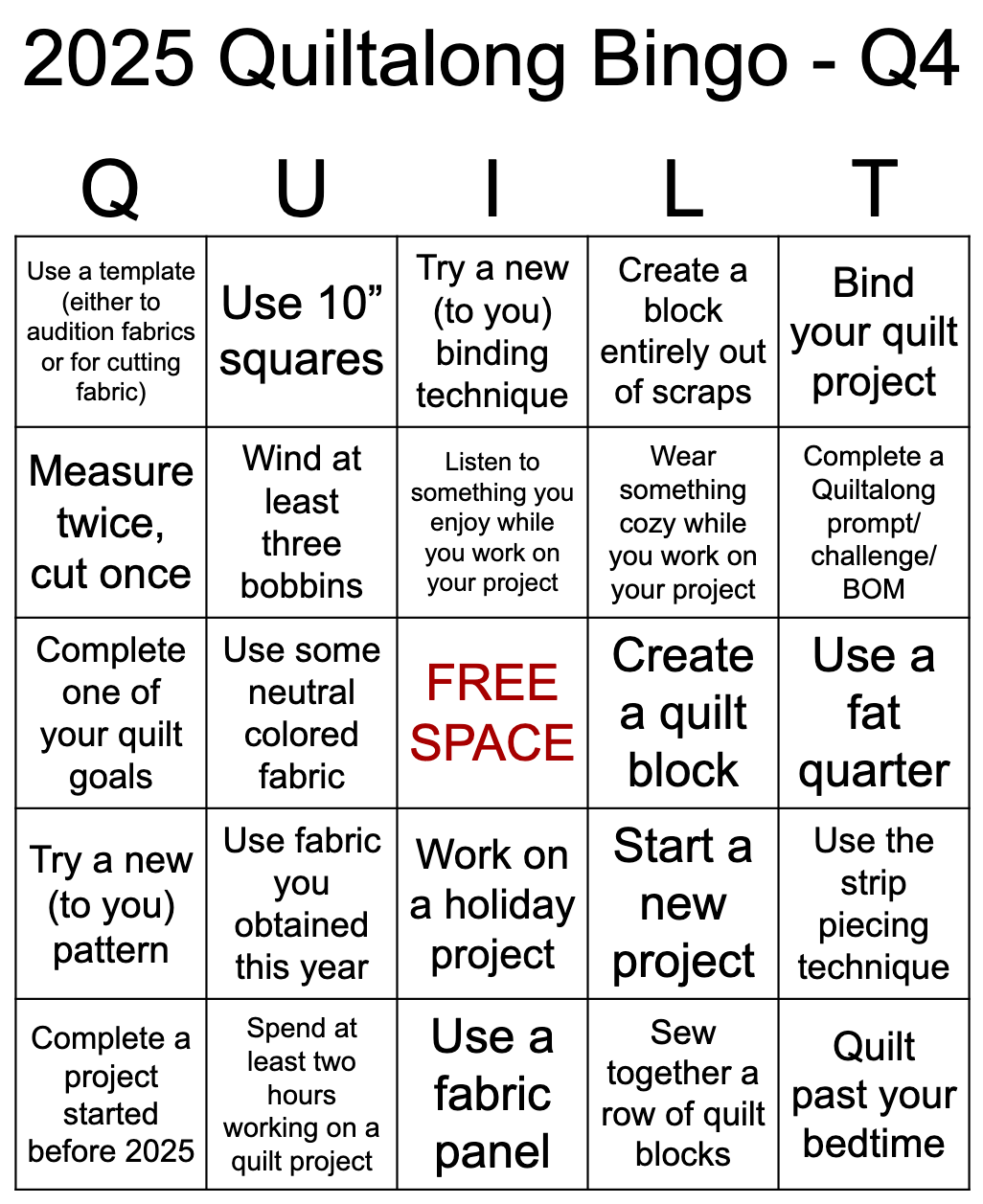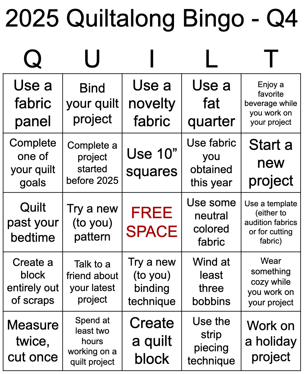 And now, onto the fourth quarter Bingo! This quarter includes prompts to help maximize the enjoyment of quilting (ie. wear a cozy outfit or enjoy your favorite beverage while quilting).