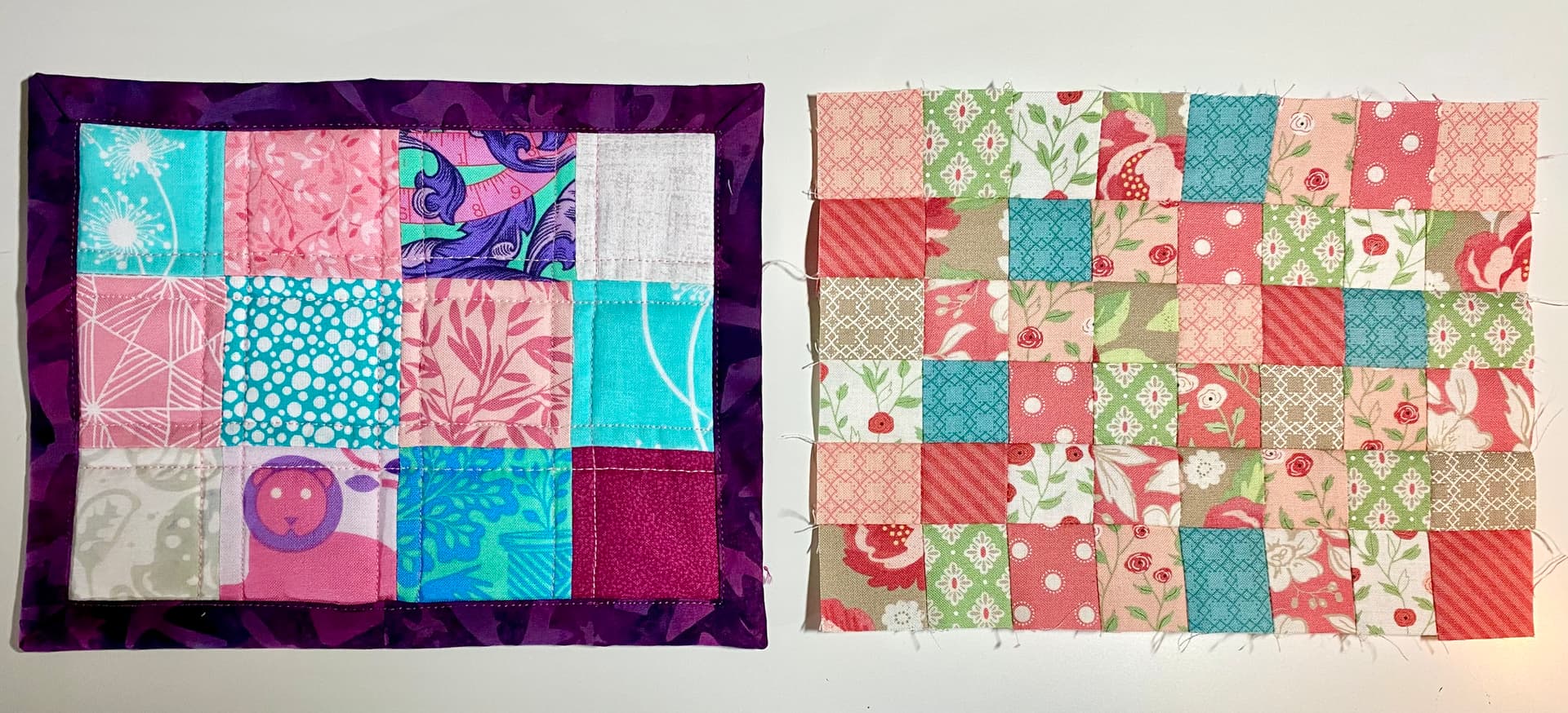 I’ve been making a ton of mug rugs. First for a class I was teaching, then some to add to my Christmas gift stash. I’ve been using 2.5” squares, but the scraps I had to use up for my SIL, we’re all smaller than that. 1.5” squares, that sew up to 1”. Here it is compared to my usual…