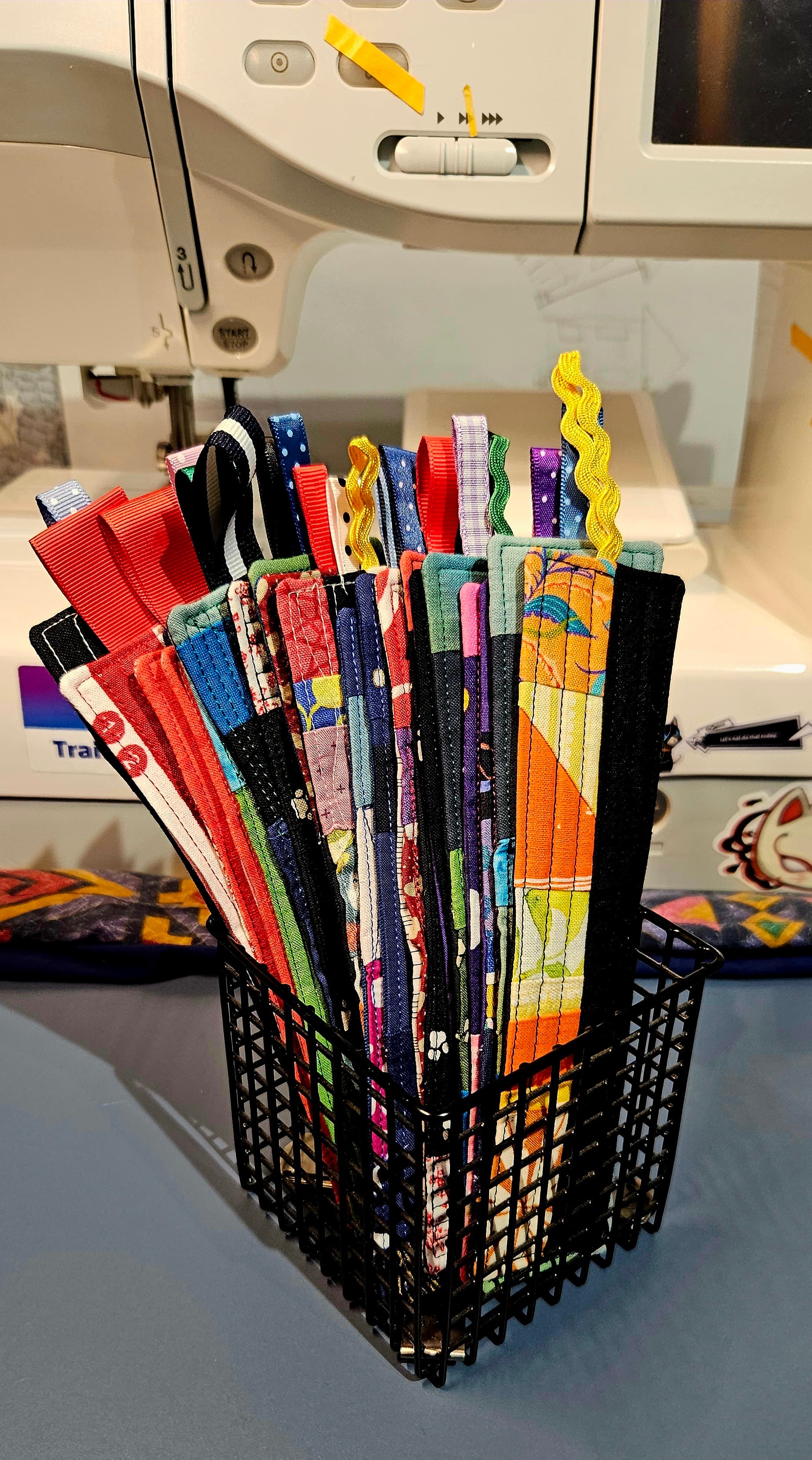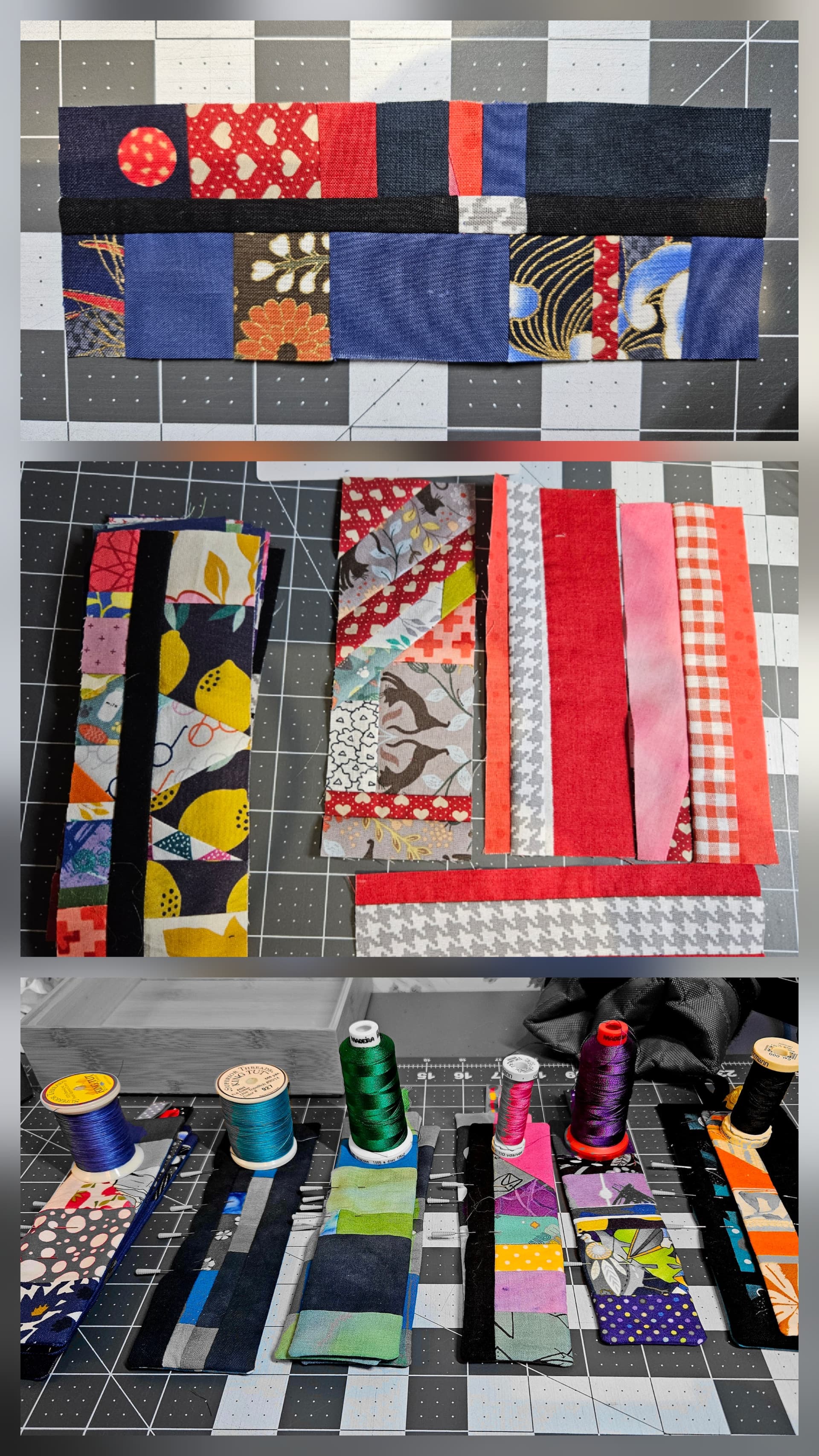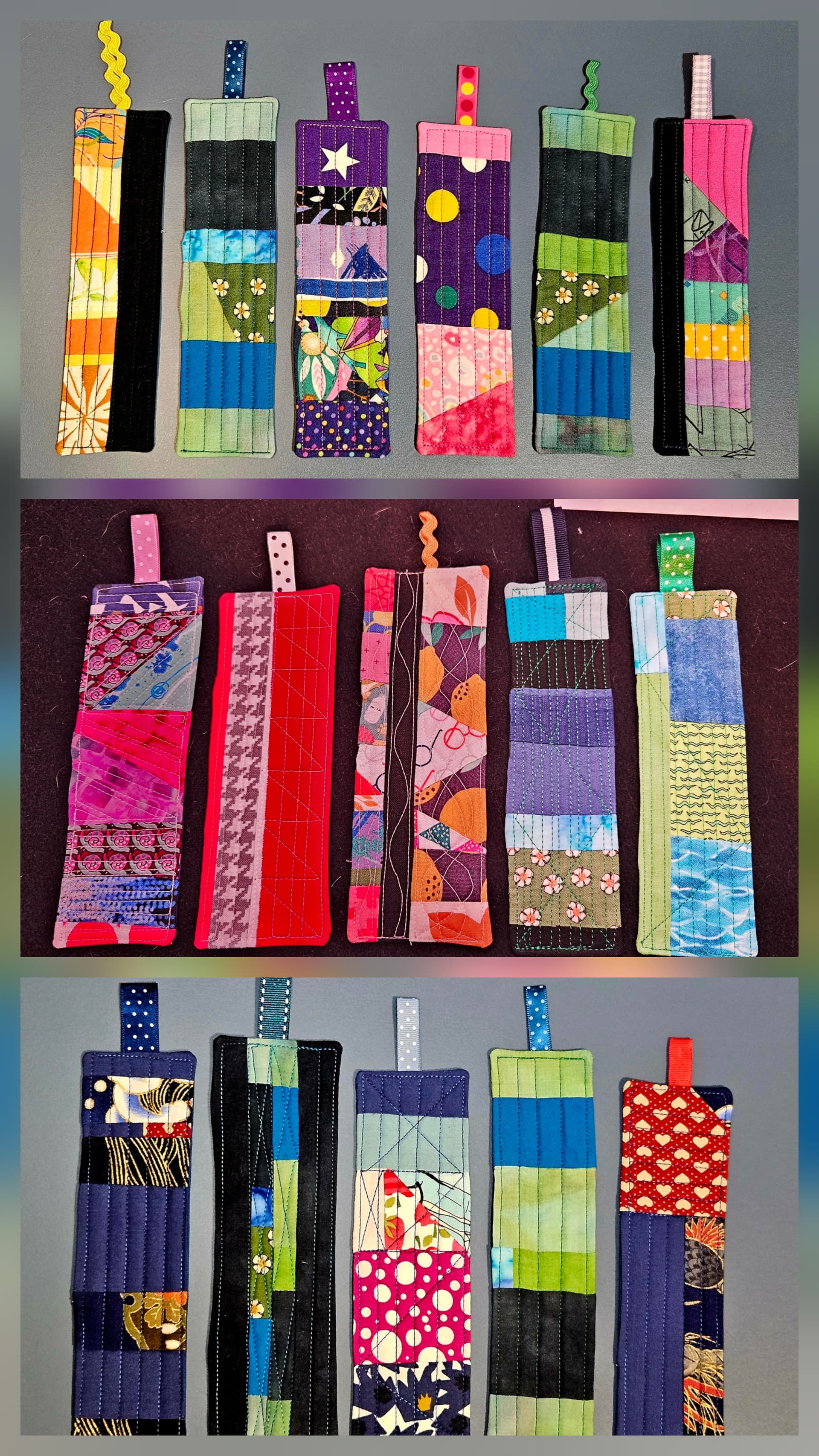 A good technique for making them look cohesive was to pair a scrappy strip with black or a solid. I then quilted them in a few different thread colours.