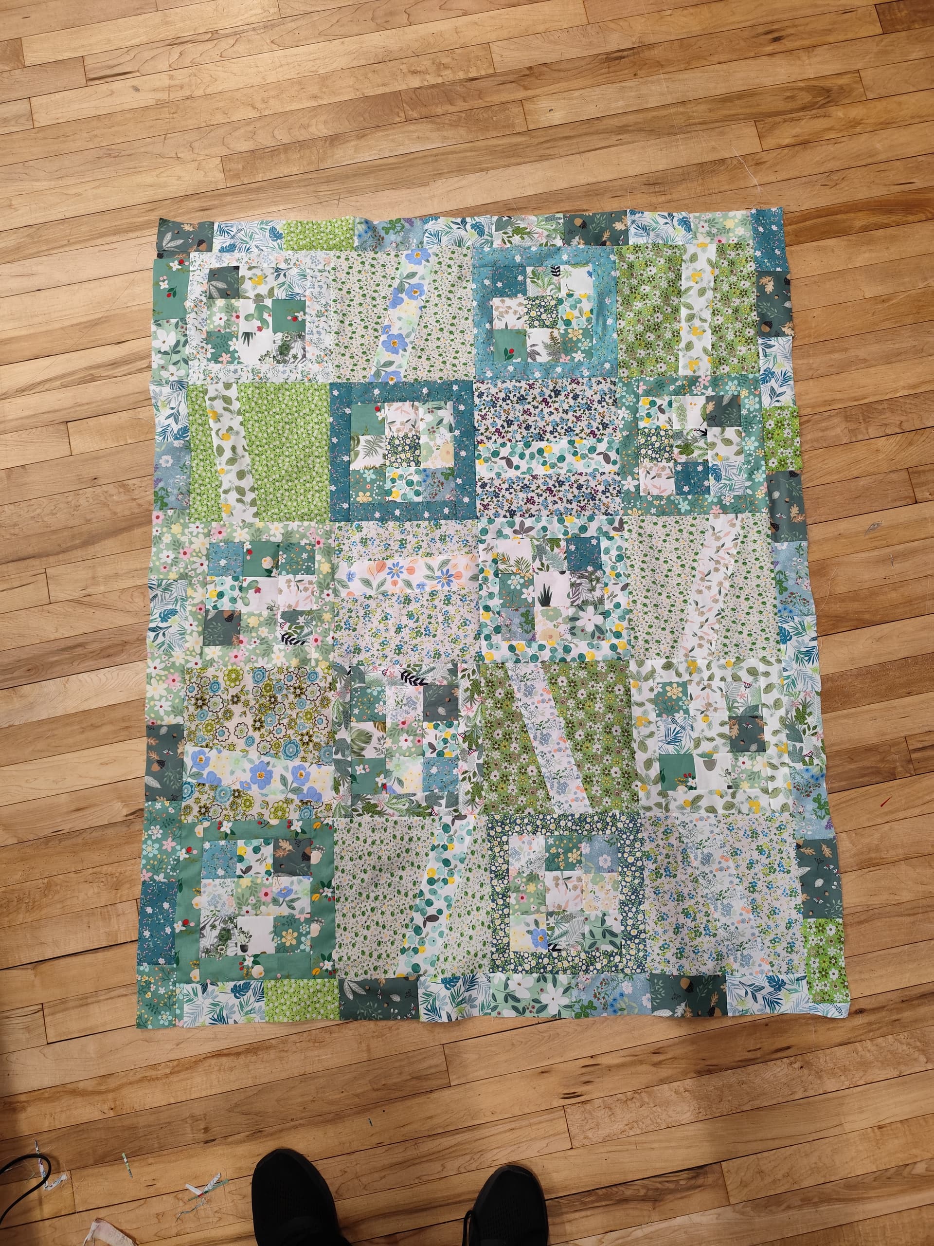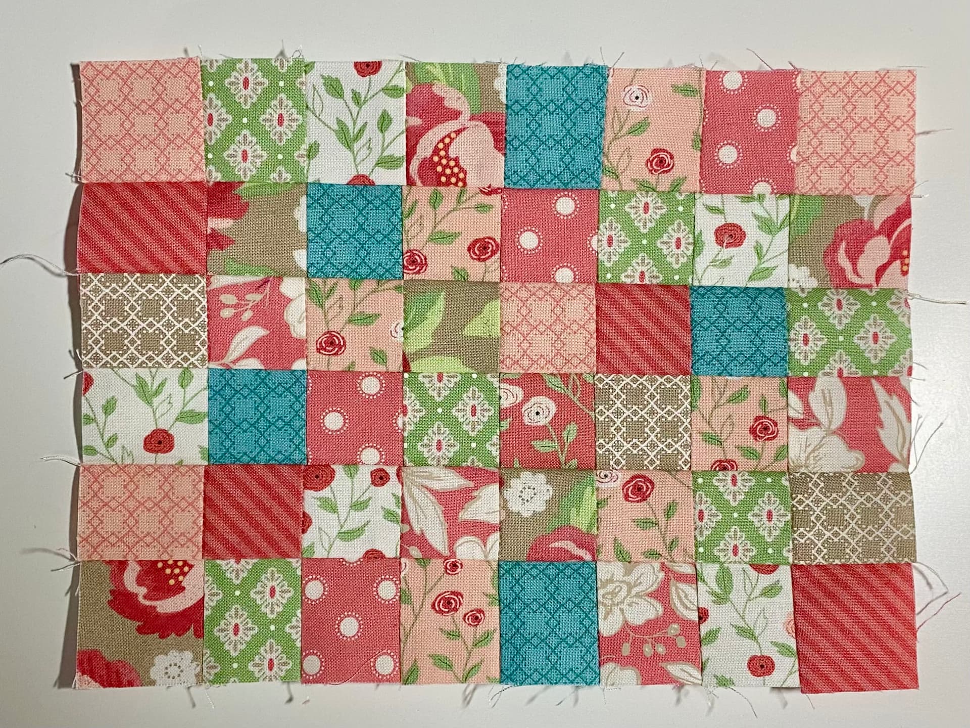 Because I wasn’t sure how it would behave, I brought cheap fabric with me. There were 10”sqs that were so thin and loads of “jelly rolls” or what the Chinese sellers call Jelly rolls, they were 10”*2.5 and I improvised. Actually I’m pretty happy with the result. The blues pop more in that photo than real life, it’s mostly greens and quite calming