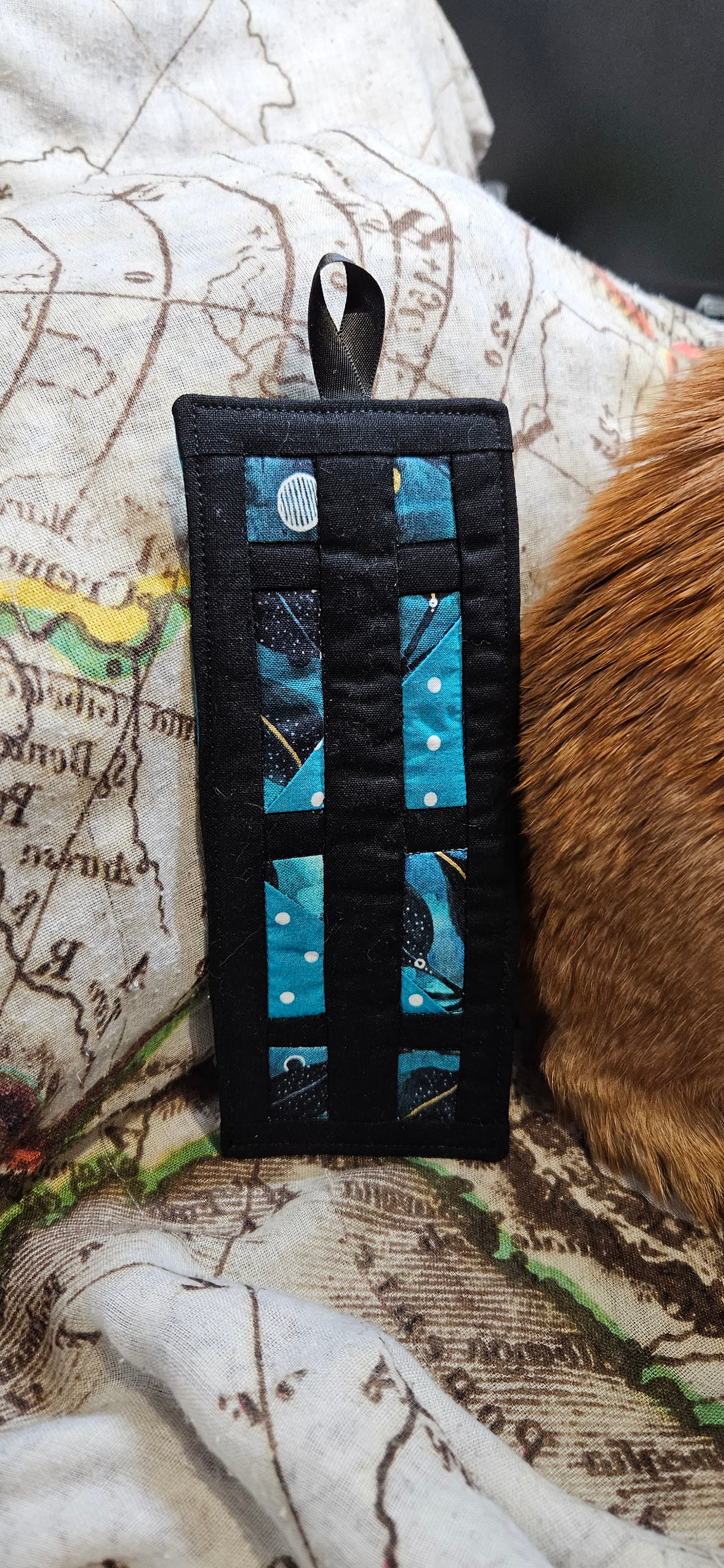 And I started out making this bookmark from a couple of leftover HSTs, which unbeknownst to me had polycotton fabric in, so some melted under the iron. But it was too skinny for a bookmark, so I added black sashing.