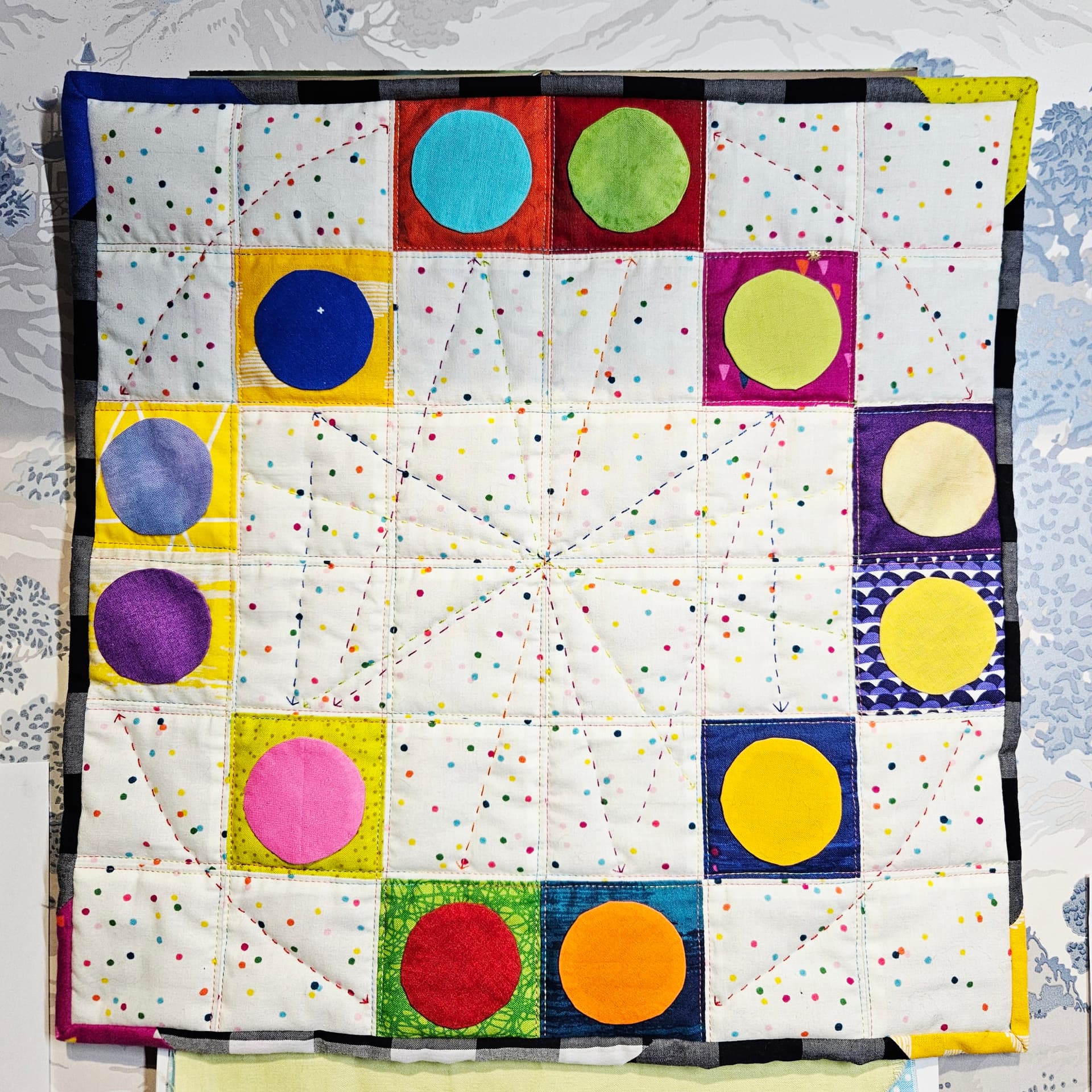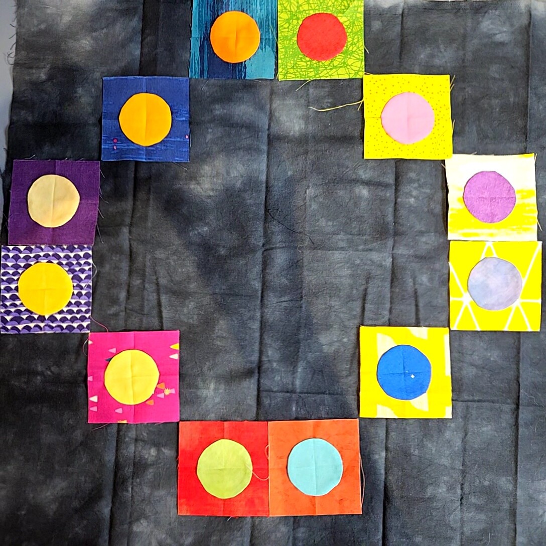 I LittleCogs, offer the Colour Wheel Mini Quilt for my medium personal finish.It might only be 14.5” square but all the circles are hand appliqued and I did a bunch of hand stitching to indicate colour scheme types.