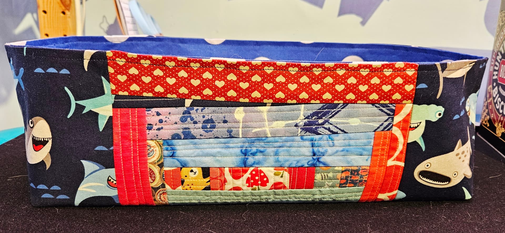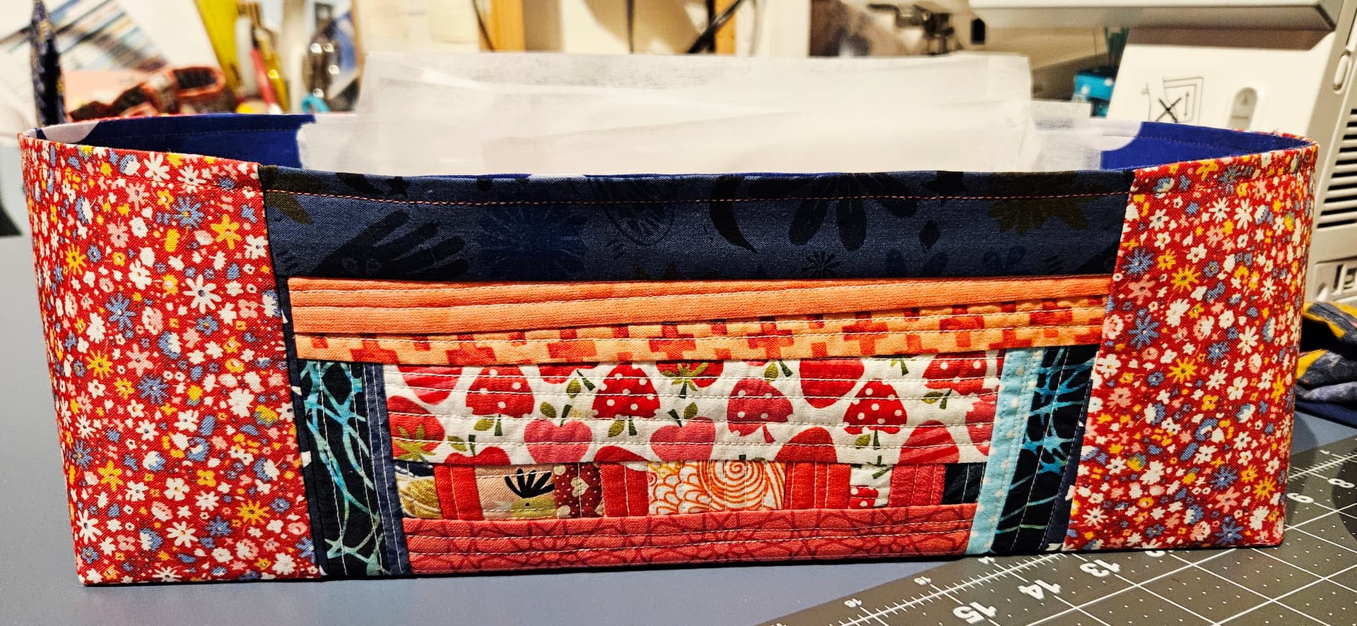 It is quite lovely! I love scrappy projects like that! I also made those baskets for @jemimah a few years ago. Someone online was kind enough to share sizing information. When I find the file, I would be happy to share it here.