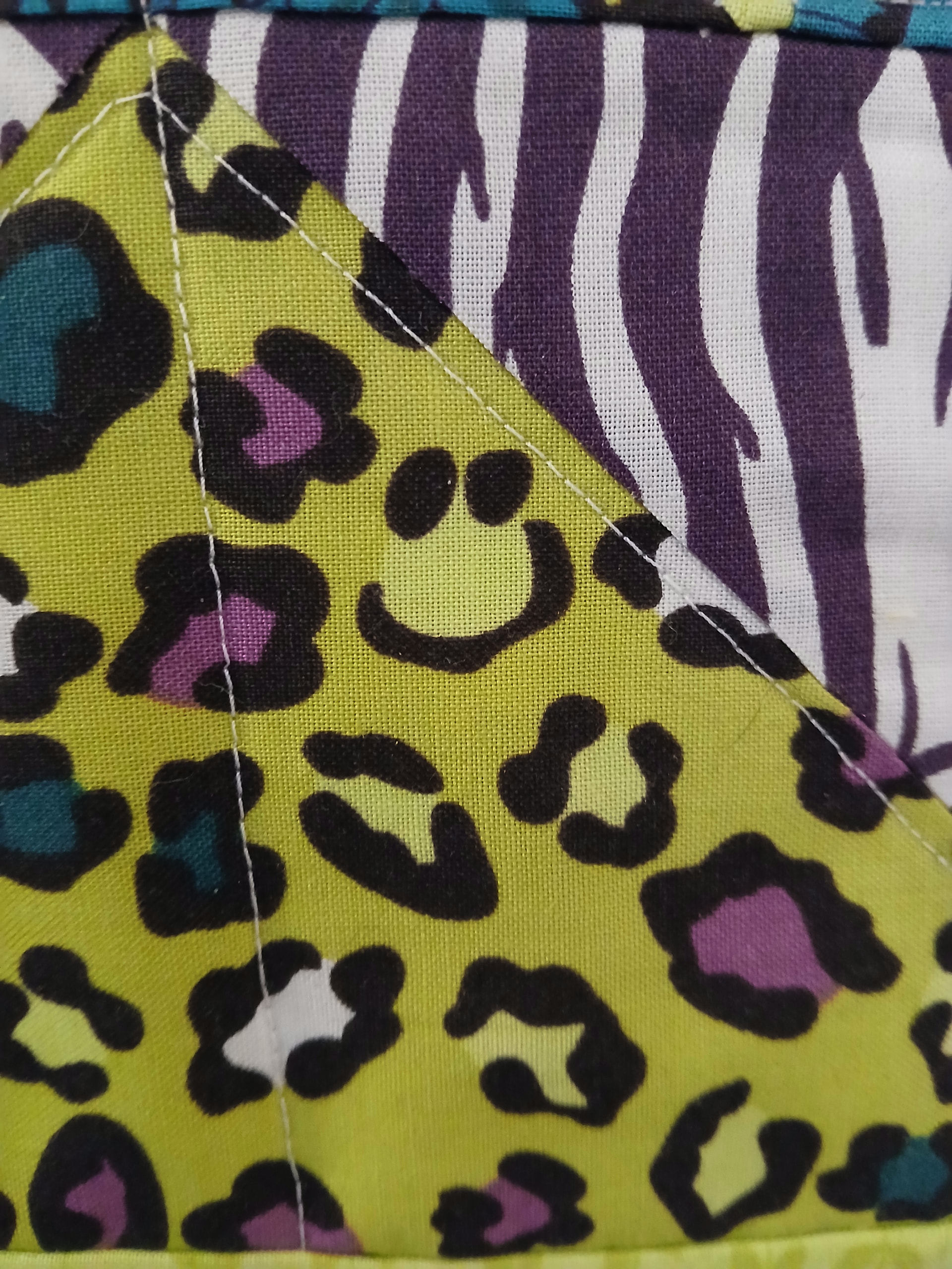 I, AIMR, offer this quilted tote bag as a goal list completion. It is made from an unfinished jelly roll quilt top. The body of the bag is quilted with lime green straight line stitching.