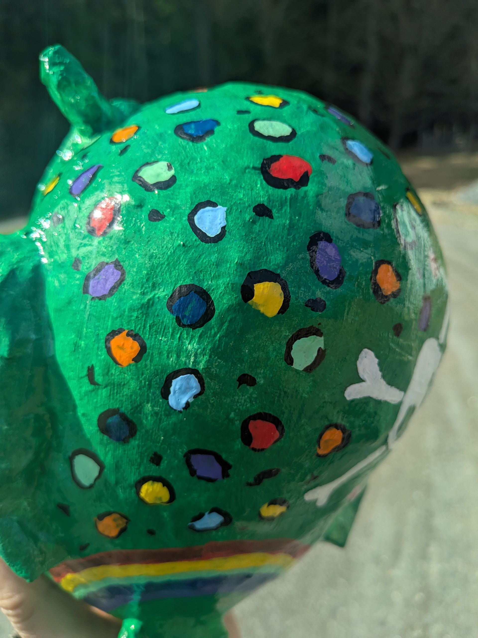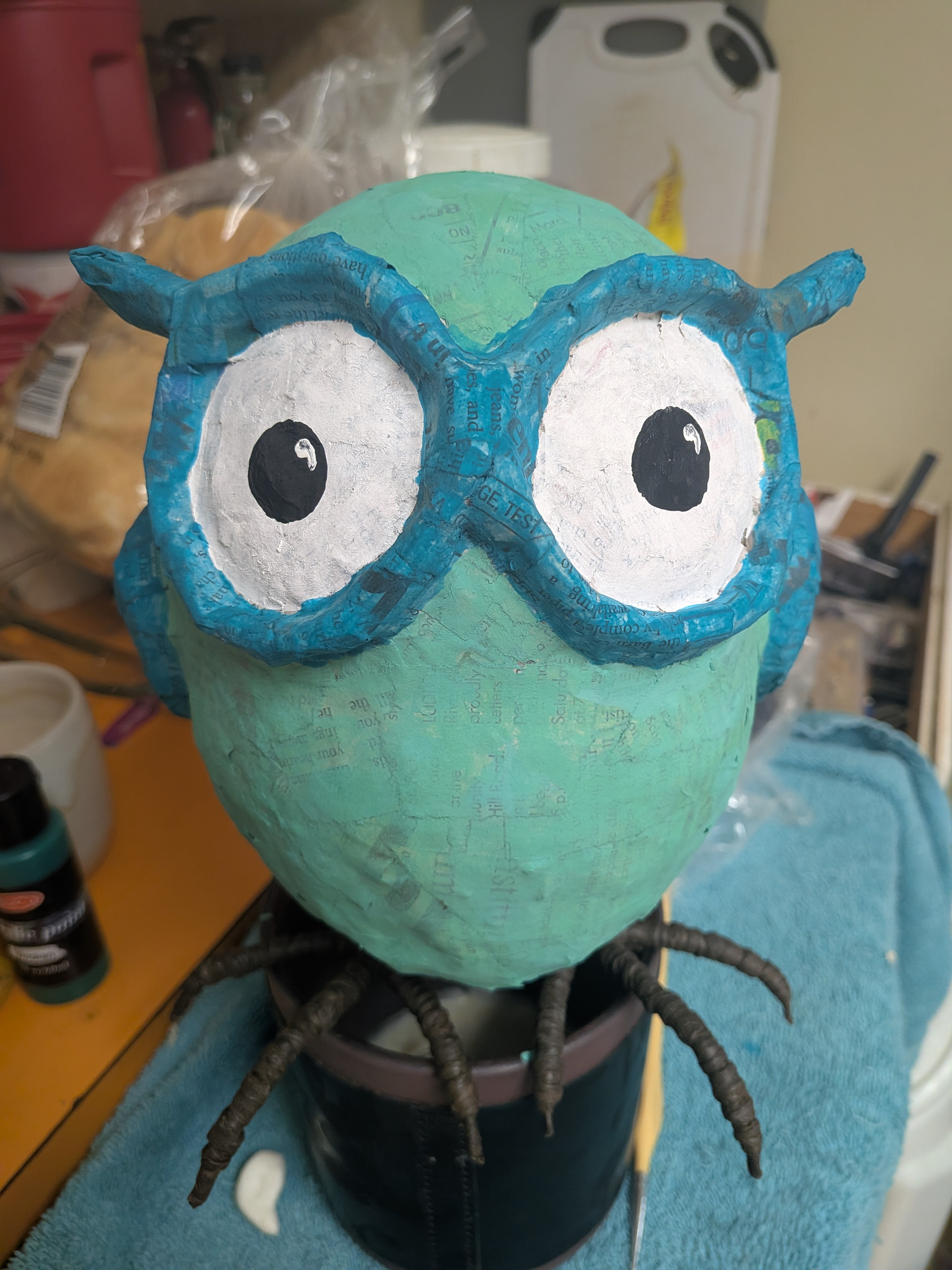 I joined the sculpture swap with a pretty loose idea that I wanted to make something playful and a little over-the-top, and I ended up going with paper mache for the build. The structure itself was actually the straightforward part. I used the traditional balloon base layered with newspaper strips. I went with watered down glue though and not flour because it’s really wet here in New England right now, and I was worried about mold. The legs are wire wrapped in floral tape, brushed with black acrylic and Mod Podge, and the beak is paper clay built up over wire. The form came together pretty easily.