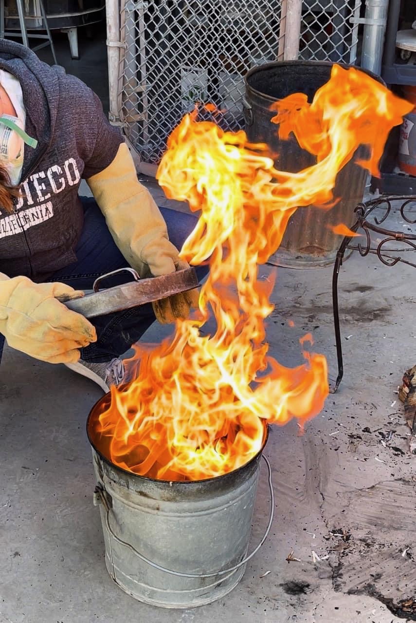 With traditional firings, you’d wait for the kiln to completely cool before accessing your pottery. For raku, we need to get the pieces while they are still at full temperature, so they combust the materials in the trash can. So the raku kiln has a pulley mechanism directly above it, which allows the lid to raise up and reveal the pieces. It makes it easier to grab them with the tongs and not meet our demise. ![]()