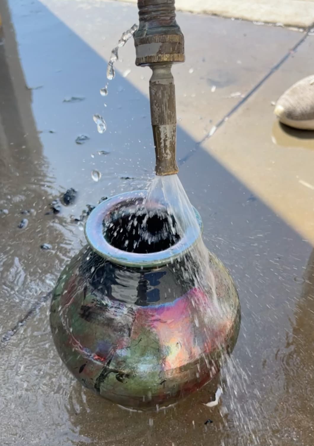 After the piece has reduced, we remove it with tongs once again (it’s still extremely hot) and rinse it. Then we scrub and polish it to remove any remaining ash, soot, etc. This step really reveals the shimmer and shine of the glazes.