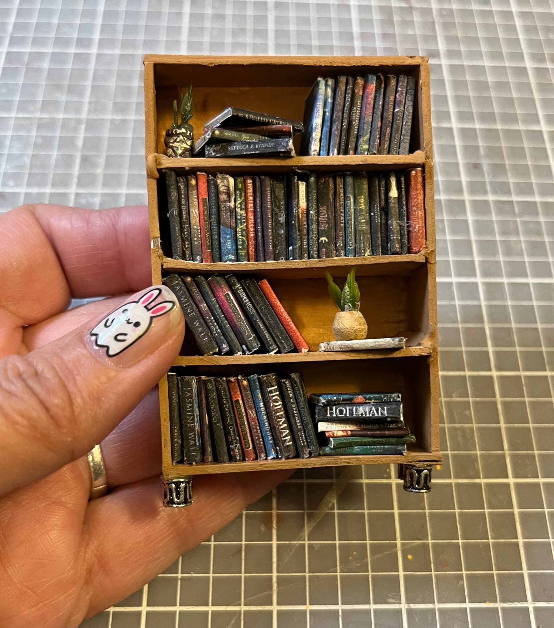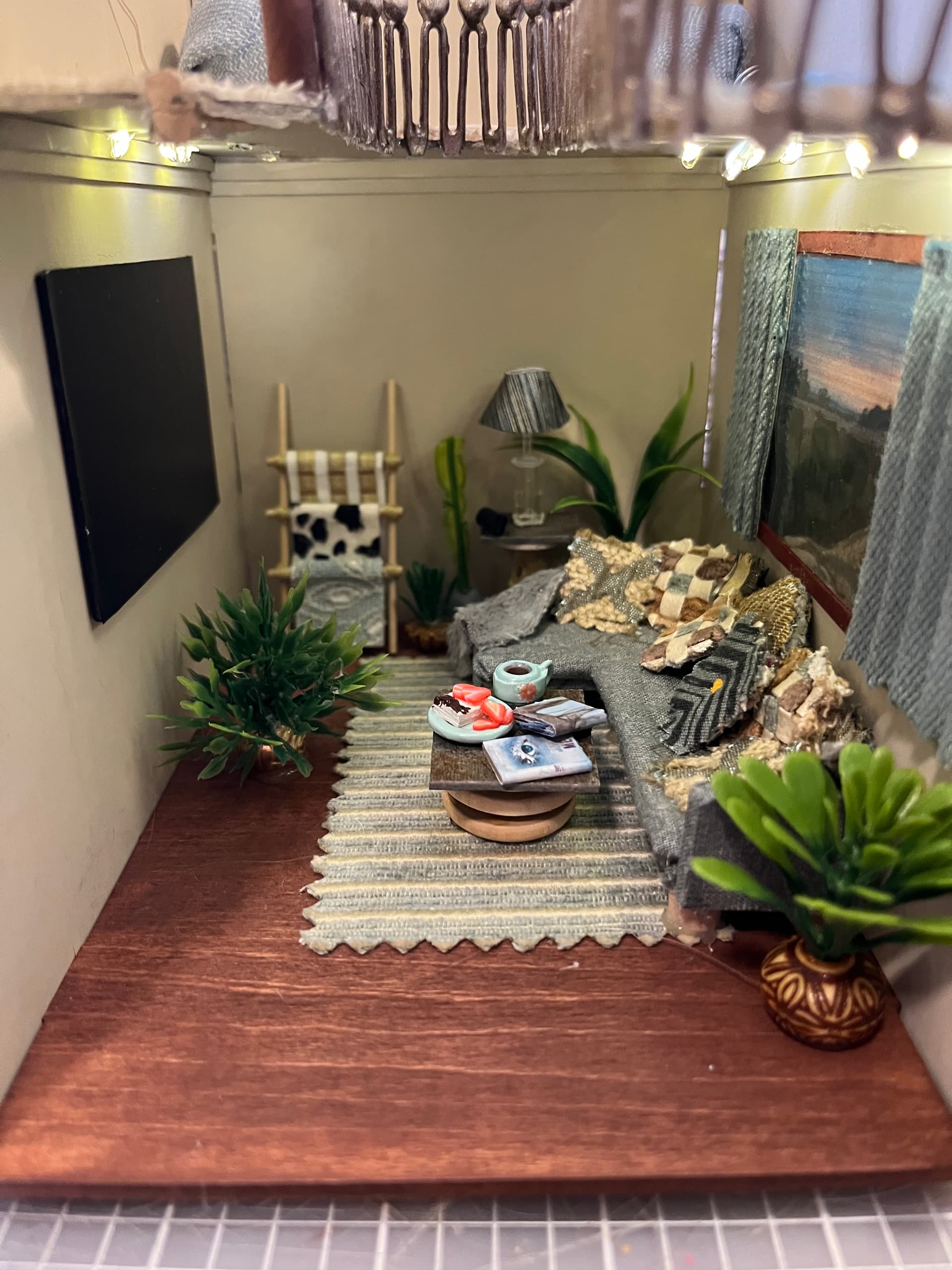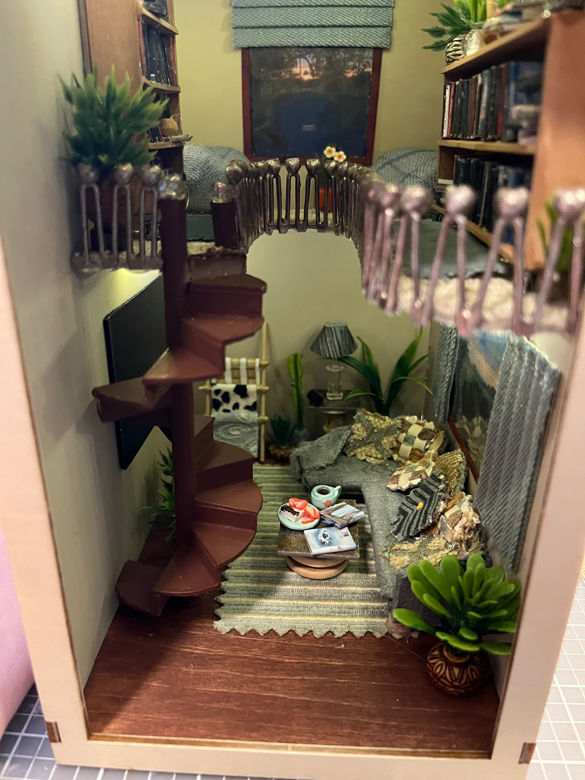 The tiny plants and books are killing me!!! So many details…feet on the bookcase, wooden floors, lights…what a delightful scene. This is such a unique gift. Does she have other miniatures from you?