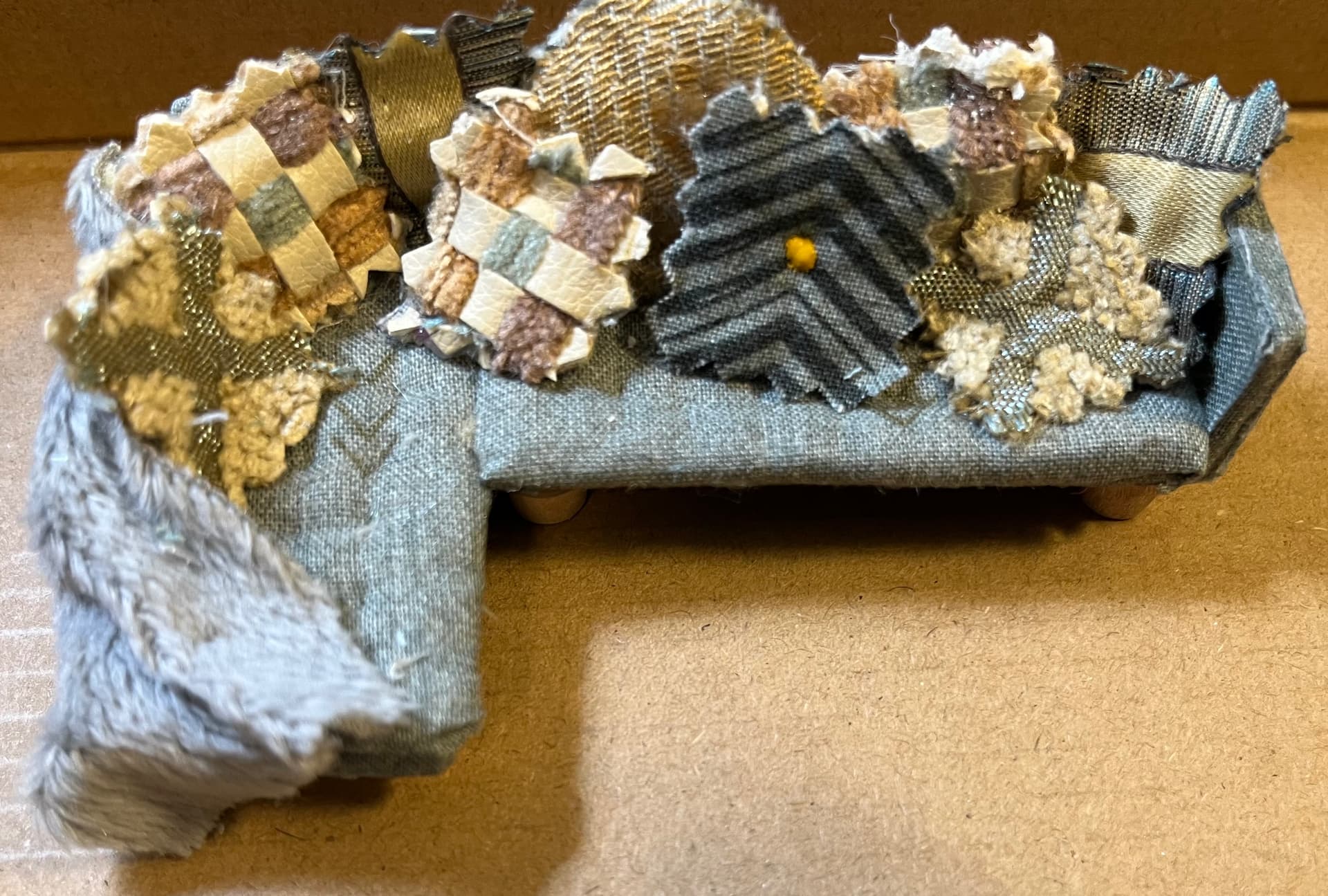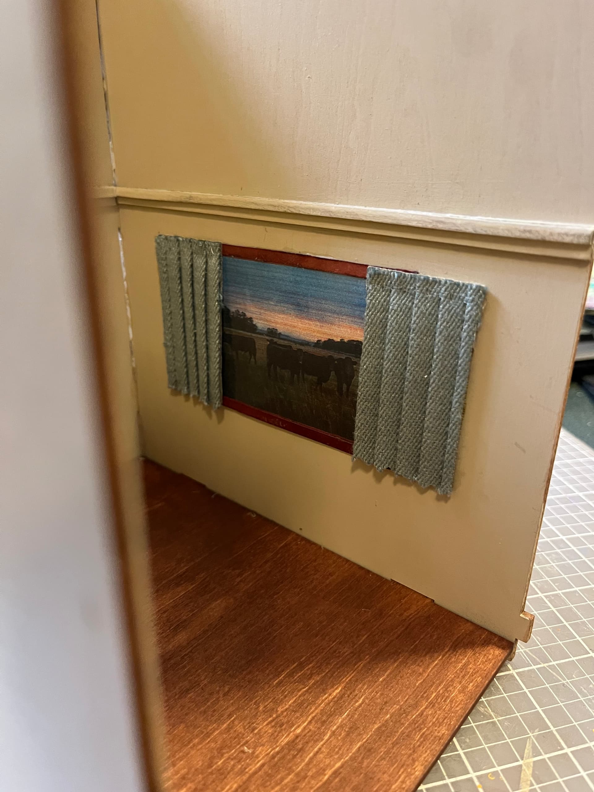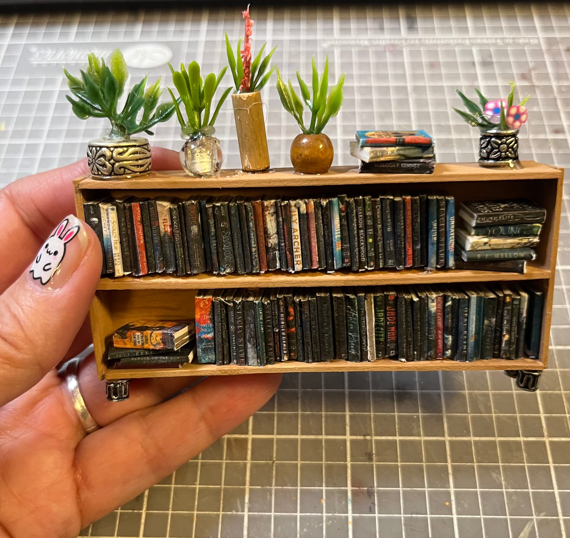 The tiny plants and books are killing me!!! So many details…feet on the bookcase, wooden floors, lights…what a delightful scene. This is such a unique gift. Does she have other miniatures from you?