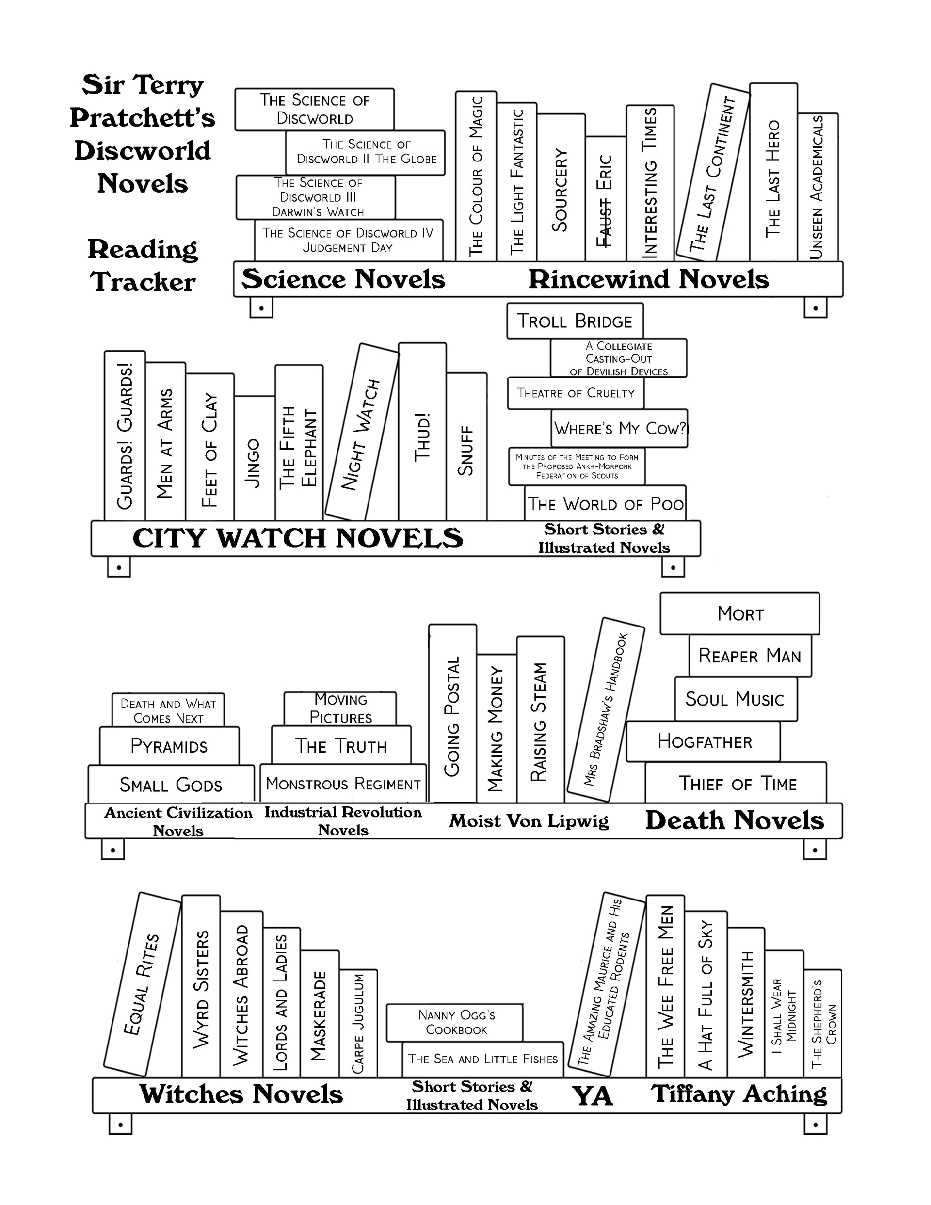 I love Terry Pratchett’s books, and I have read many (but not all) of them. There are a lot of Discworld novels, with a lot of sub categories, and I found myself wanting a way to keep track of which ones I have read. Especially since I often go rogue and read them completely out of order, choosing either what is in at the library at the moment, or whatever story sound most appealing. I made this reading tracker to accomplish that. I am going to color in the books as I read them. They are on the shelves in the “recommended reading order” for each sub-section, and are grouped by theme or character. I did not include his non-Discworld novels, because I know I have read them all and there wasn’t room on the page. (Edited to replace image because I realized the font for the Death Novels was the category font instead of the book title font, so I fixed it.)