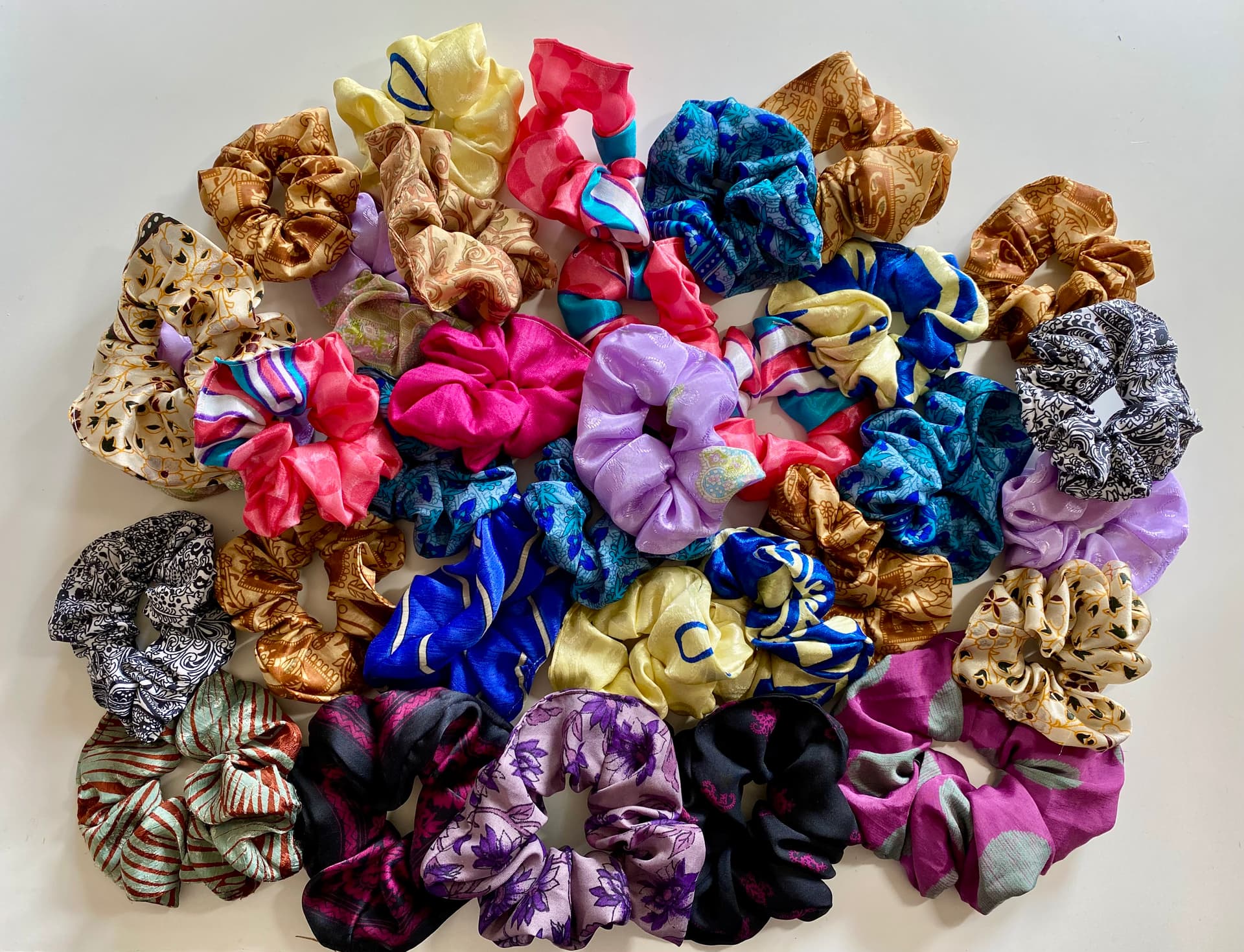 I finished my To Do List item: “Finish stack of silk scrunchies”. Huzzah! I have 35 scrunchies, most of which will go in my gift cupboard, plus I’ve stash busted fabric bits that would otherwise end up in a landfill.