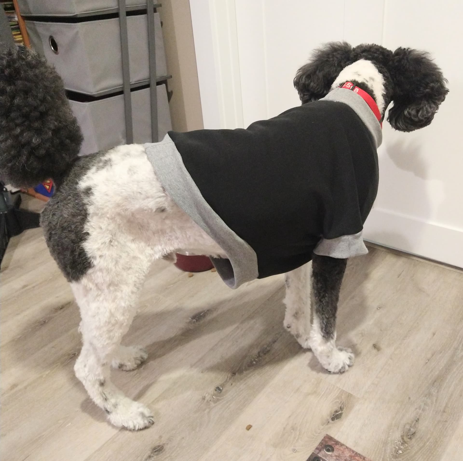 Brief Description: I figured out this year, after he had to have surgery, that my pup actually likes wearing clothes. He always appreciated a jacket or cowl for cold weather potty breaks, but he genuinely likes a comfy shirt, too. So, I modified the pattern I used to make him some post-op tees to make a cozy sweatshirt. It took less than an hour, so I will definitely make more for him.