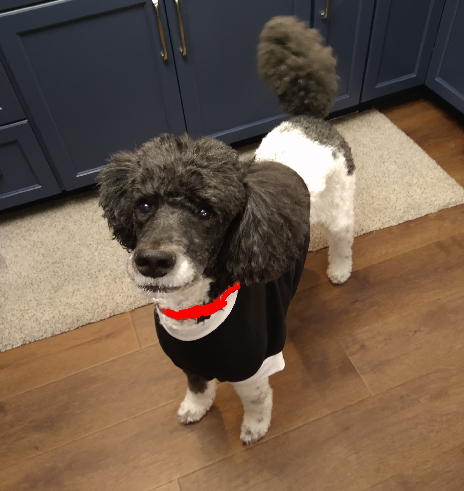 Brief Description: We found out this year that our pup doesn’t just like a jacket when going outside, he likes a cozy tee or sweatshirt all the time. So, I whipped up a couple heavier shirts for his birthday, one in black with white cuffs and one grey and white.