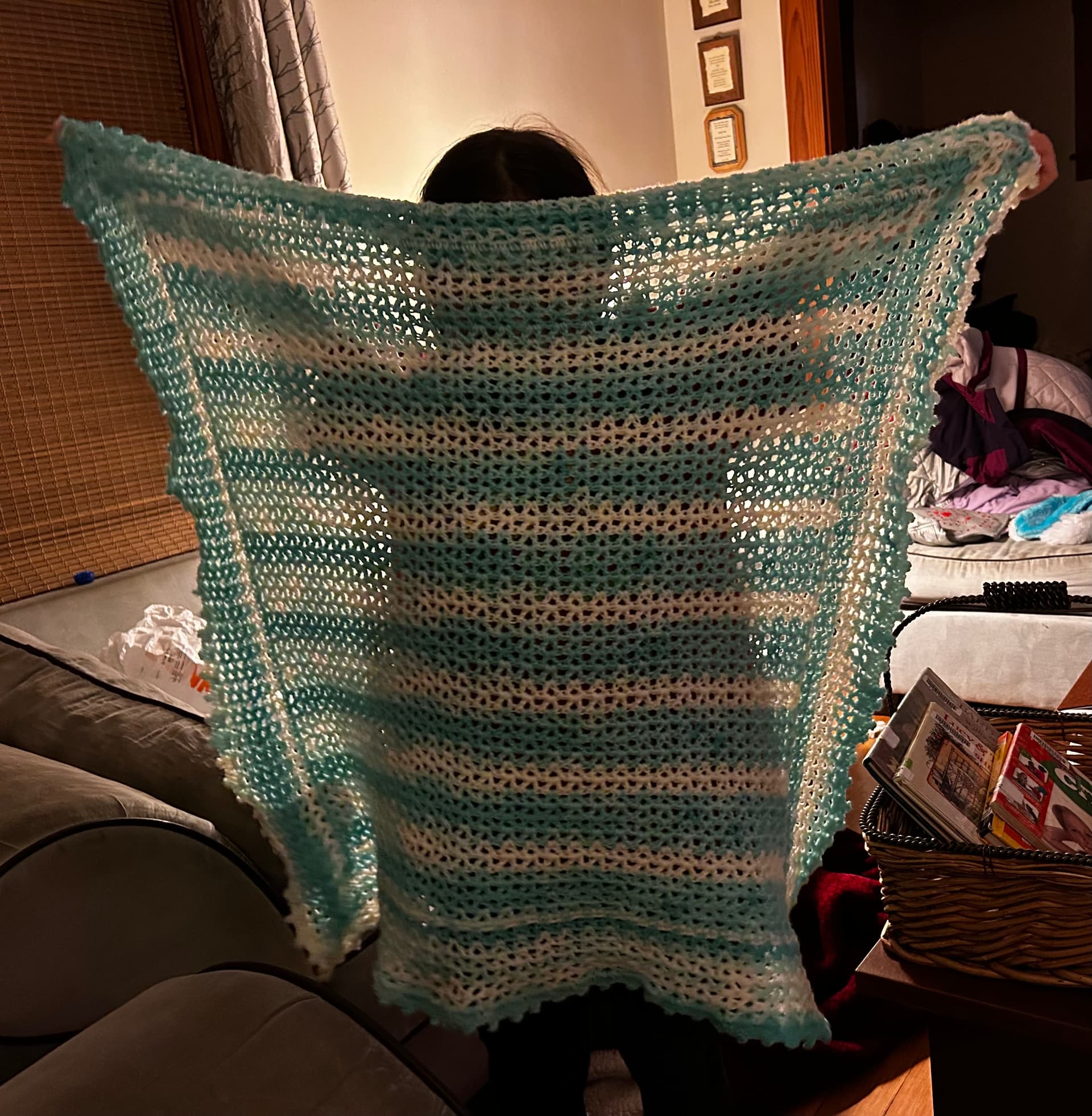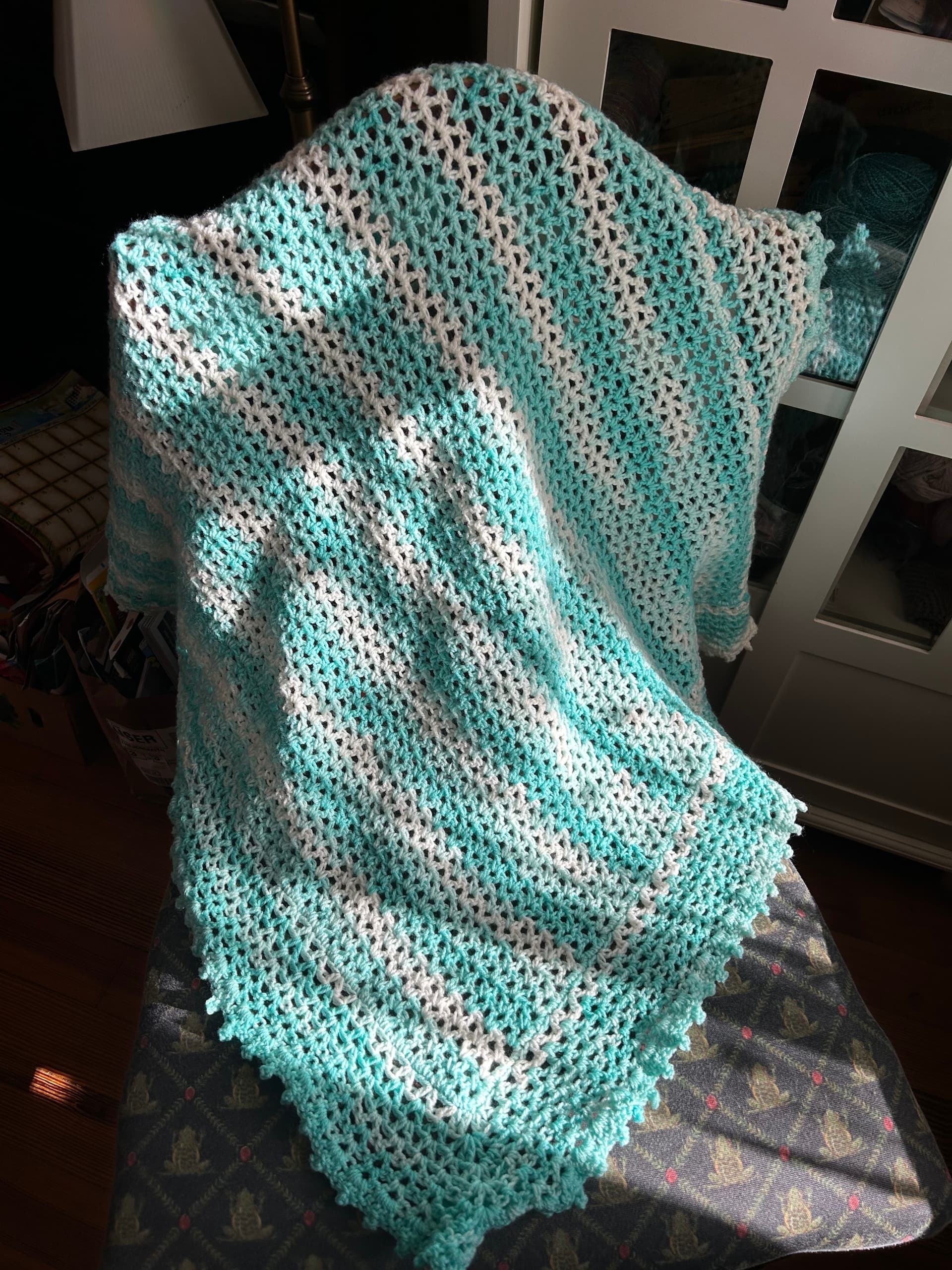 Brief Description: Not being skilled in charms and thus unable to work the undetectable extension charm, I am working on keeping my yarn stash appropriate to the assigned cabinet. This yarn was supposed to be returned when I opted for a different color way for the August baby gift buuuut⌠I mean, do we ever actually return perfectly good yarns? This is a baby blanket that will be either donated or held for the next arrival in the friend or family circles.