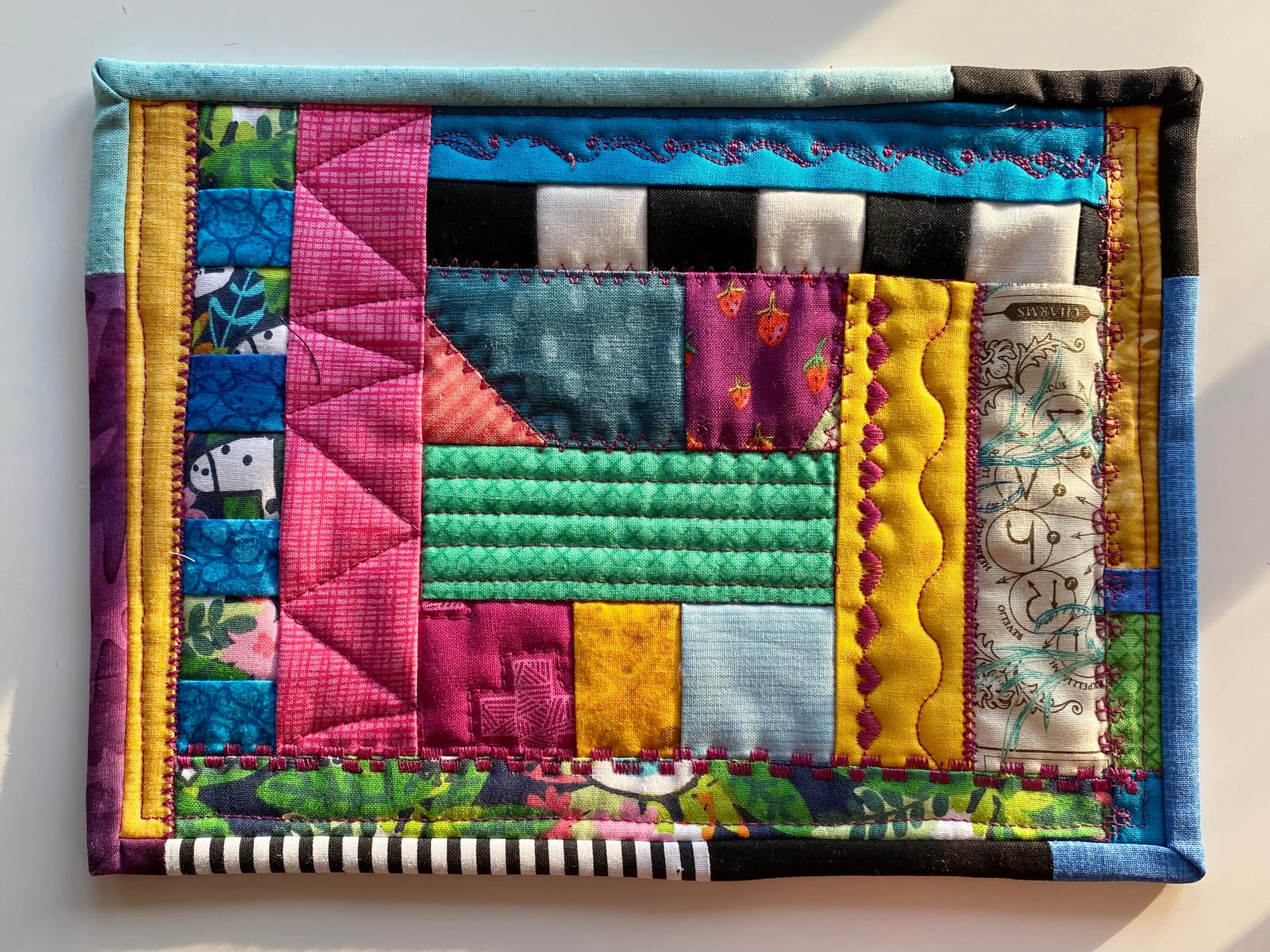 I started this mug rug ages ago, when I made some scrappy crump pieced potholders. This chunk just wasnât quite big enough to be another potholder, so I layered the quilt sandwich, and put it aside with a few binding scraps, but then never finished it. I used some decorative stitches on my machine to quilt it last weekend, then bound it yesterday.