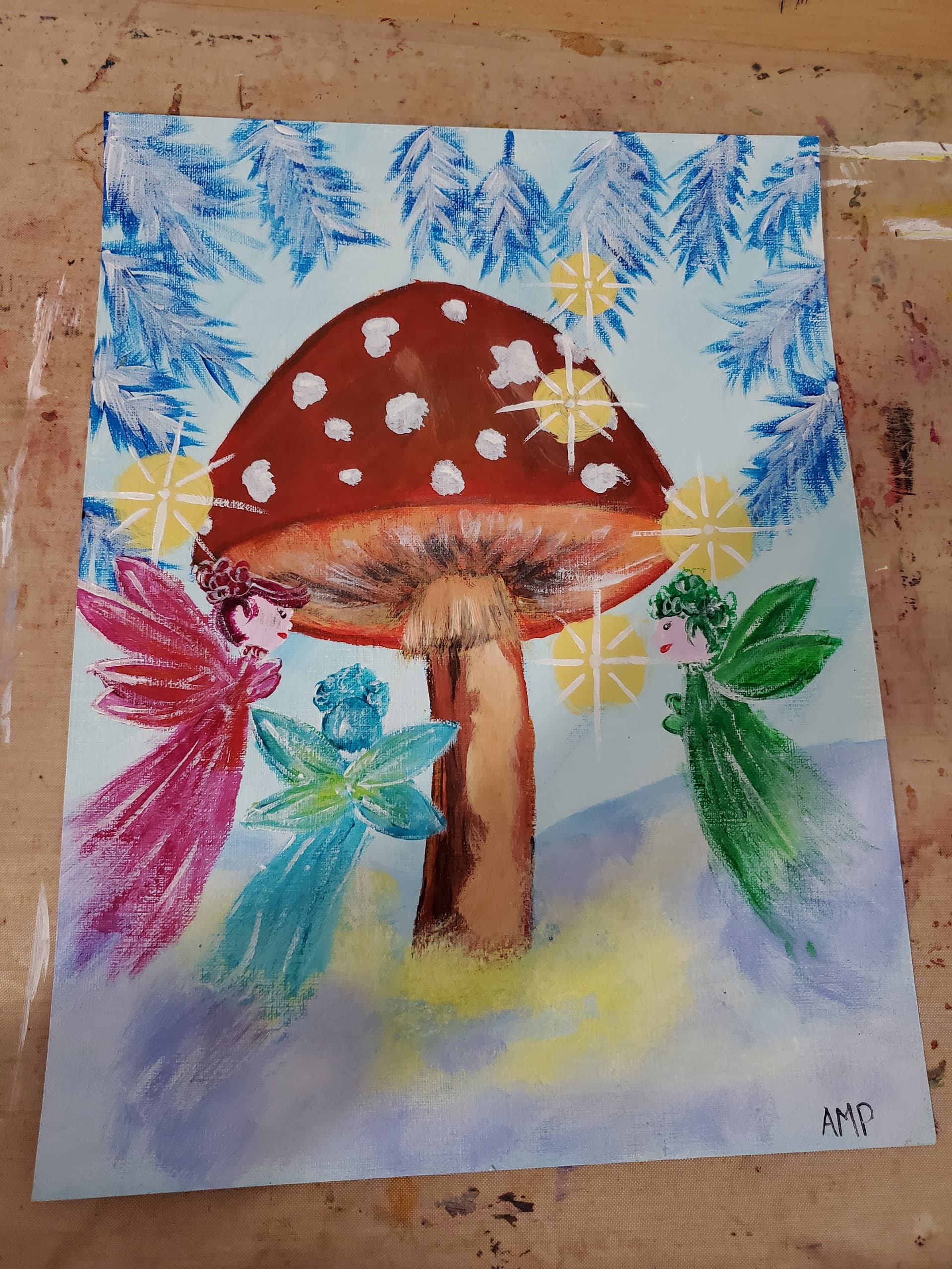 I bought a huge tub of air dry clay to use on Jim’s wizard staff for Halloween, and wanted to try to use up some more of it before it dries out. So Ada & I had an ornament making day. We used cookie cutters, and stamps from my stash to add texture. I painted them with Jacquard Lumiere paints, which have an amazing shimmer to them. Ada went a bit more… free form? with her paint choices.