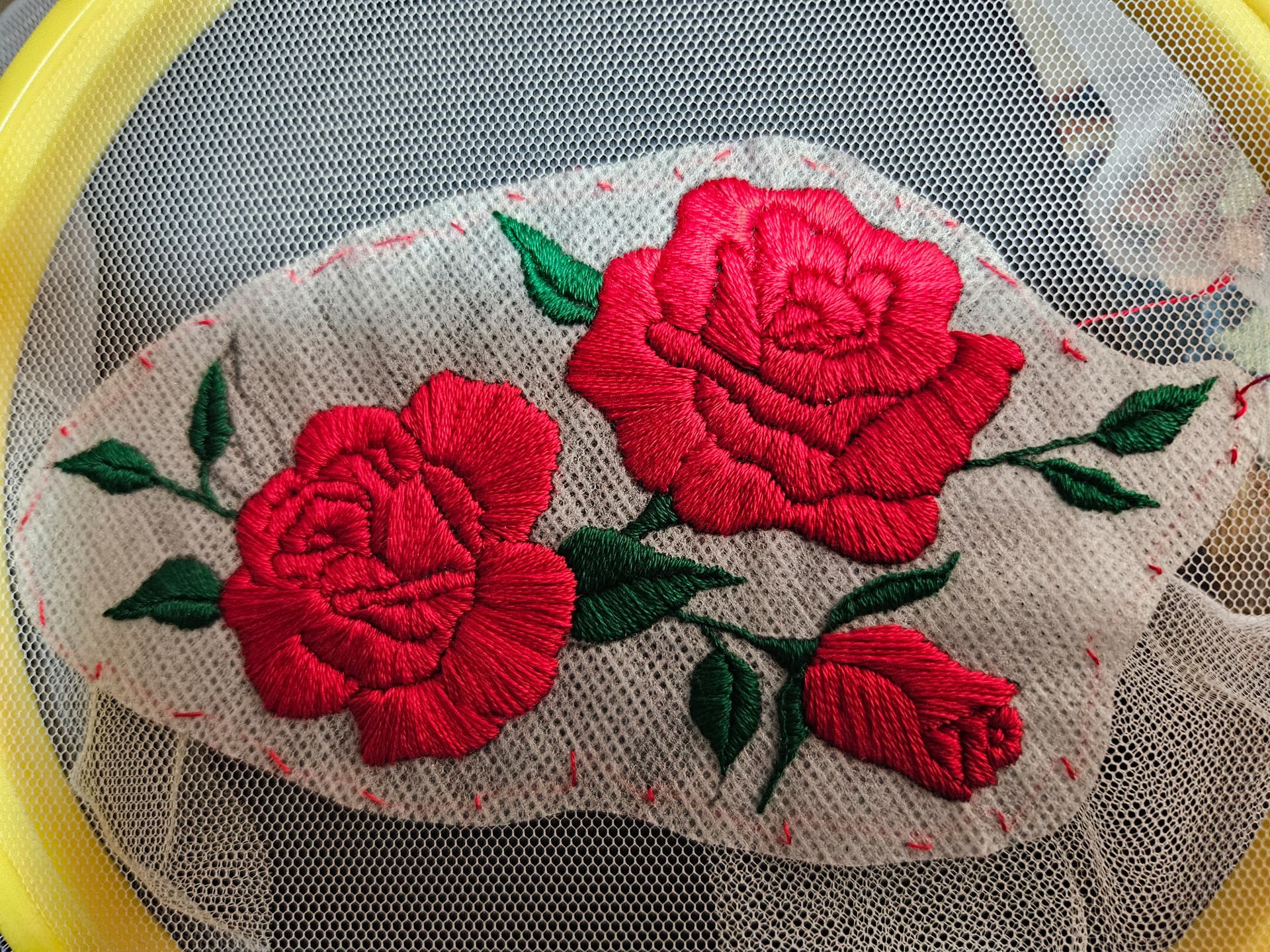I used wash away sticky paper for the pattern, but it didn’t stick great, so I still had to stitch it down. I was terrified to rinse it off, but tada. I’ll try to update this after the wedding (April) with a pic of her in the dress with it on.