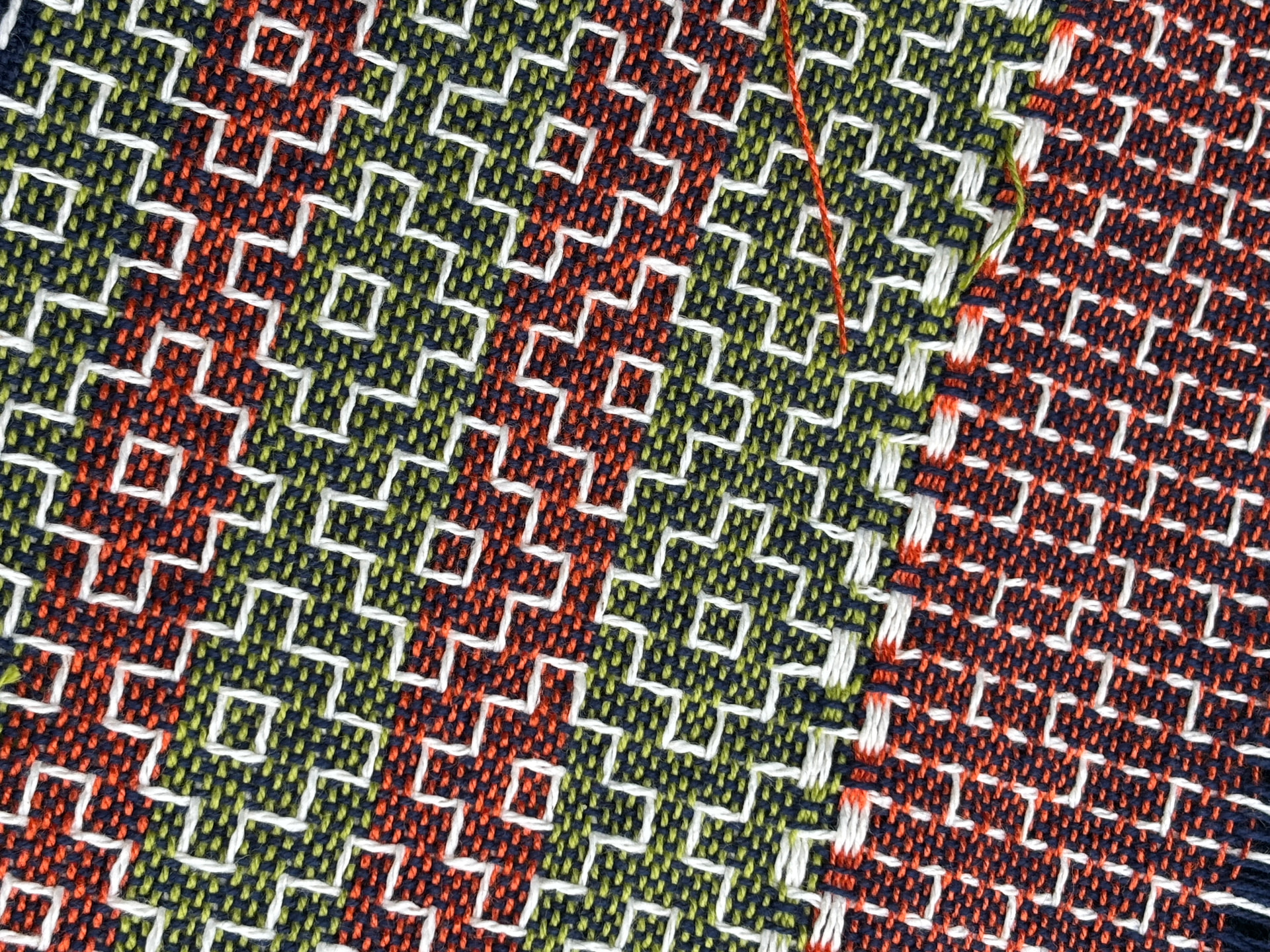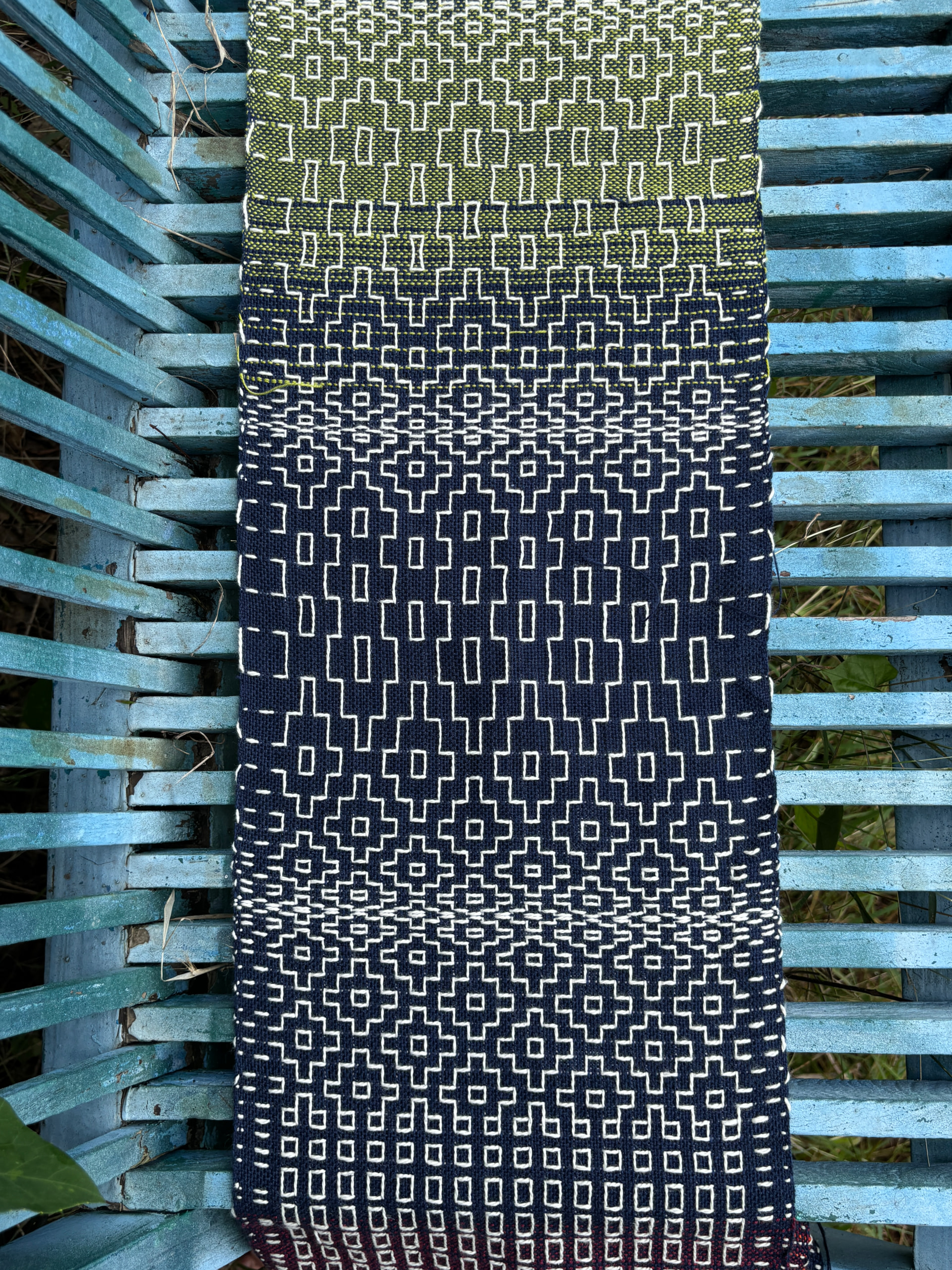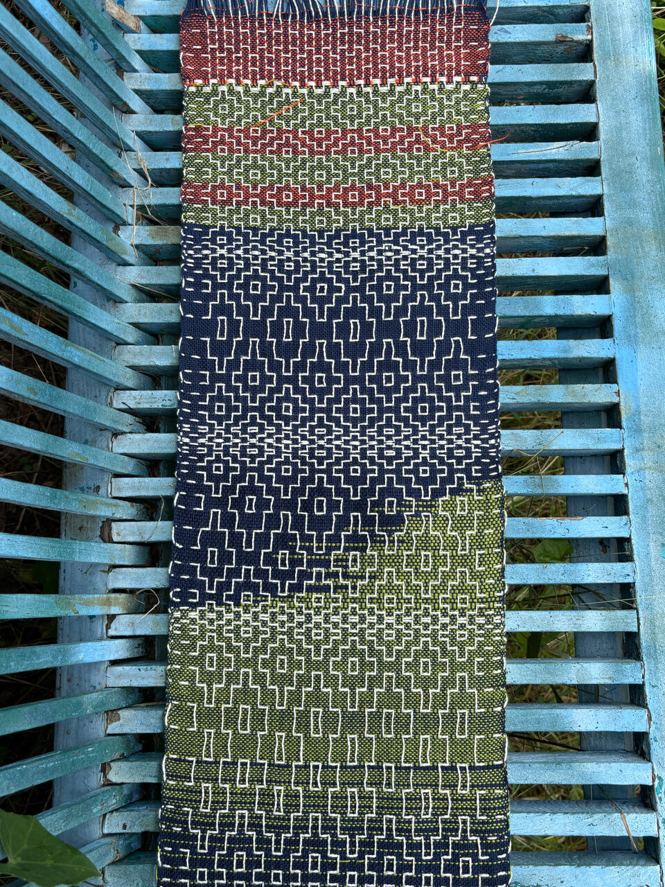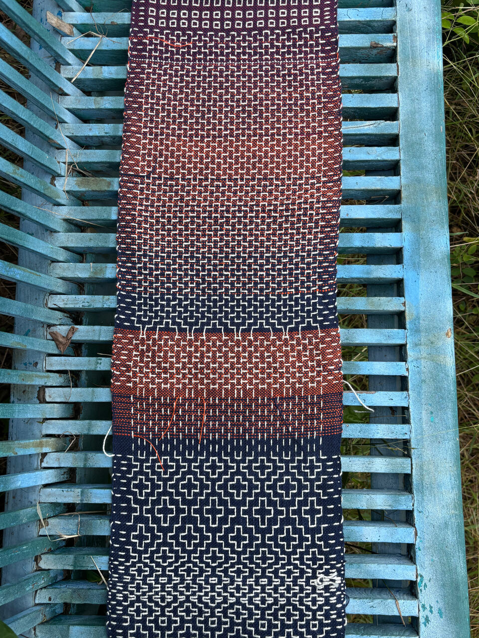 @photojenn the supplemental warp was just wound with the rest of it. Basically, the pattern was a simple 1234 threading but with the thicker white yarn popping in on either shaft 5 or 6 in between every four heddles, and surrounded by 12 on one side and 34 on the other… hopefully that makes sense; I am not a super experienced weaver, and I’d have to double check but I believe there were two 5’s in a row and two 6’s in a row. So the threading was like 1234 5 1212 6 3434 6 1212 5 3434 5 etc.