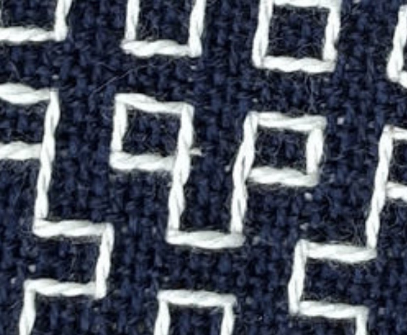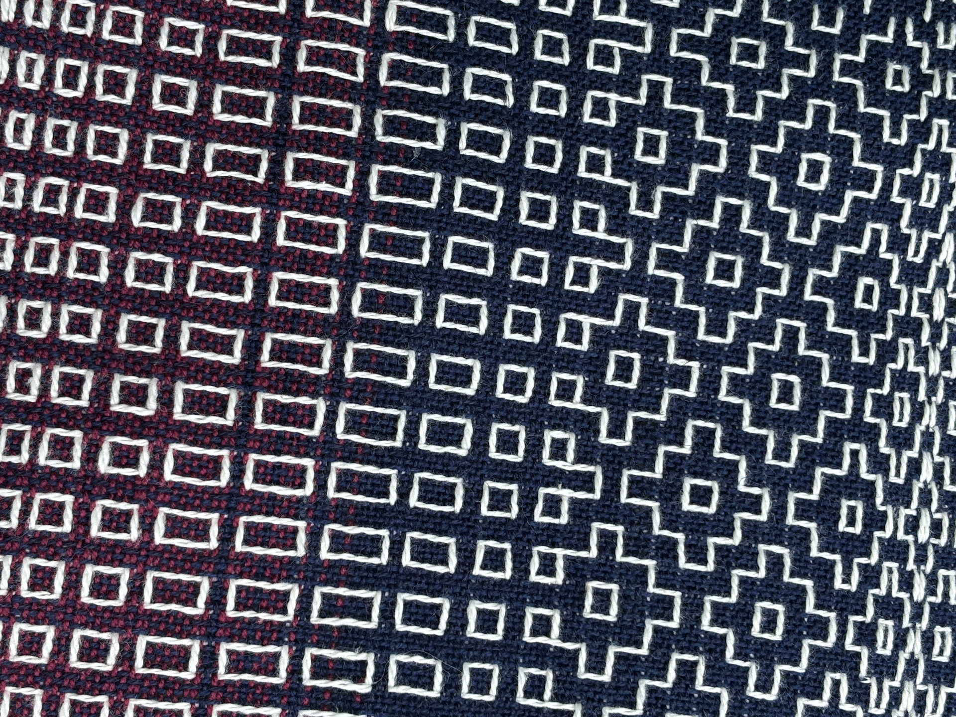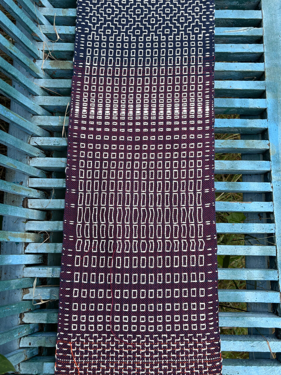 We used (6-shaft) floor looms and her warp pattern to weave a plainweave background base with supplemental warp threading to mimic sashiko embroidery style. It was actually really cool! (and now I think I need a loom with more harnesses )