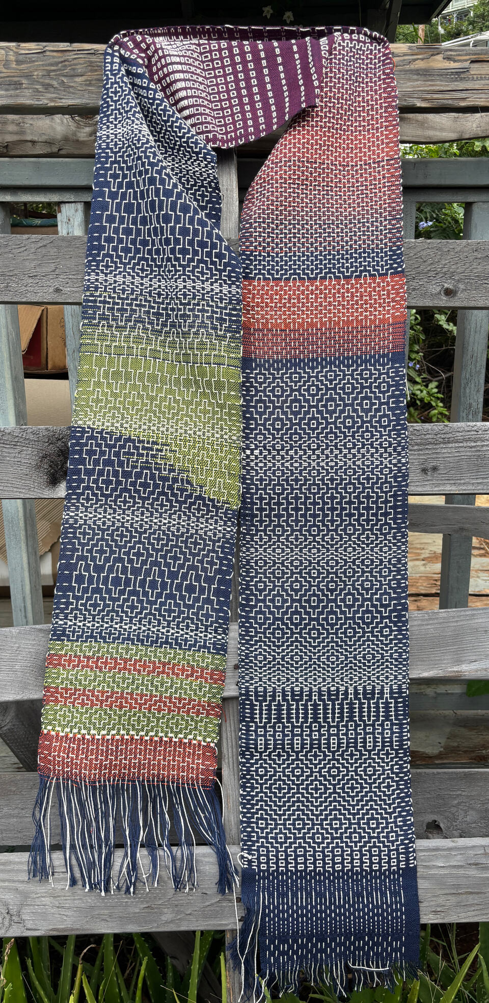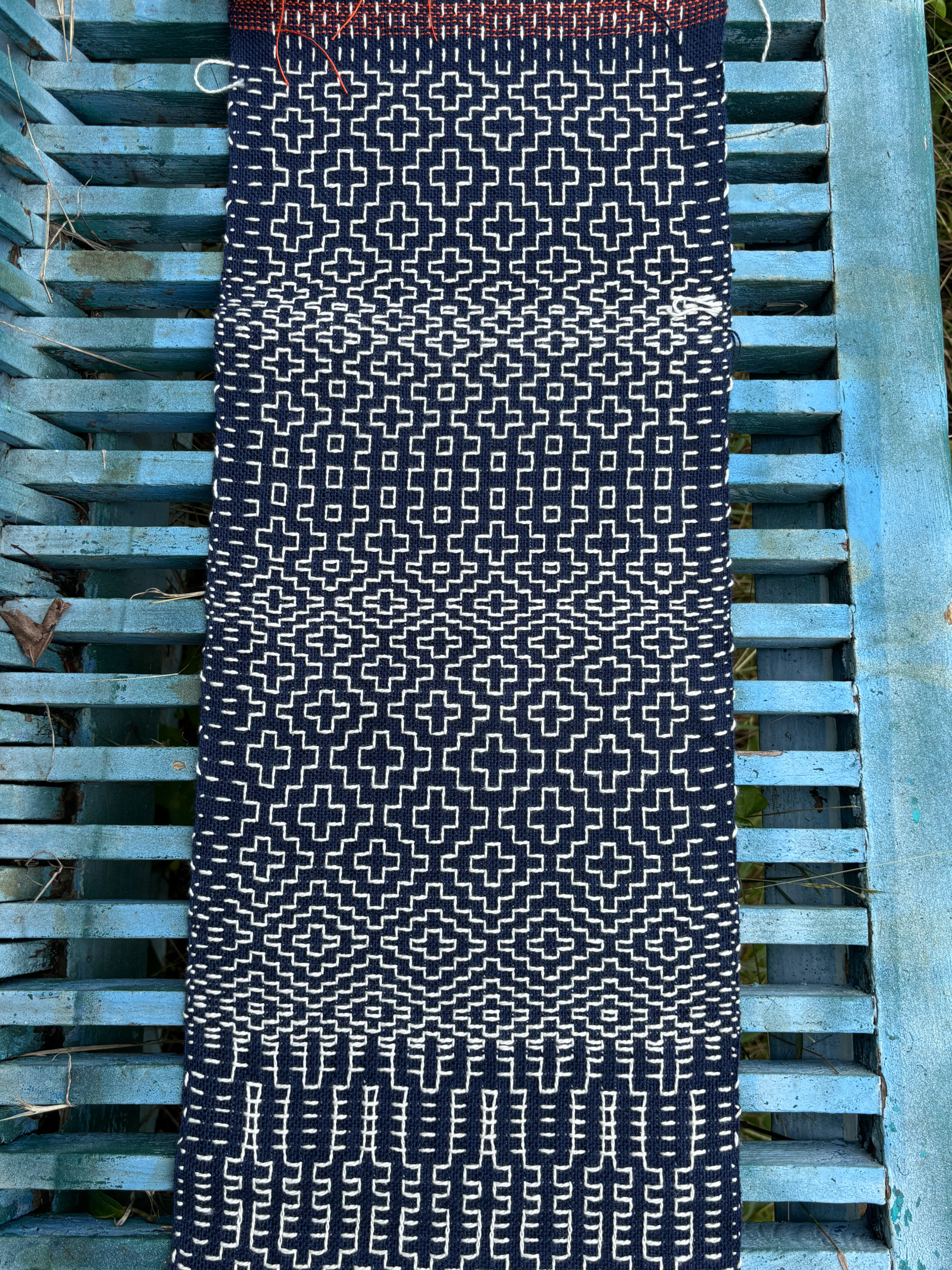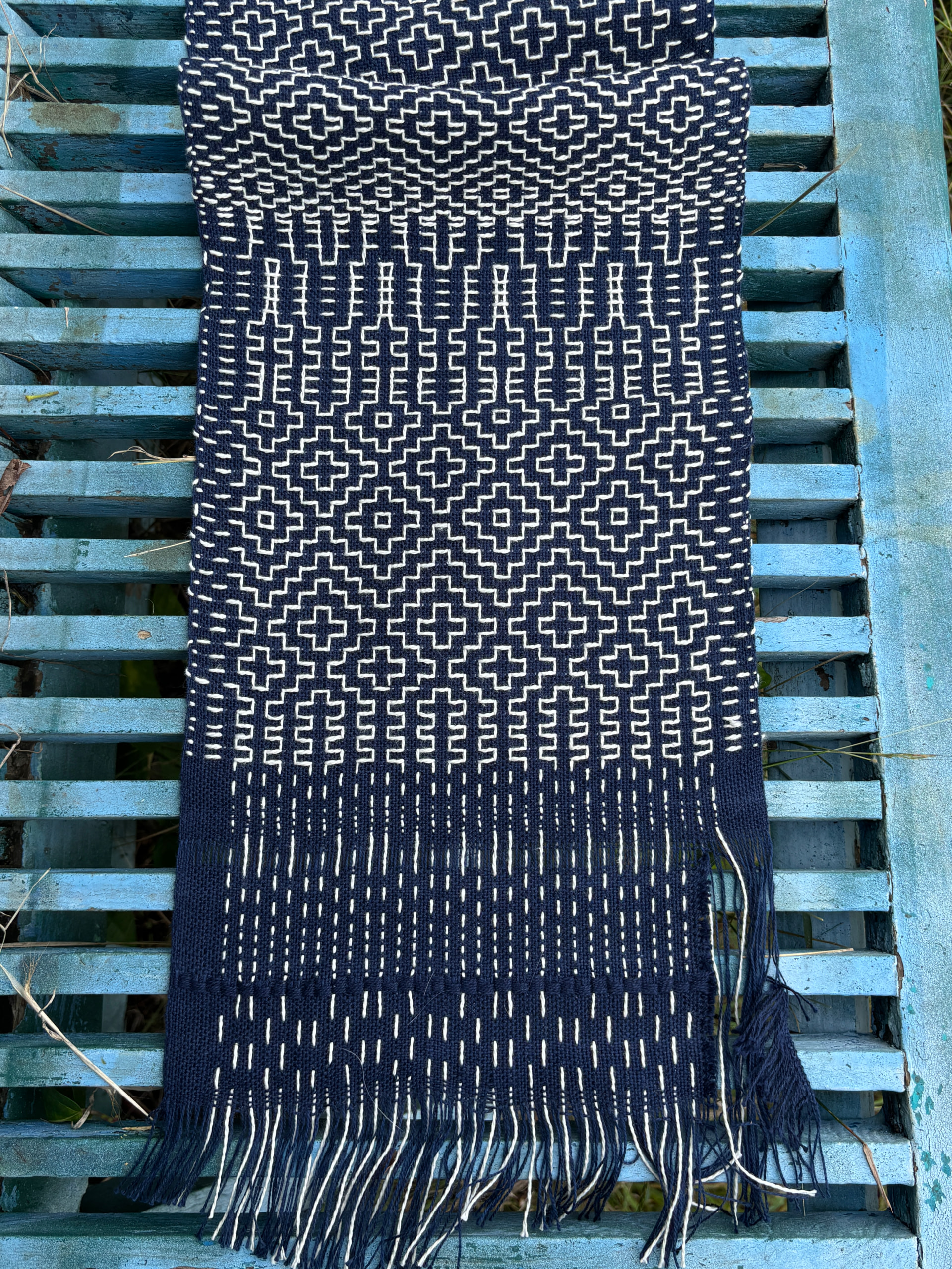 We used (6-shaft) floor looms and her warp pattern to weave a plainweave background base with supplemental warp threading to mimic sashiko embroidery style. It was actually really cool! (and now I think I need a loom with more harnesses )