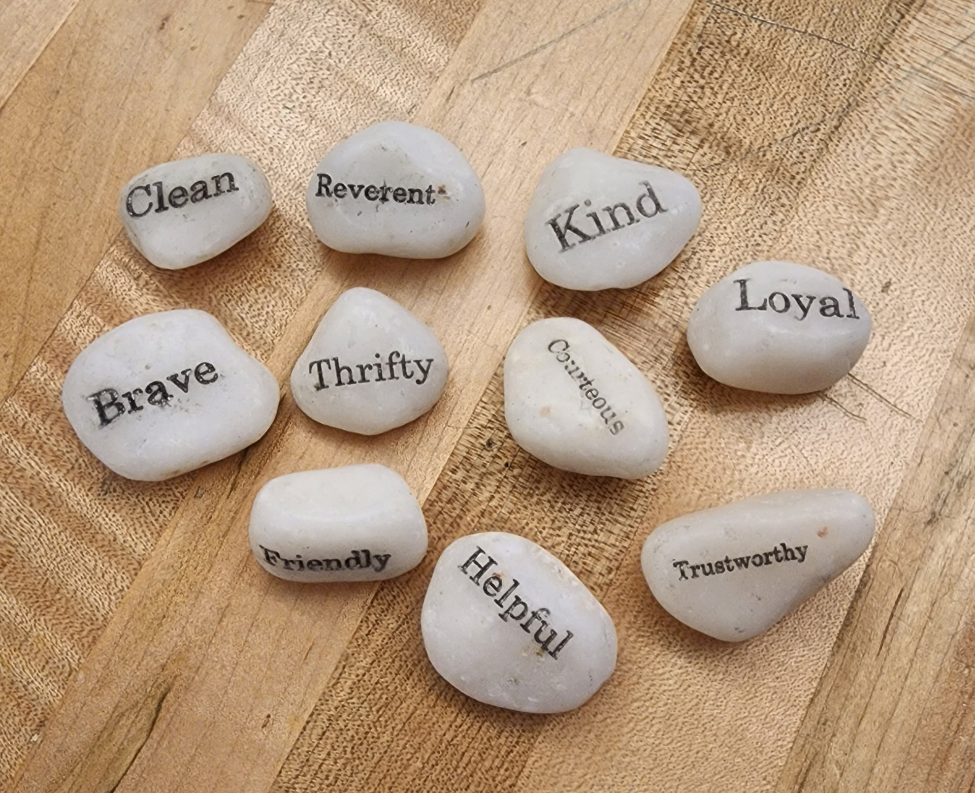 My son recently earned his Eagle rank in scouting, so there is a lot of party planning going on for his Eagle Court of Honor. He wanted some more rustic-style decorations, so I started with rocks with the elements of the Scout Law laser etched into them, then filled with acrylic paint.