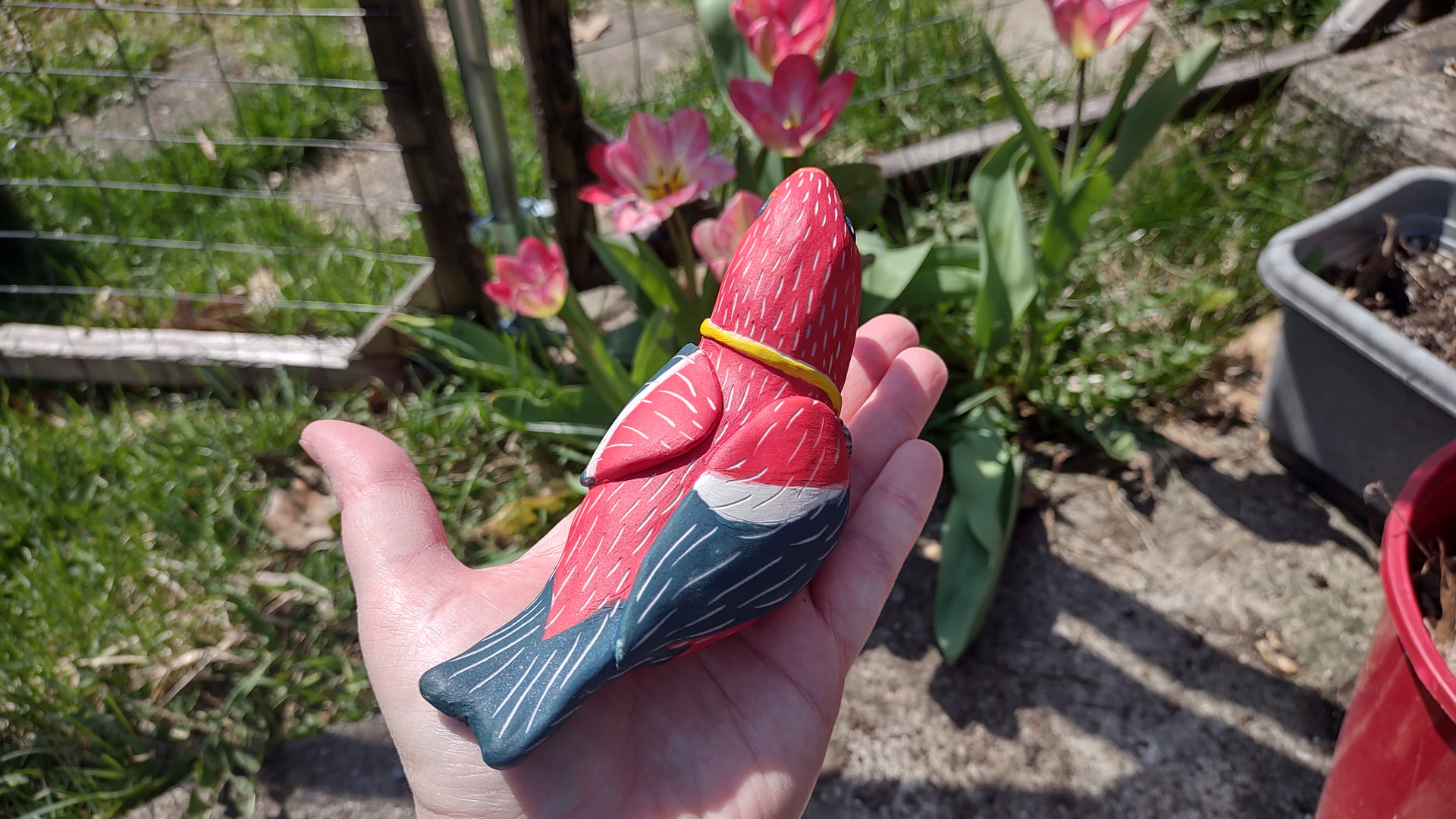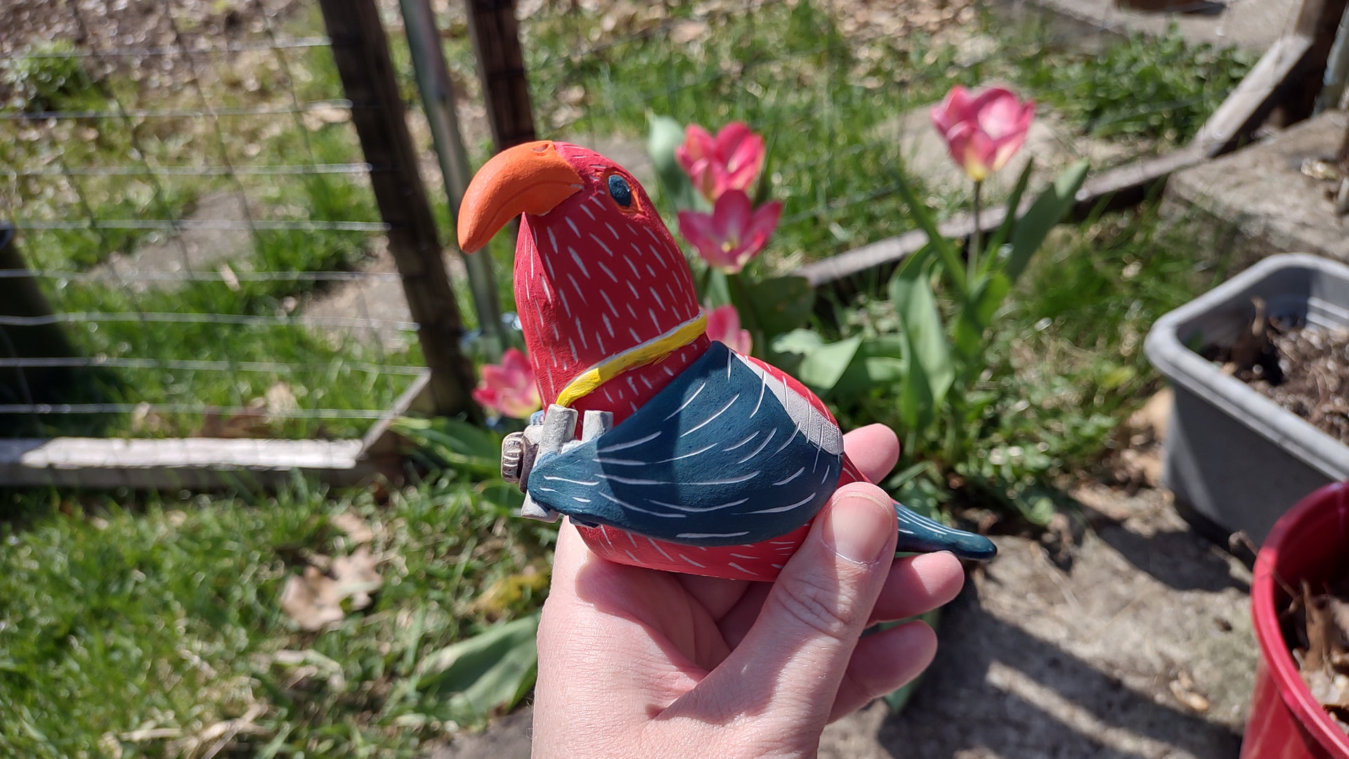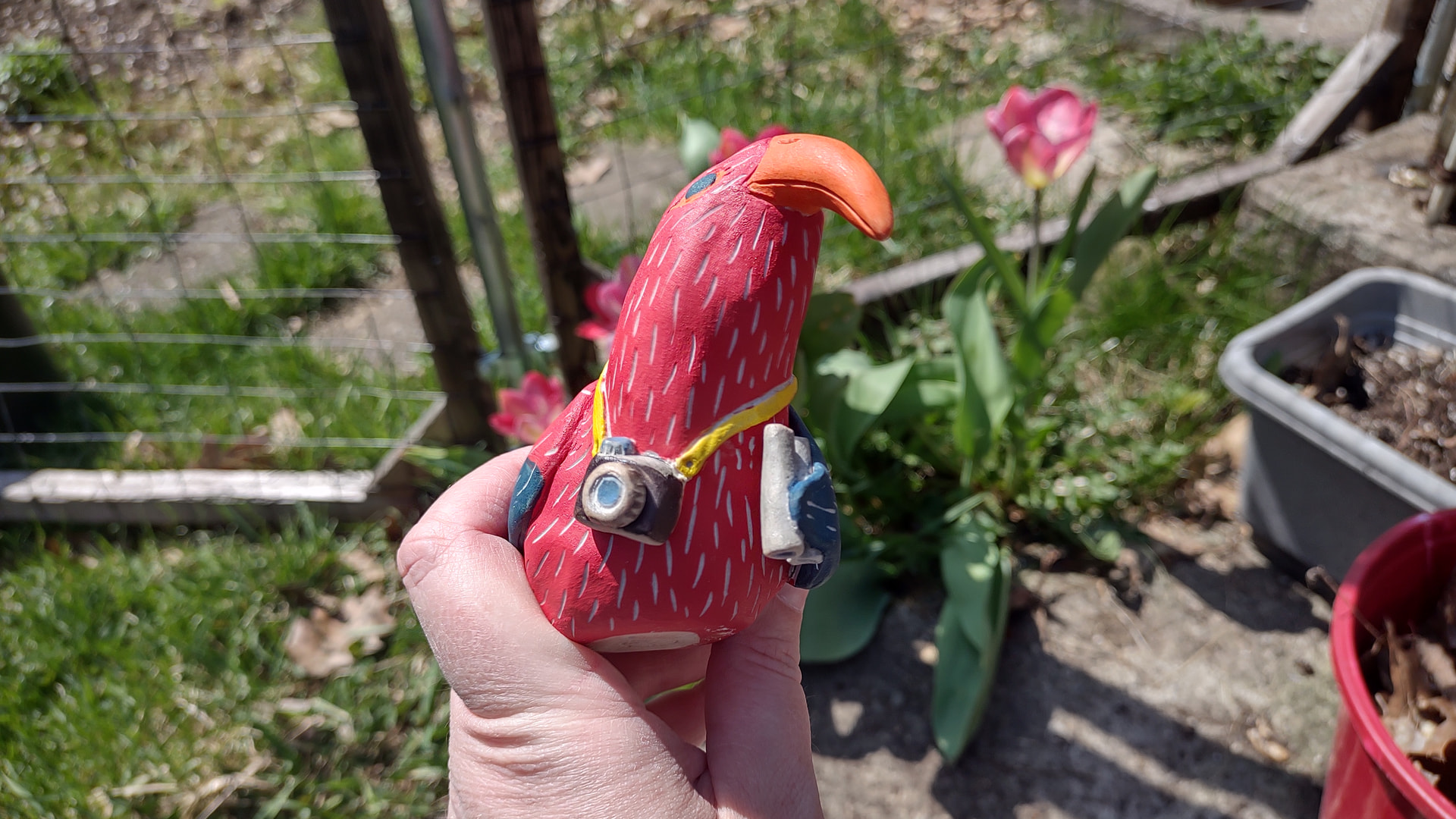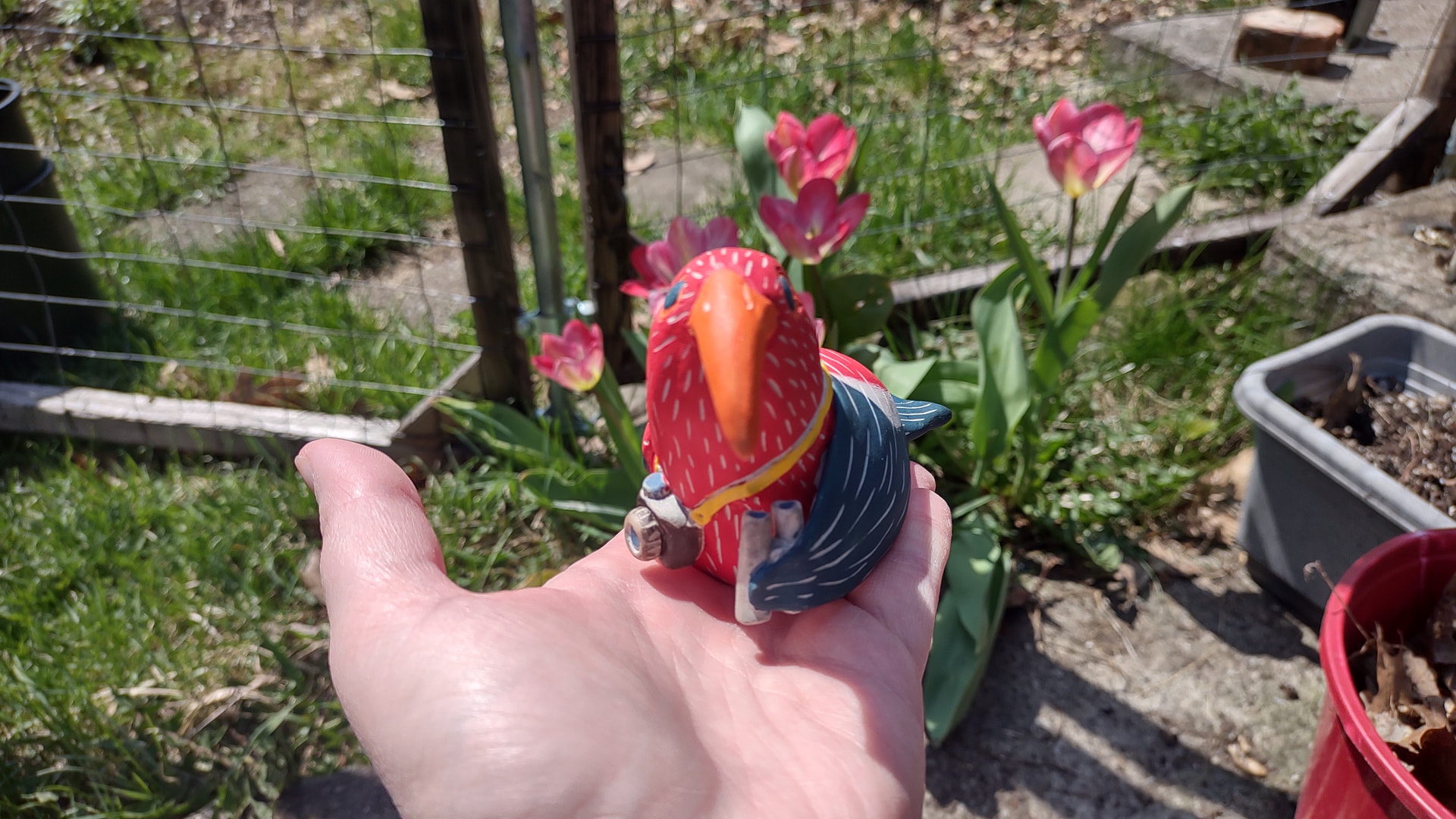 He’s a porcelain Hawaiian 'i’iwi, with his camera and binoculars, and he rattles! But that’s not all! He has a HAT!