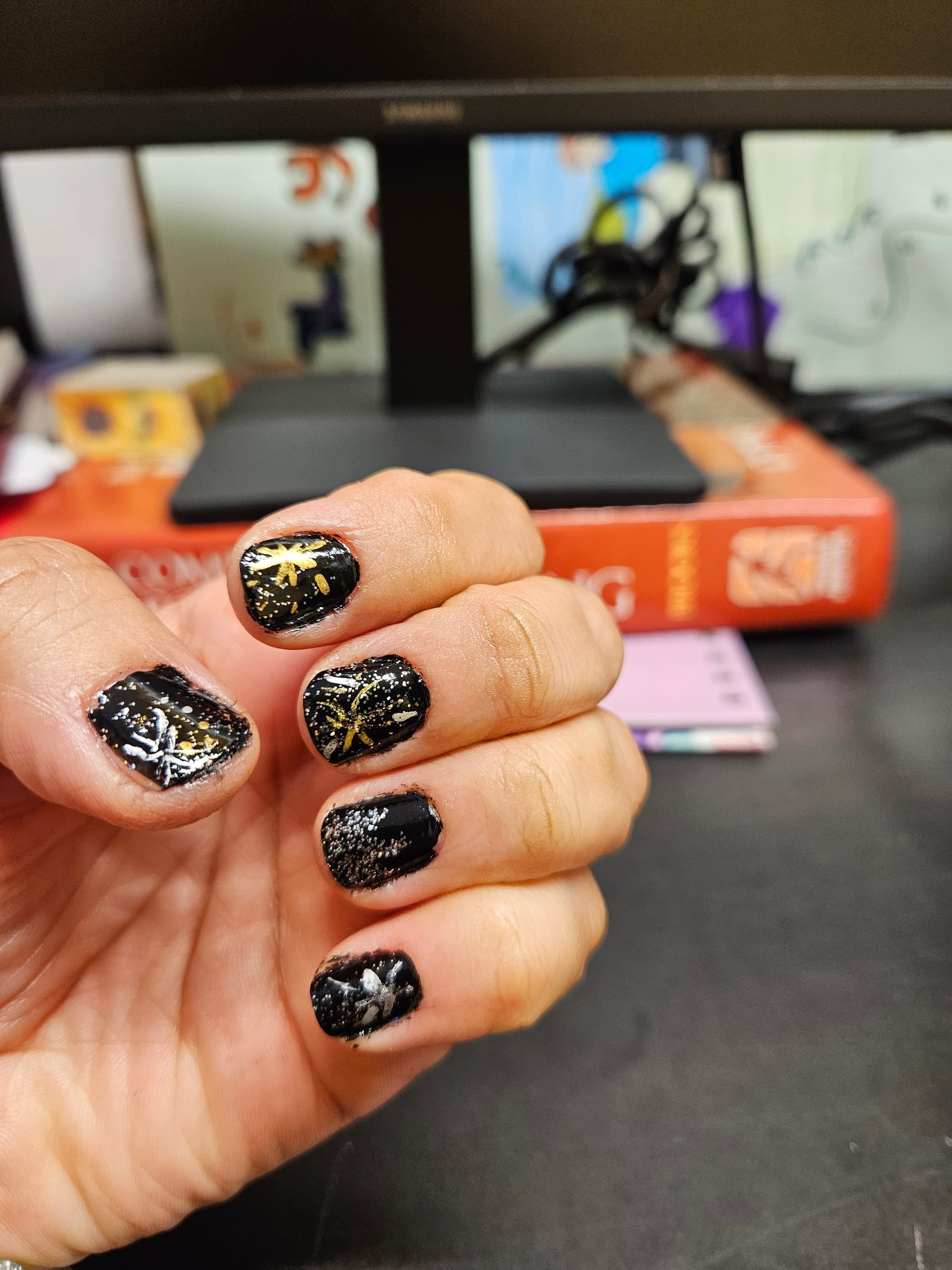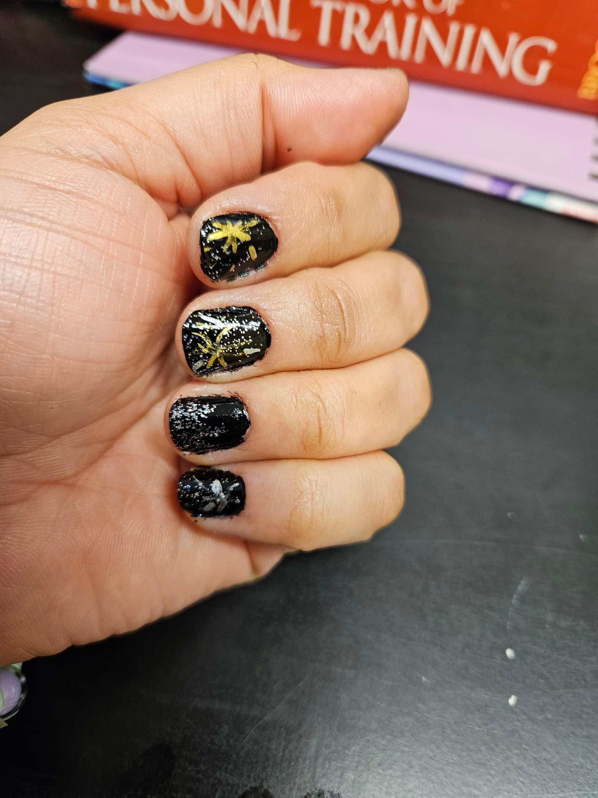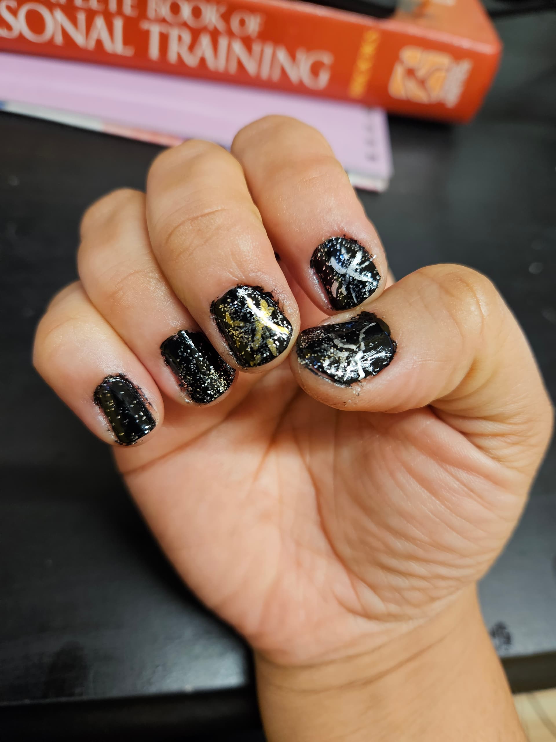 Nail polish, nail markers, top coat, and nail strengthener under it all. Copious amounts of cuticle oil multiple times a day…
