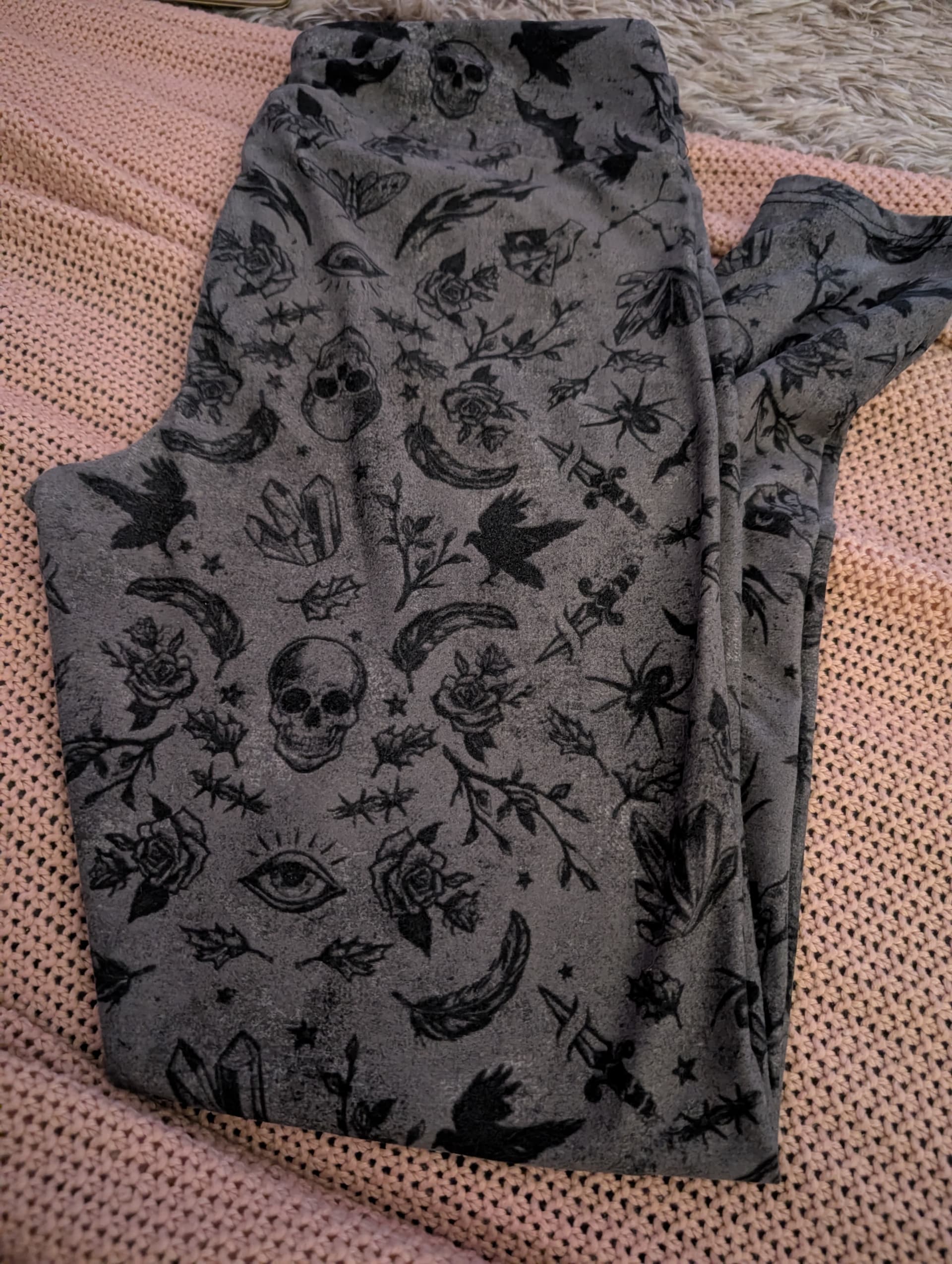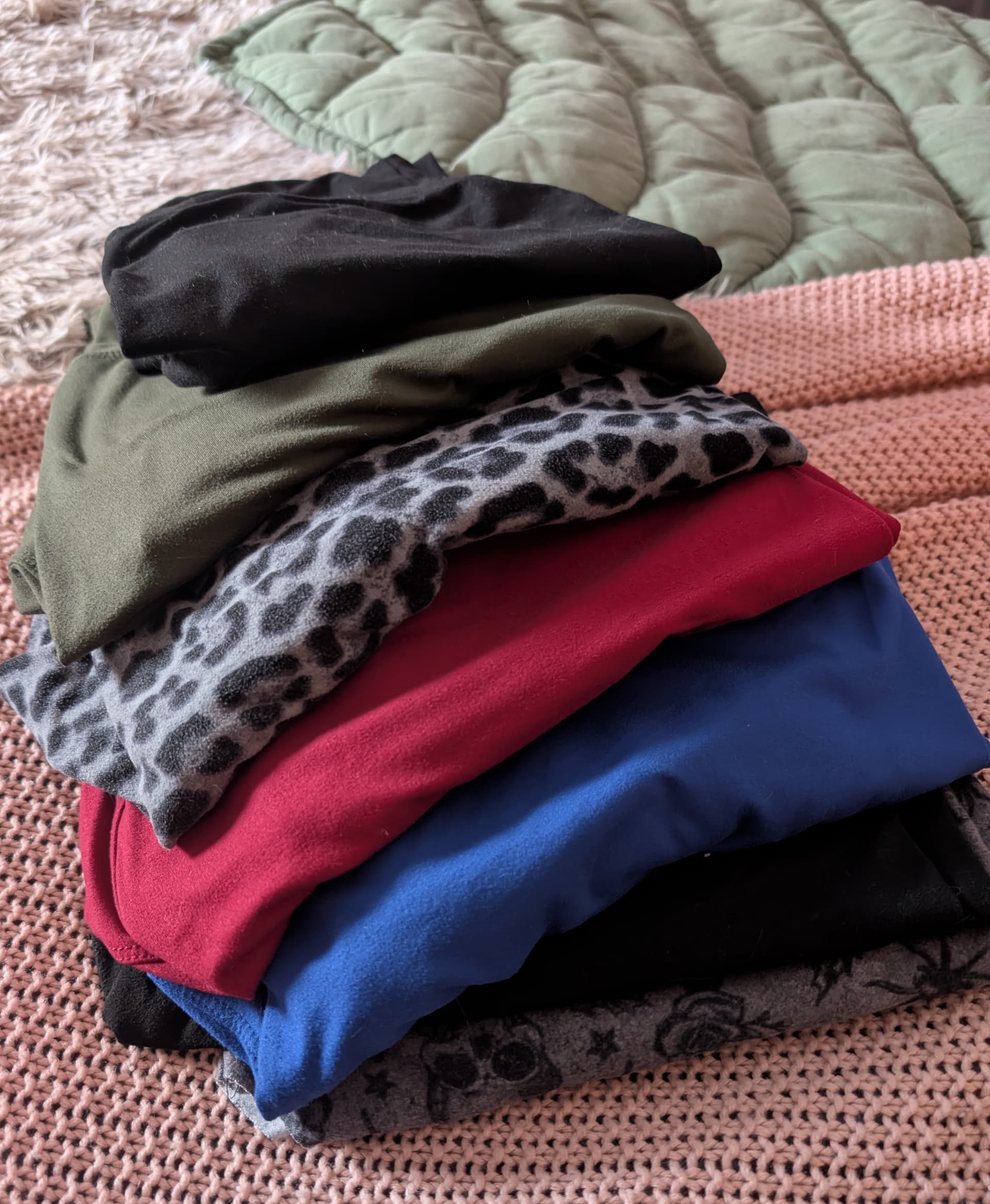 I’ve got a stack of cheap leggings I’m thinking I might chop up. I browsed Pinterest for ideas, and I’m leaning towards mini skirts, since they seem pretty simple. The leggings have a wide waist and are super stretchy. I snipped one into a long sleeve shirt and immediately didn’t like it. Fortunately, my backup plan for these is to make ice pack covers.