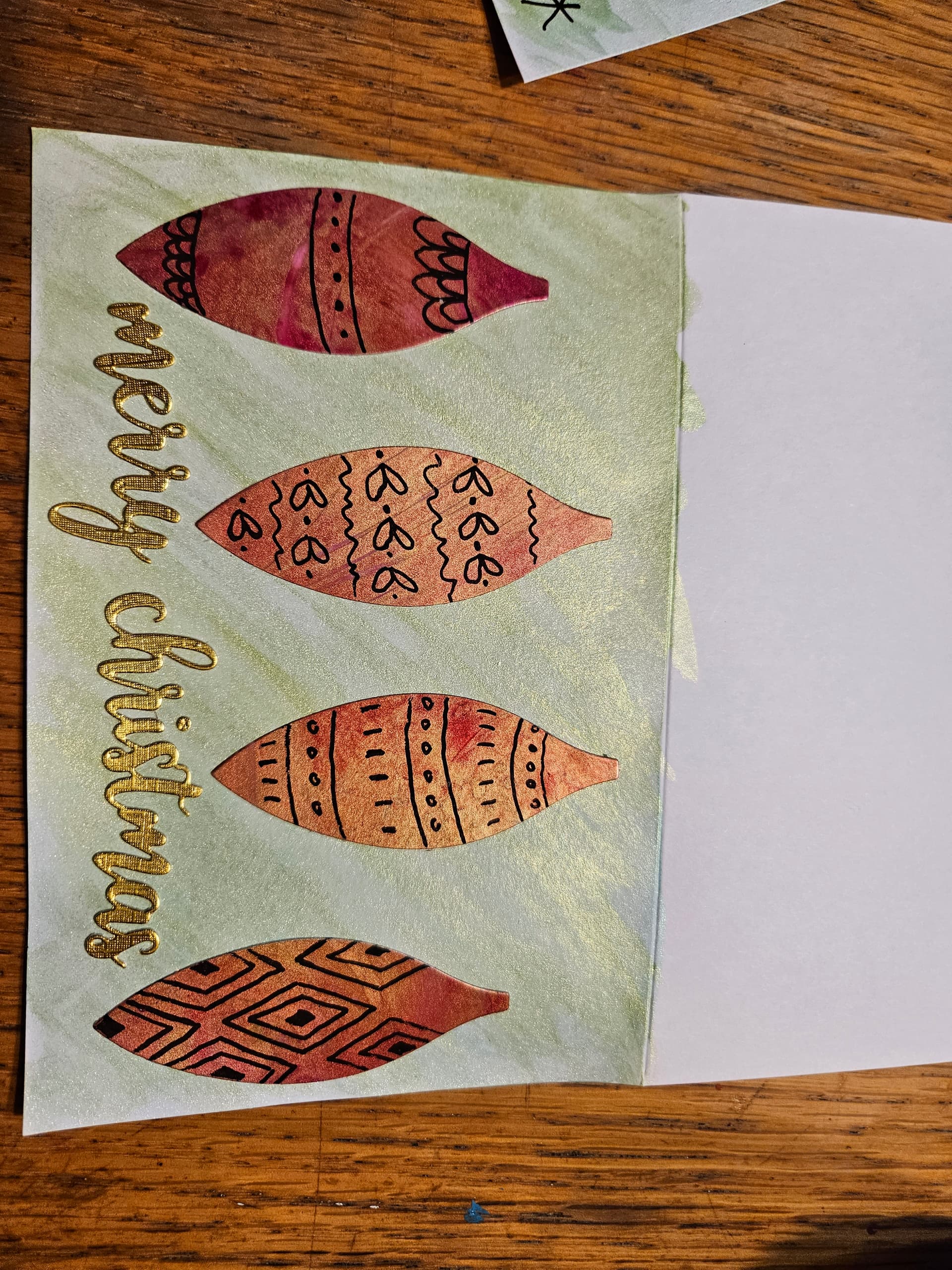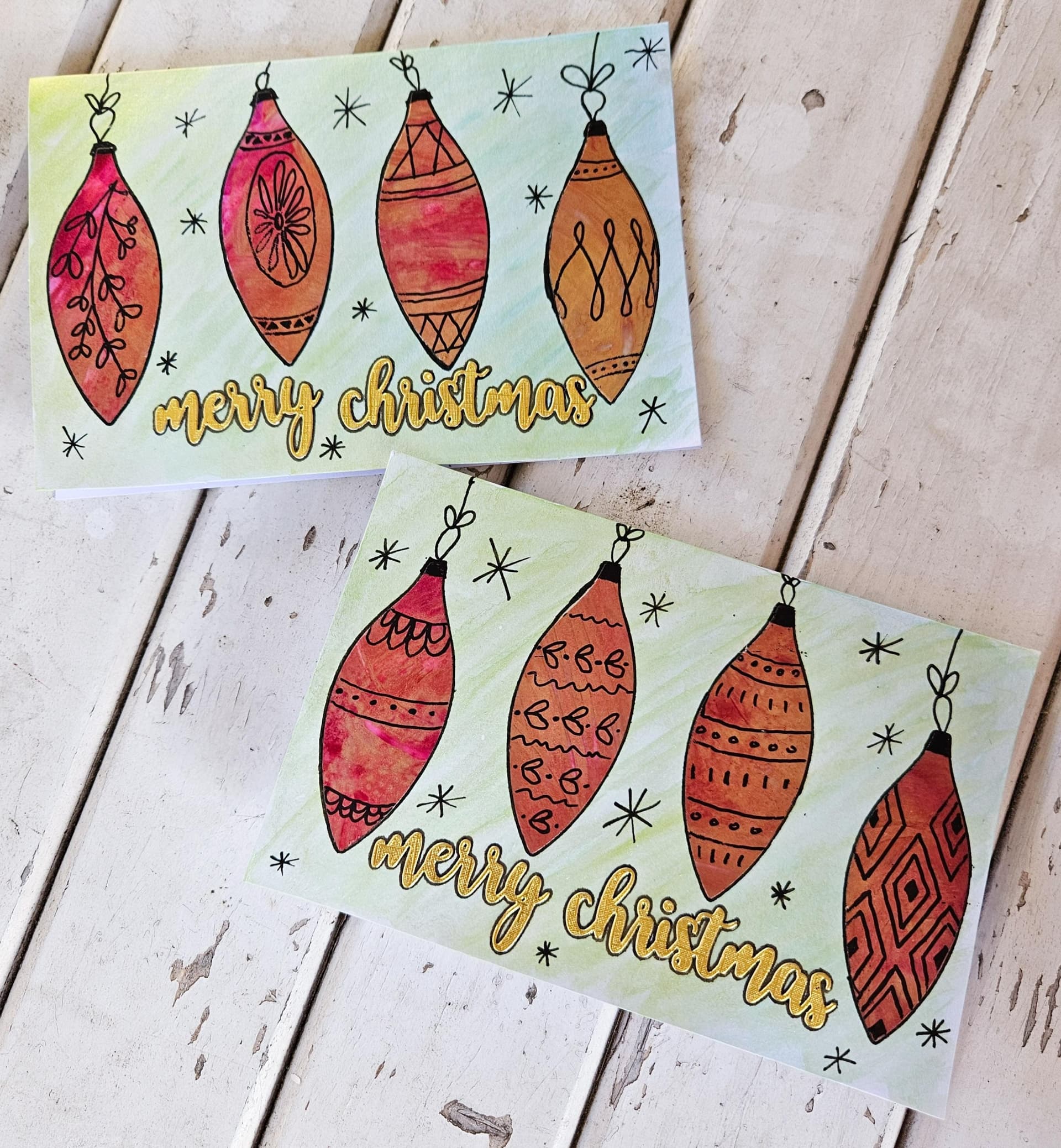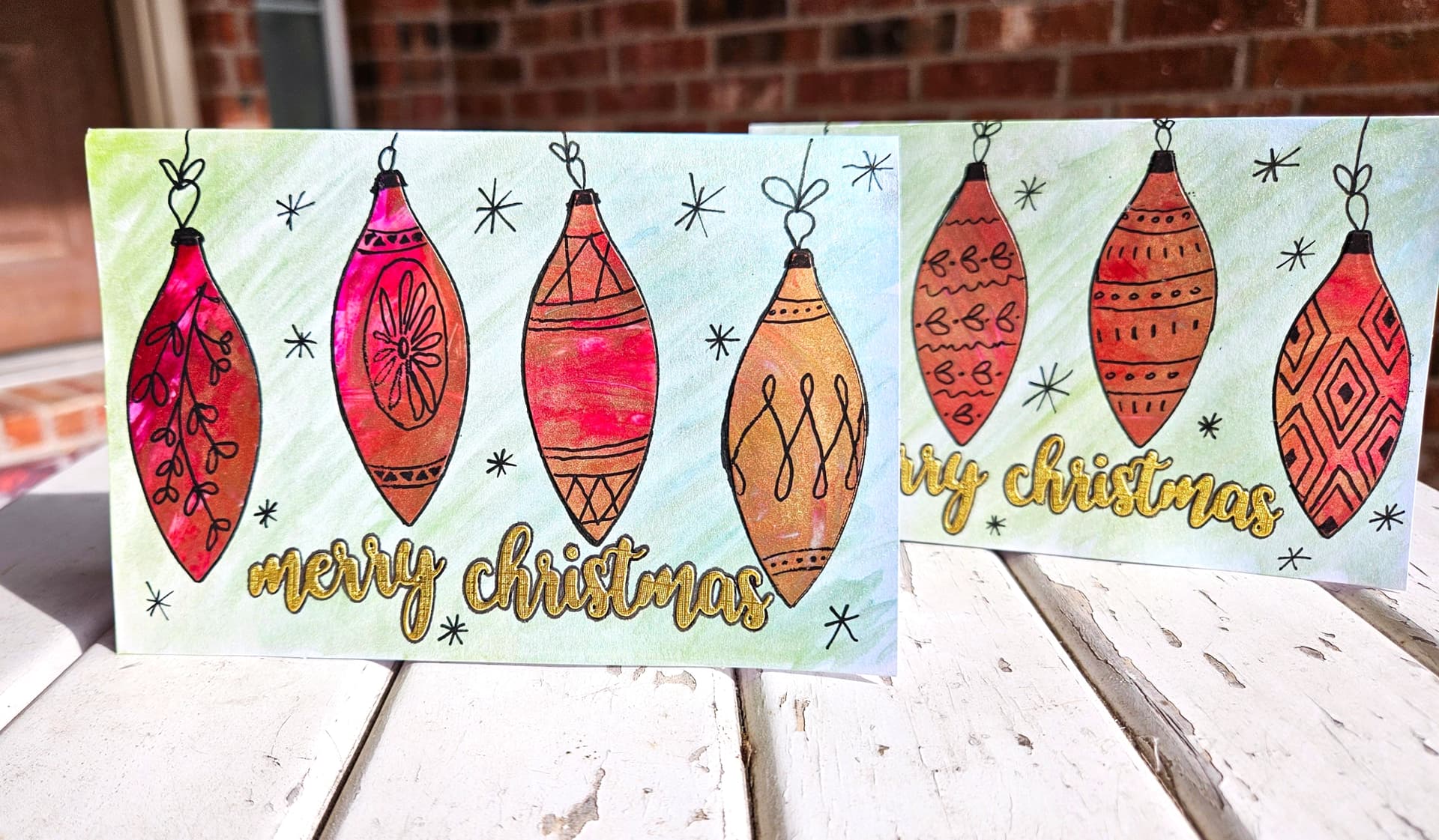 Next I used a black posca pen to add detail to each ornament. Then I painted two cards with shimmery green watercolor and glued down my ornaments. I die cut the sentiment from some shiny gold scrapbook paper.