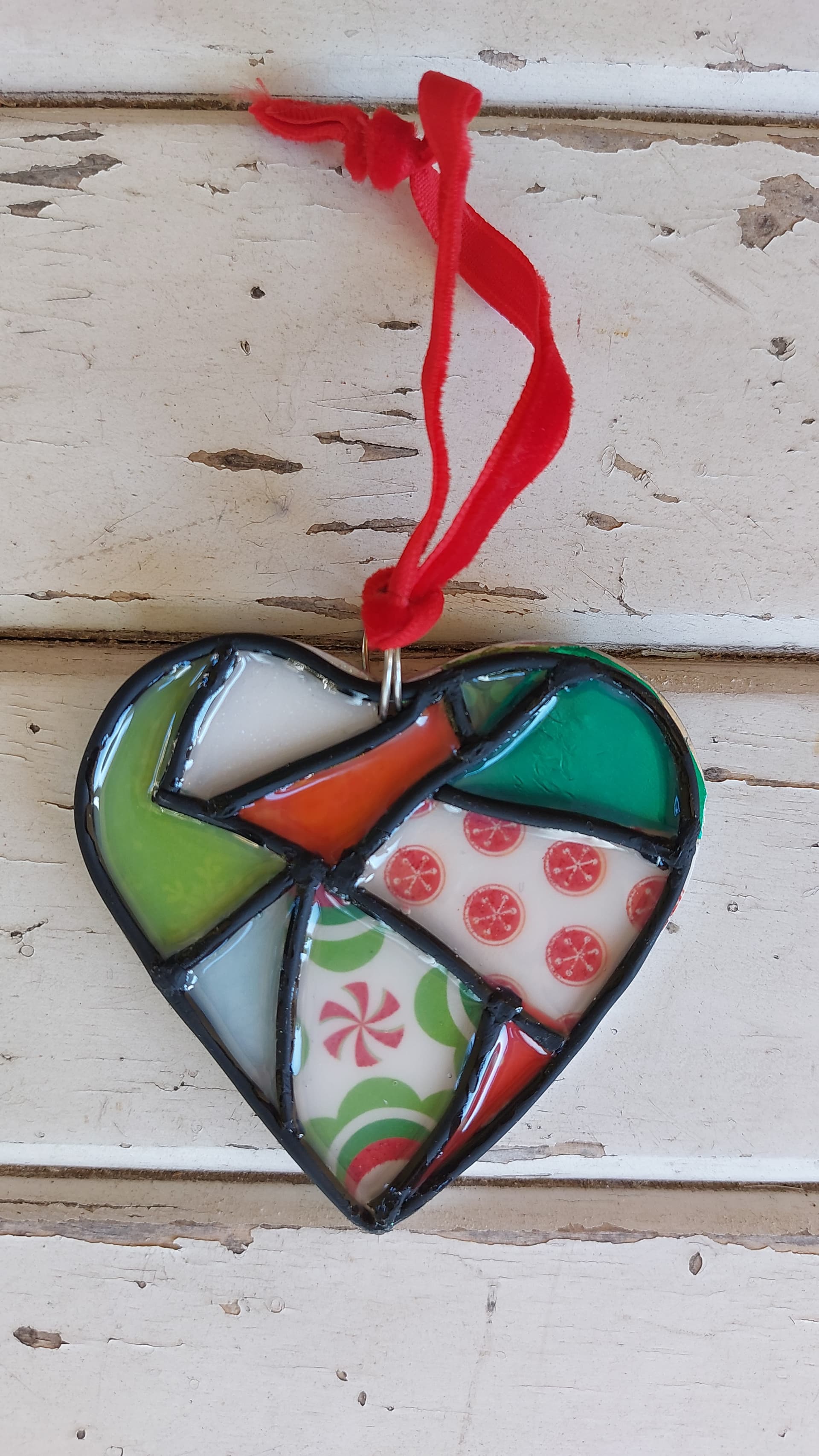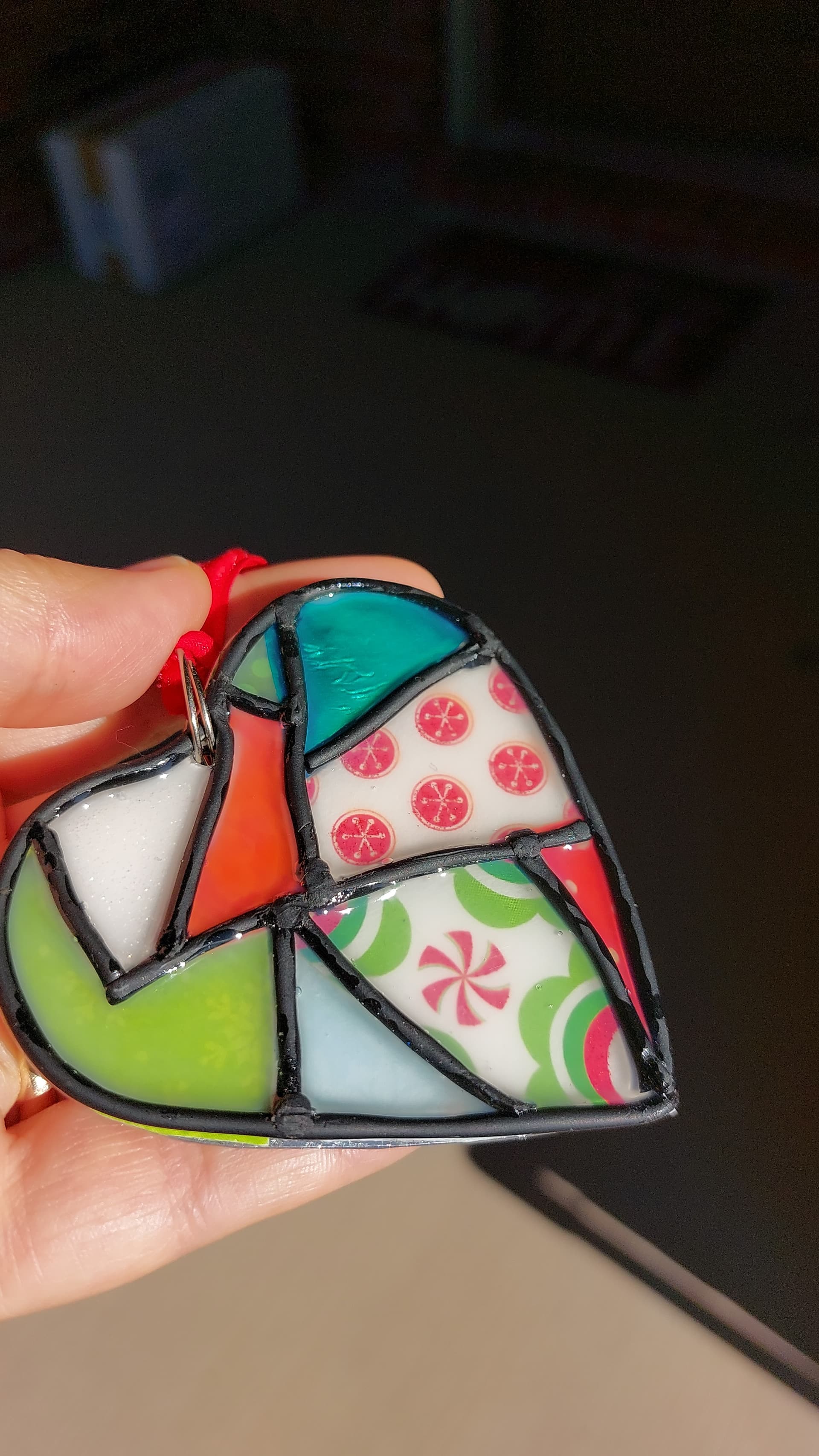They’re a metal base with scrapbook paper patchwork, polymerclay “leading”, and a dimensional high gloss sealer on top to give a glass like look.