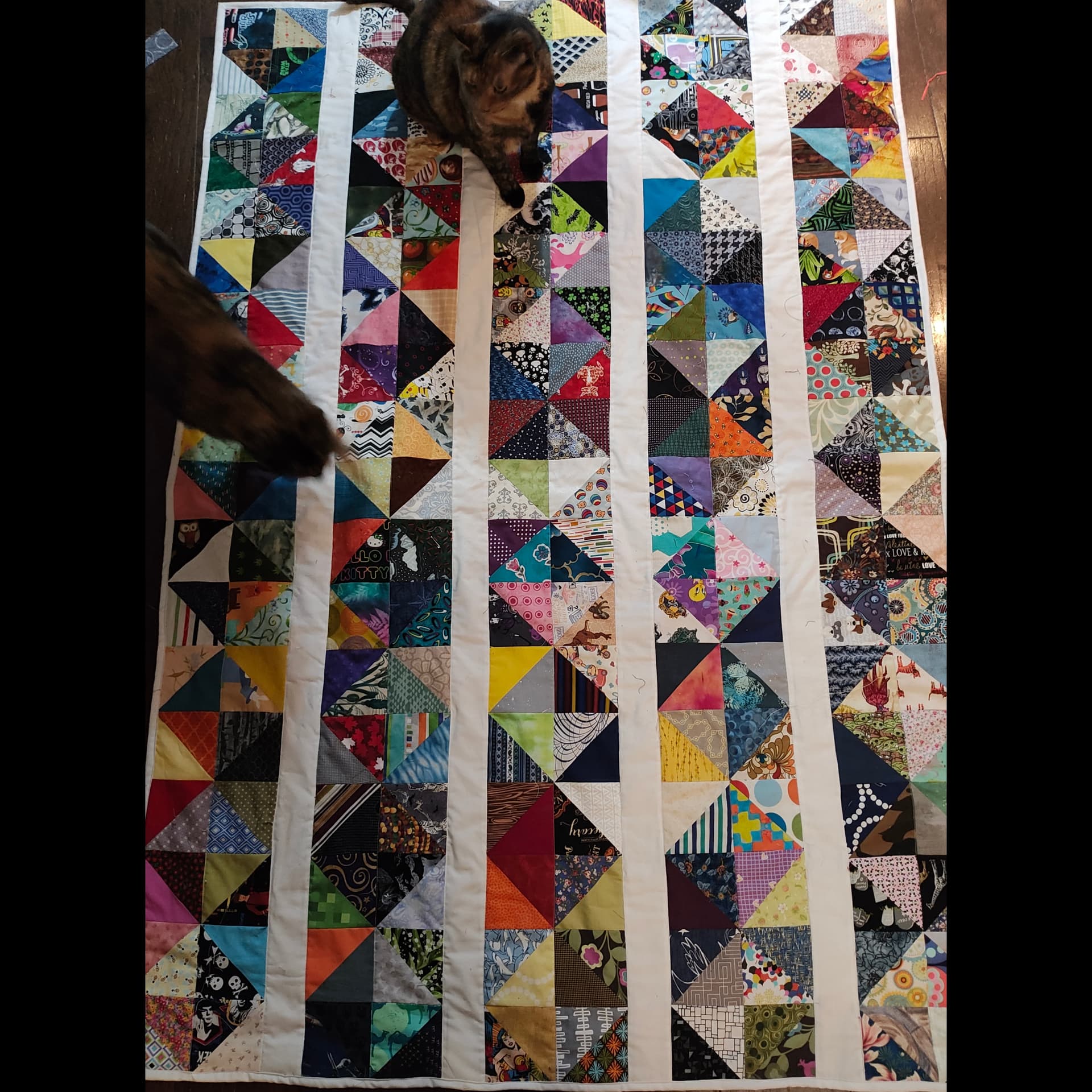 Work problems have me pretty deep in the feels so I found a bag of premade half square triangles and bashed this out. And since I had no plan but to work through some nervous energy and figure out my life. I’m gonna give it away.