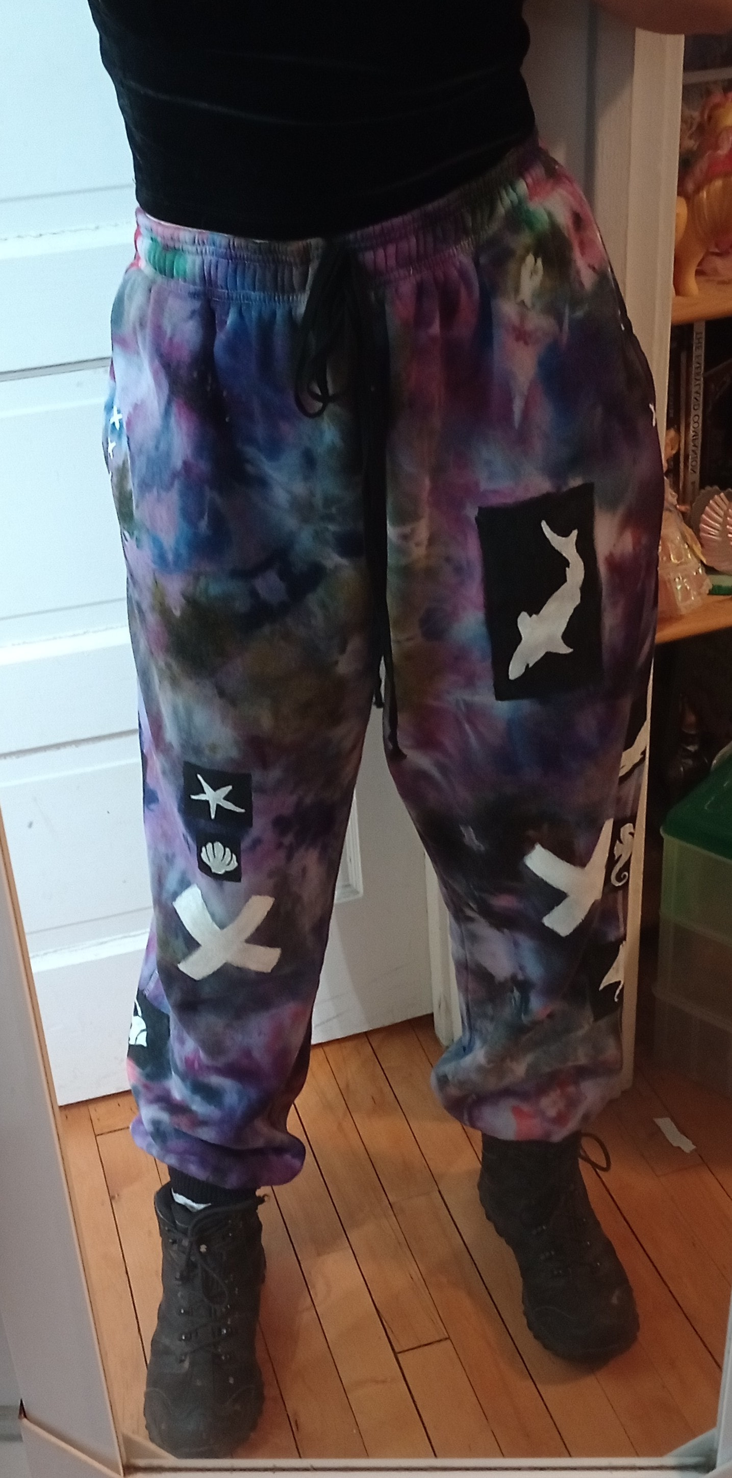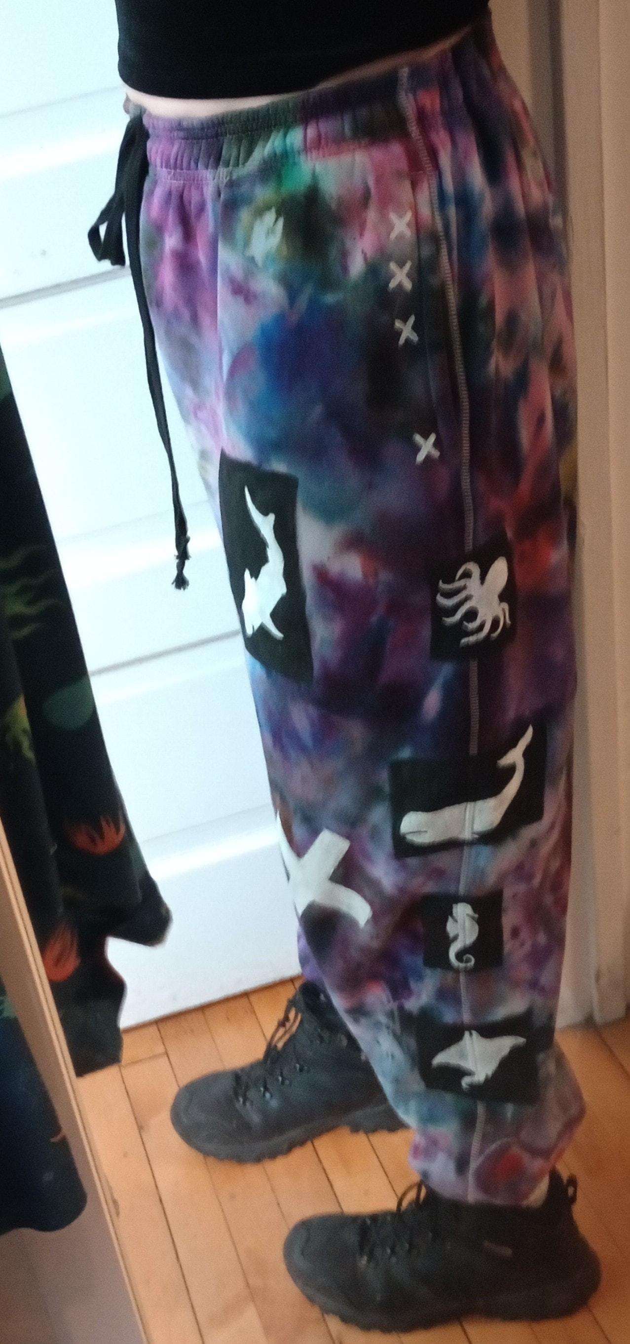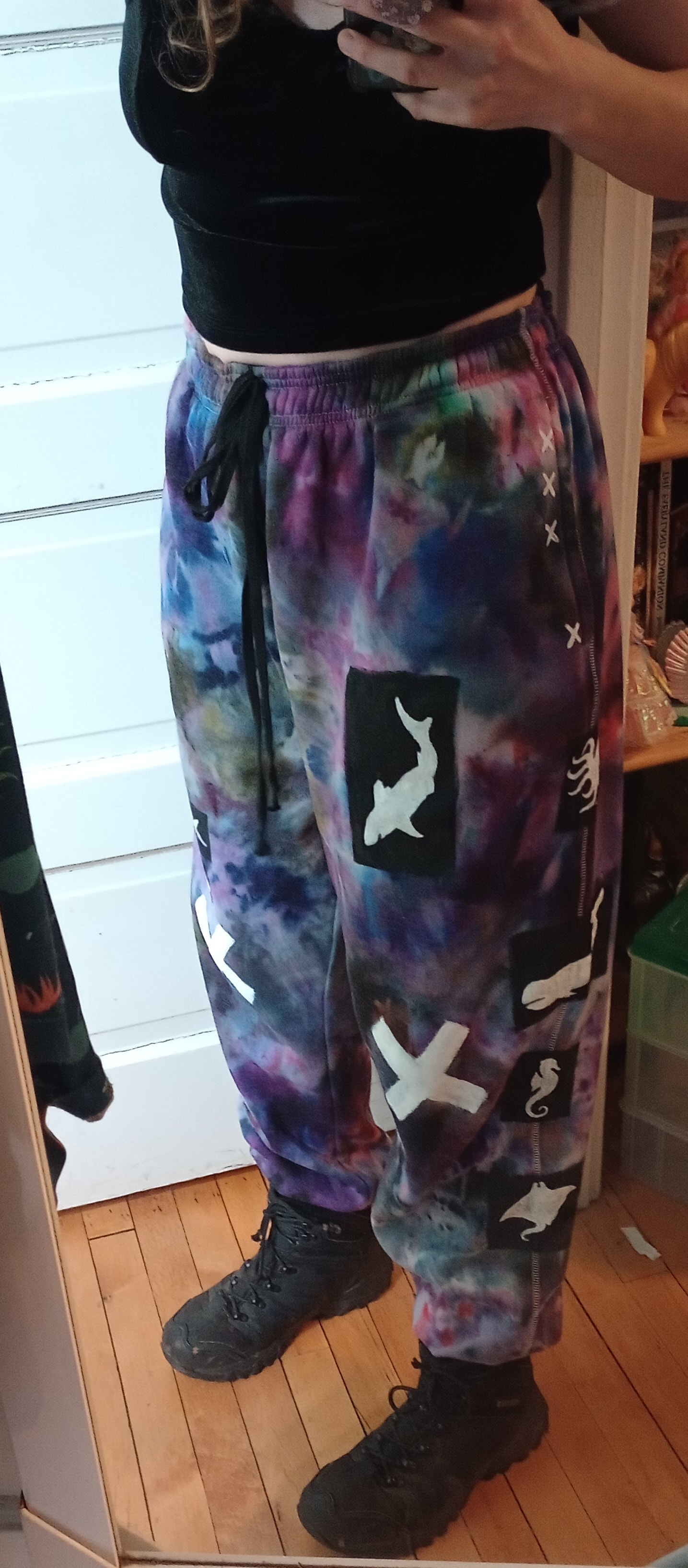 I really like sweats with screen printed designs on them with a lot of stuff going on. And I also wanted some more Ice-Dyed pants. I was inspired by fellow Sloth @sloth003 to use the snow to ice dye! Sort of a therapy to deal with my dislike of winter. I sort of dreamed these up one night.