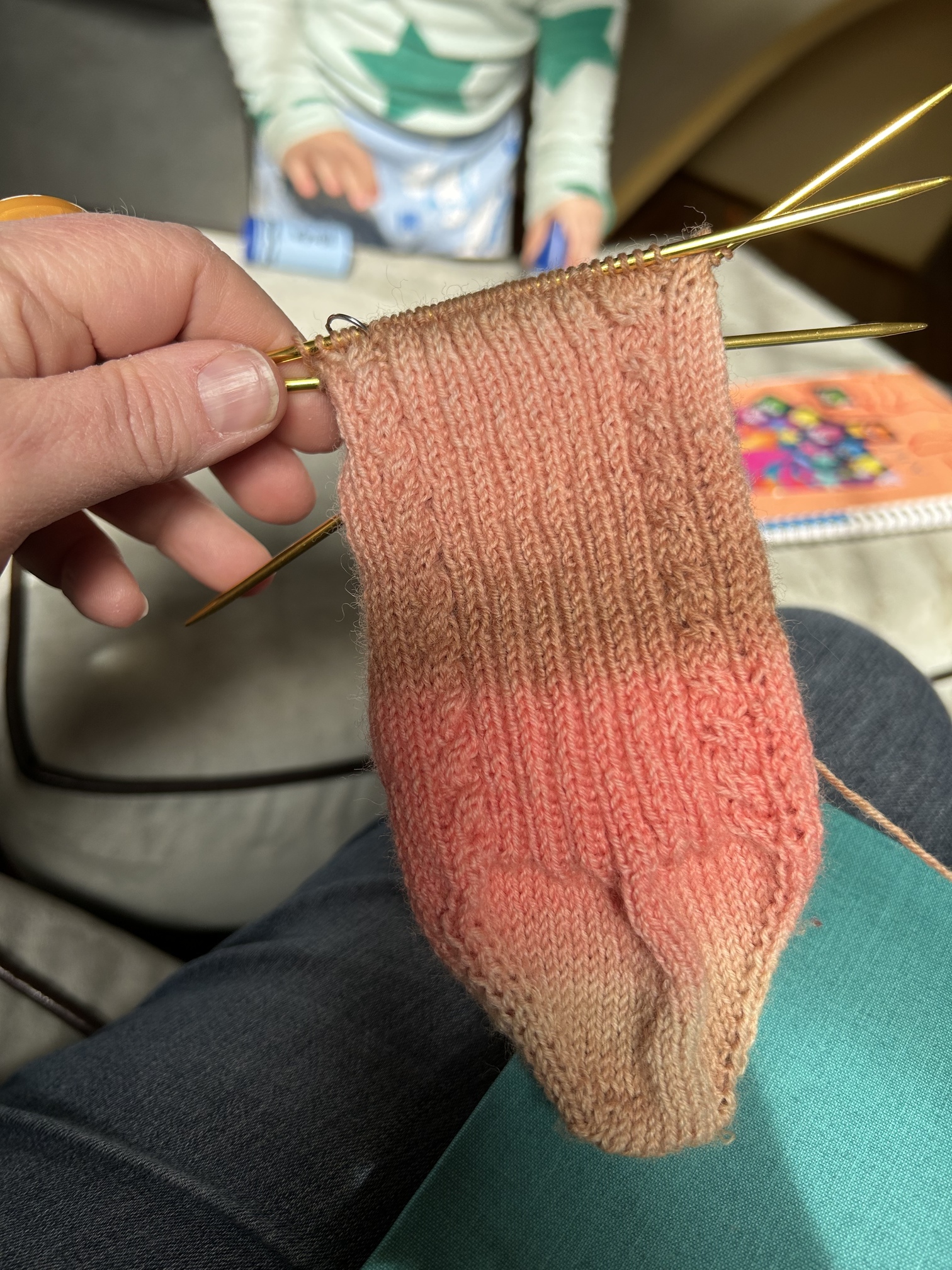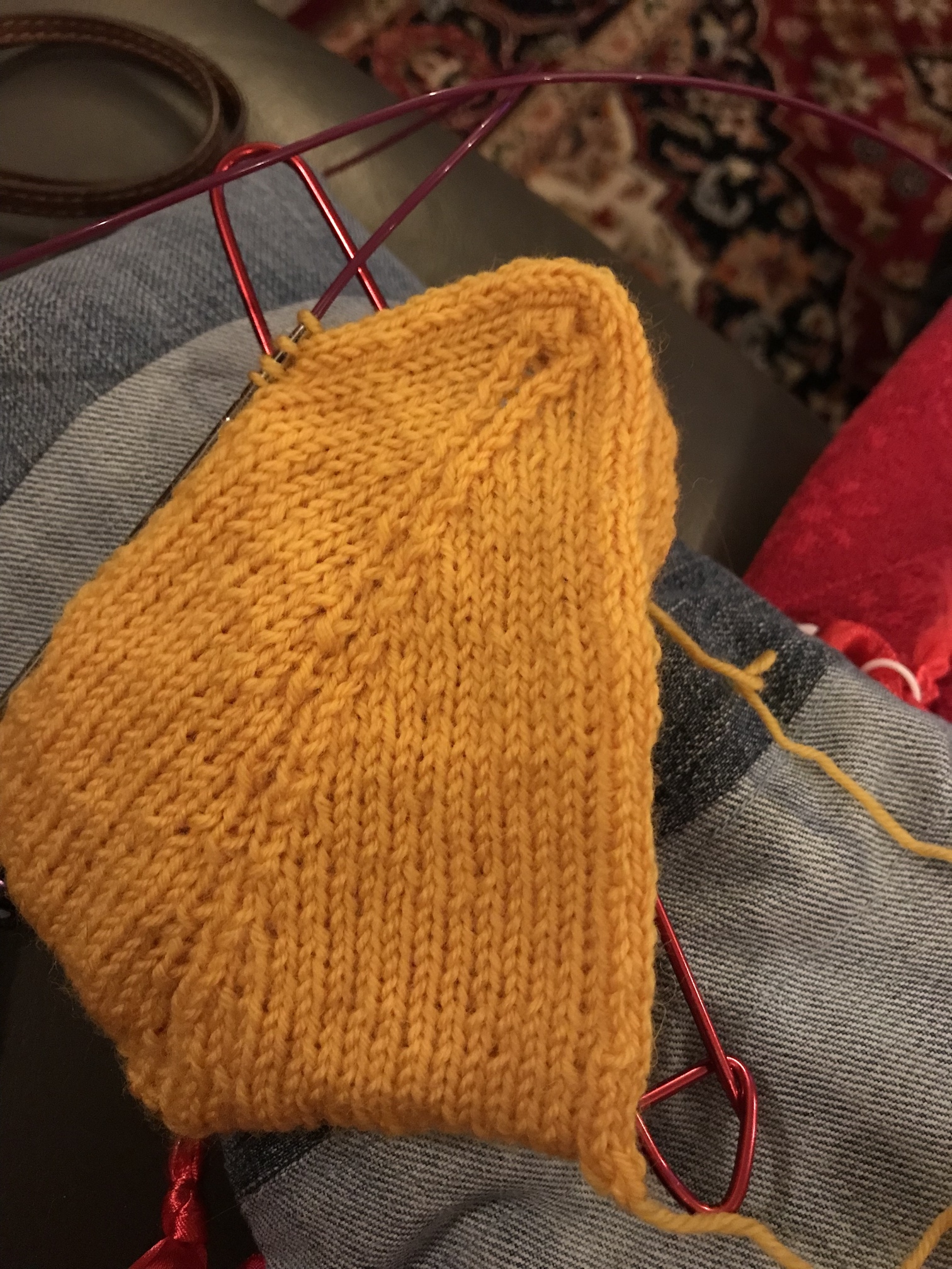 I’m in that oh-so-useful indecision/stall stage of a project where I think it’s actually ready for the next step but it doesn’t line up with the pattern so mayyyybe I’m wrong. Like here my toe/foot feels like it fits when I try it on but it isn’t as long as the pattern calls for so I’m second guessing myself/my eye.