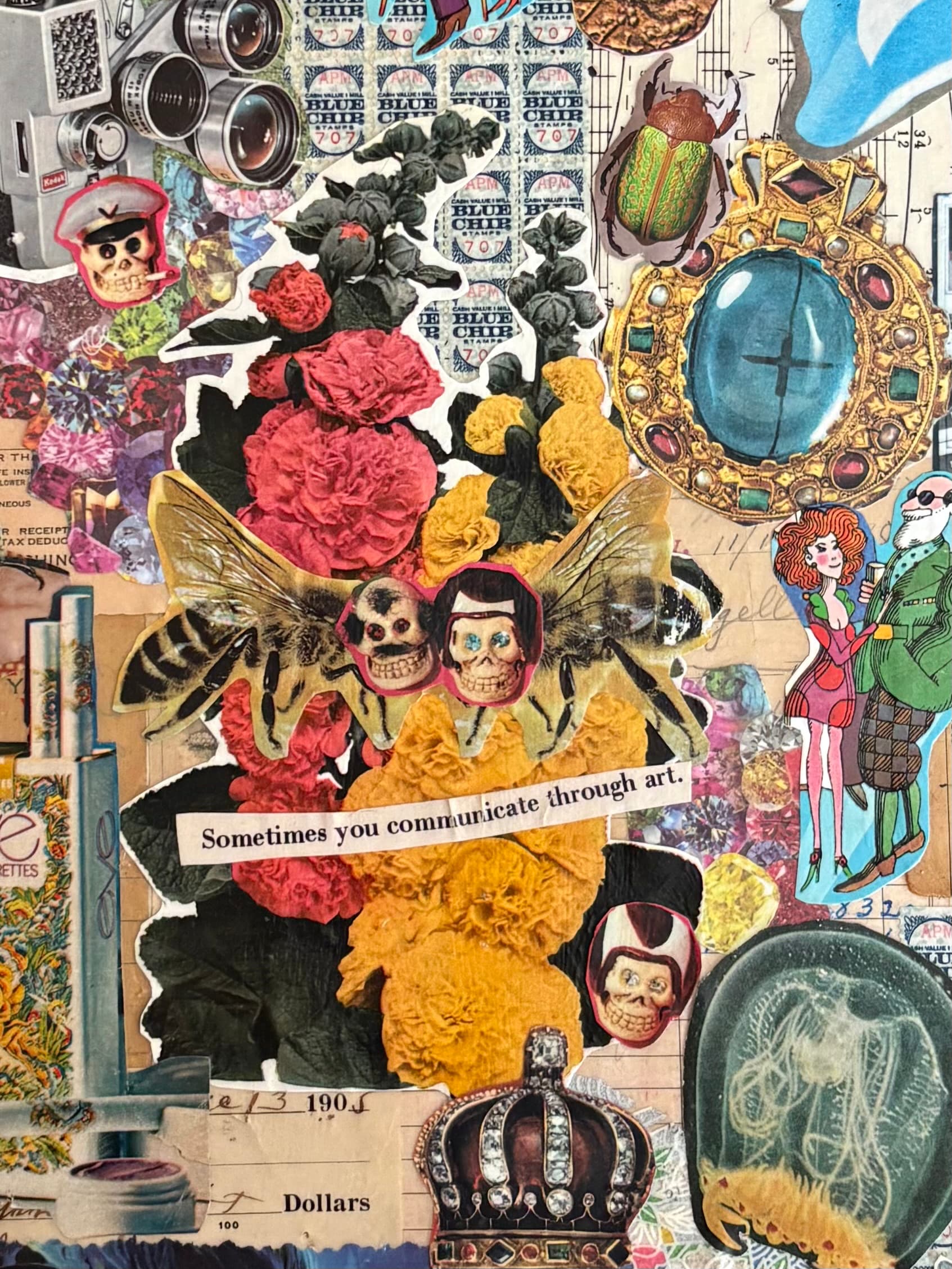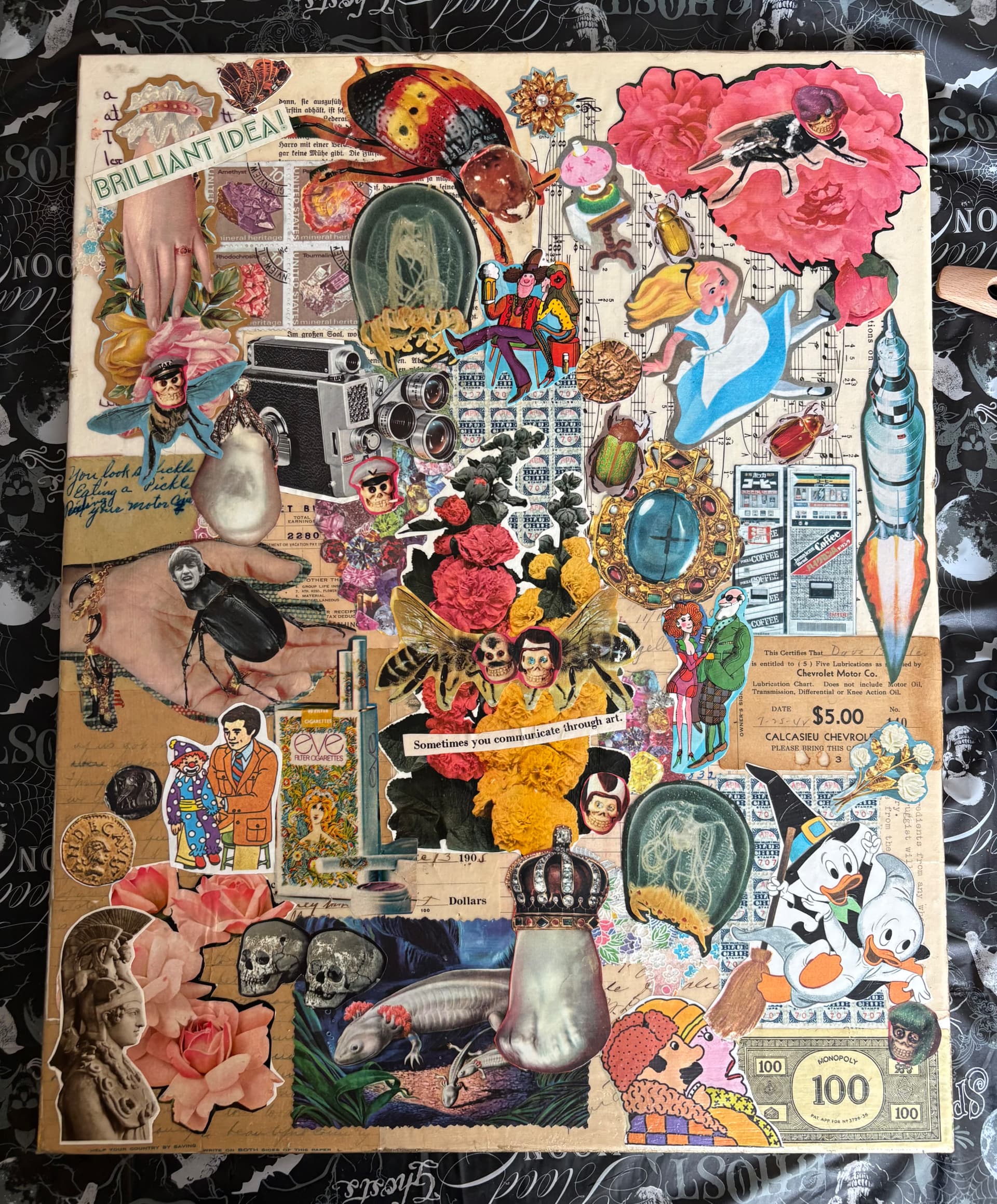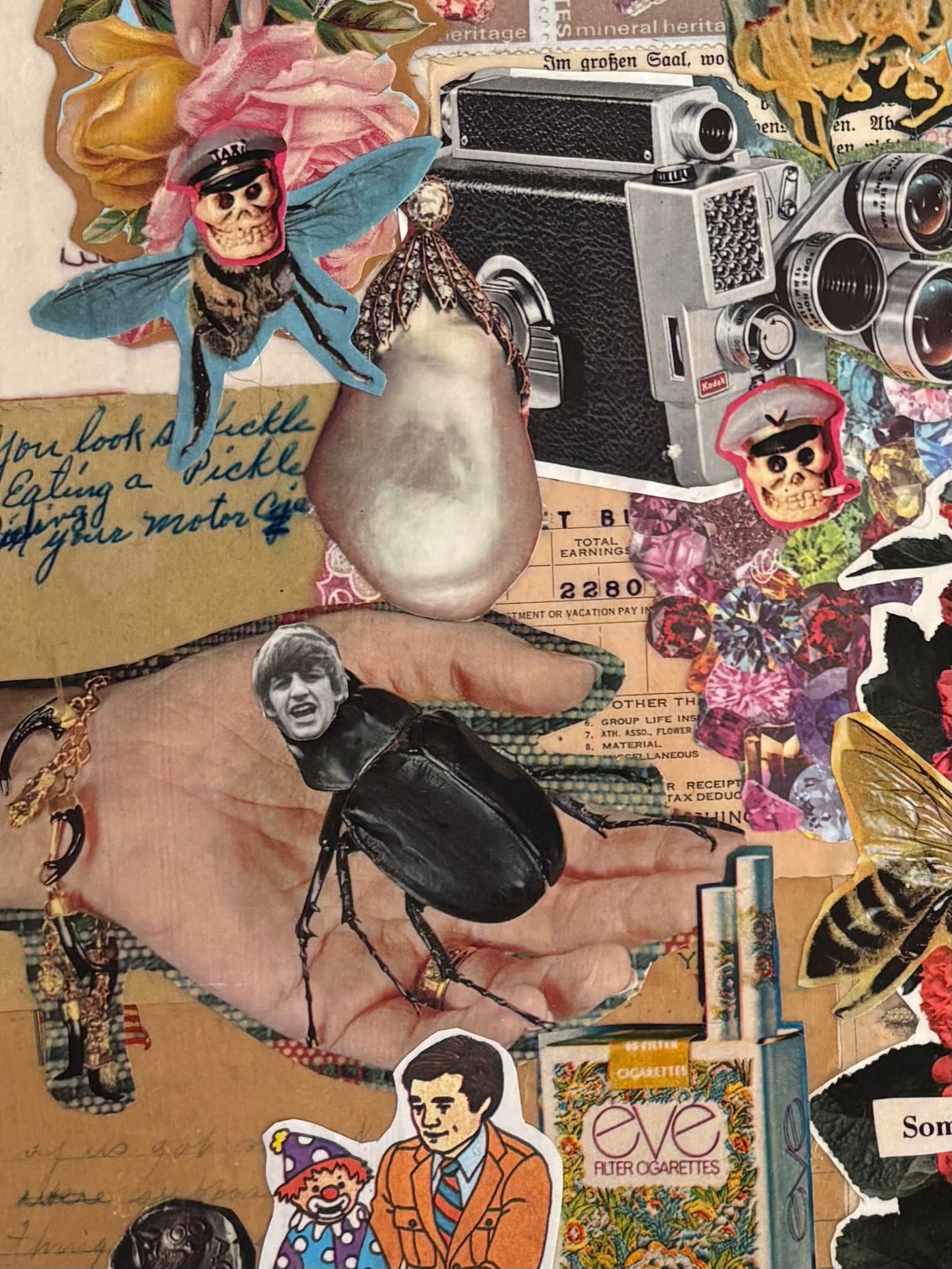 I made this collage for an art show where local artists are challenged to make a piece of artwork not in their own style that’s usually shown at the gallery, and then we guess who did what. I moved into our place last year and that meant I had a chance to finally rescue my collage supplies I’ve collected over the years that was locked away in storage since 2011. I spent days going through my vintage ephemera that included National Geographics, craft magazines, children’s books, textbooks, stationery and letters, reciepts, etc. I think the oldest piece of paper I used was from the late 1800s. I spent days carefully going through everything, without an actual theme. There was actually a lot of things I wanted to use, but didn’t end up using them. The whole thing came together as I was pasting things together. I’m so happy with how cohesive it looks. I worked from the background base of old stationery and then worked from the center out. I love how it turned out. I don’t remember the finished size, but we were all given the same canvas. I was the only person who did collage, everyone else worked with acrylics. Everyone loved mine and oooh and ahhh-ed when I said it was mine. Felt good. Ringo’s head on a Beetle was my favorite part tbh. Haha.