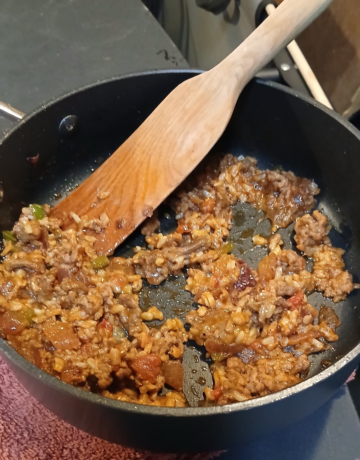 Then when only a small portion of the meat is still frozen, I toss in the frozen rice and wait for it to break apart. Turn up the heat, and add all my spices, cook, then eat.