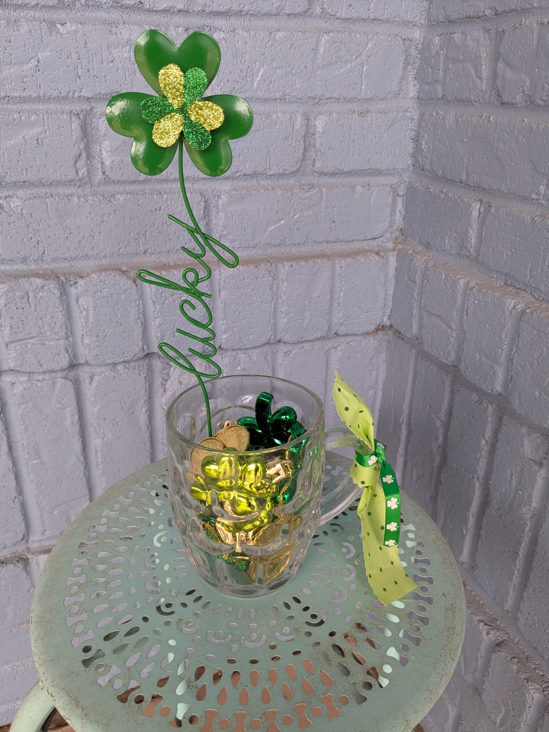 two metal “Lucky” shamrock picks (with clear packaging tape to hold them in place)
