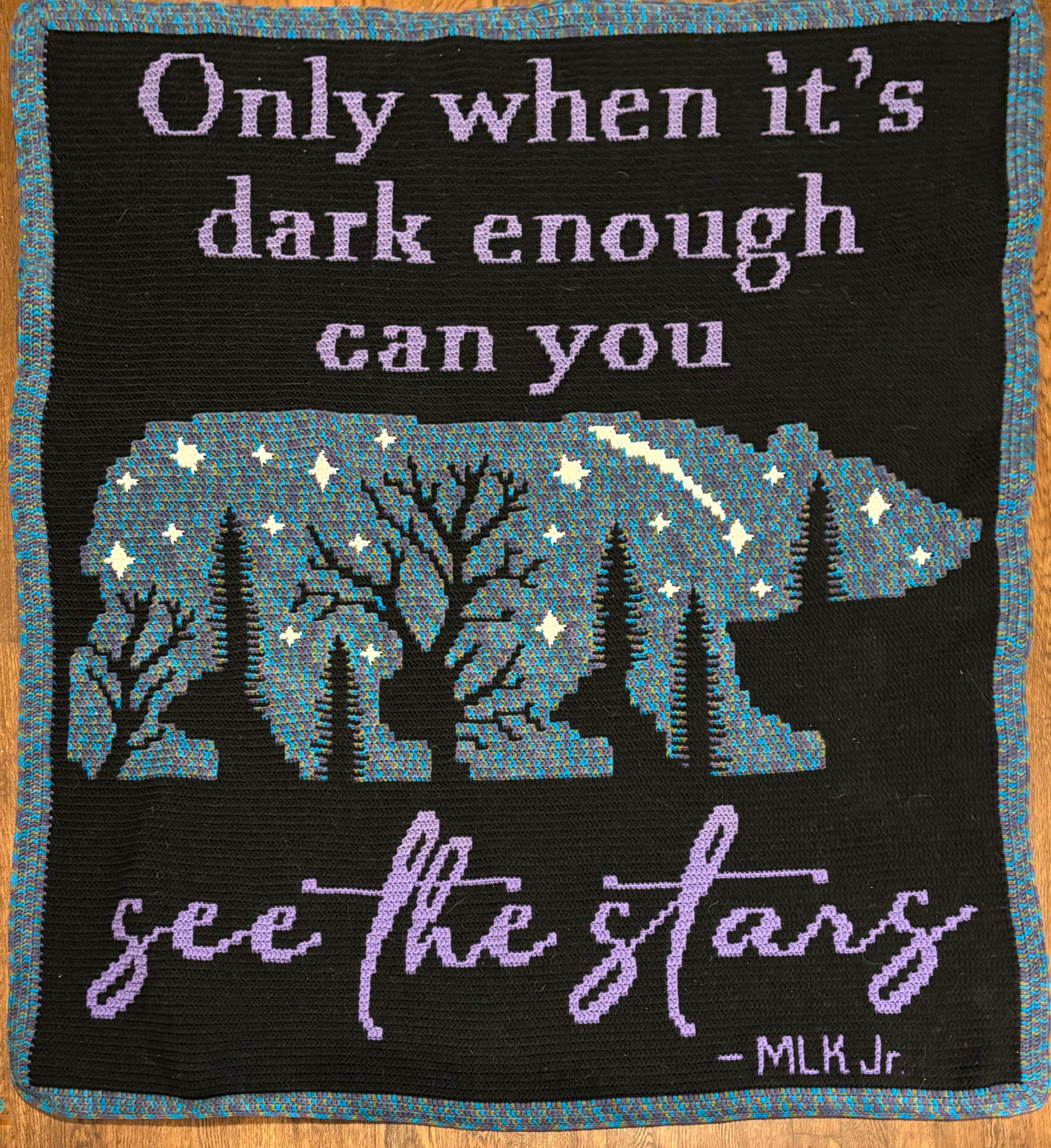 The sky didn’t work out like I thought it would with the variegated yarn I used. The colors changed too quickly for what I envisioned, but I love how it turned out.