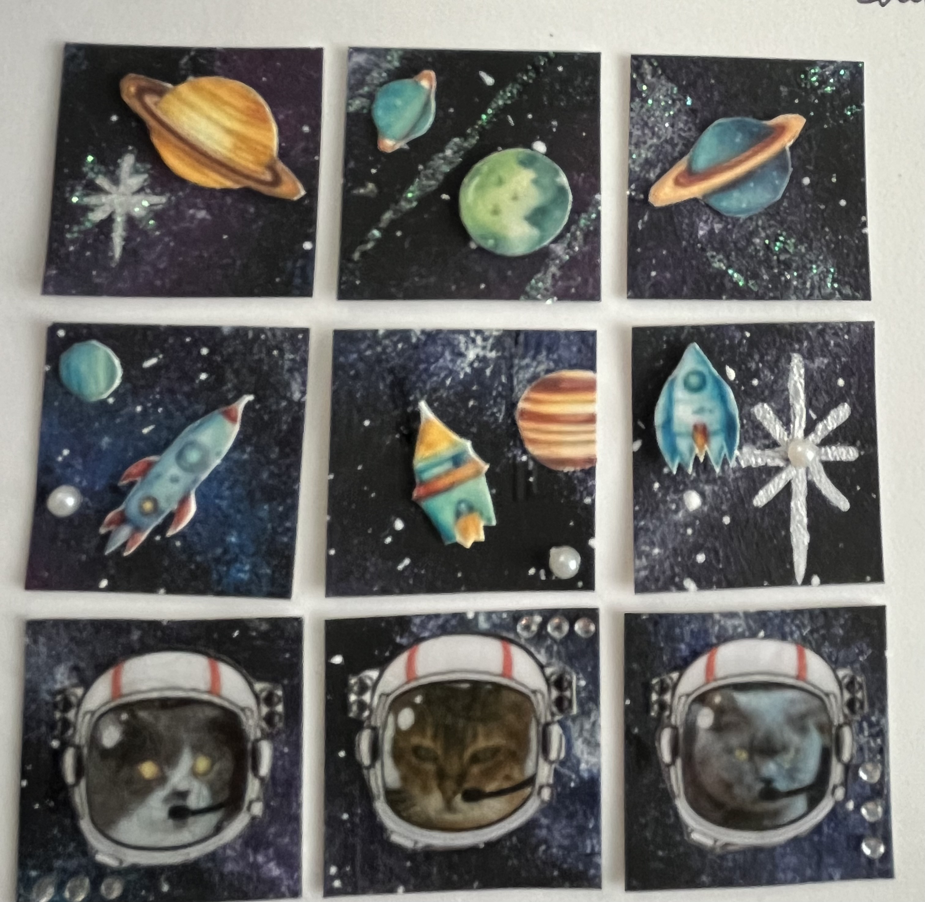 It’s hard to pick a favorite. The sleeping cat and the cat with the ice cream have metallic silver on them. I love the purple one with yarn, too! All of them are great.