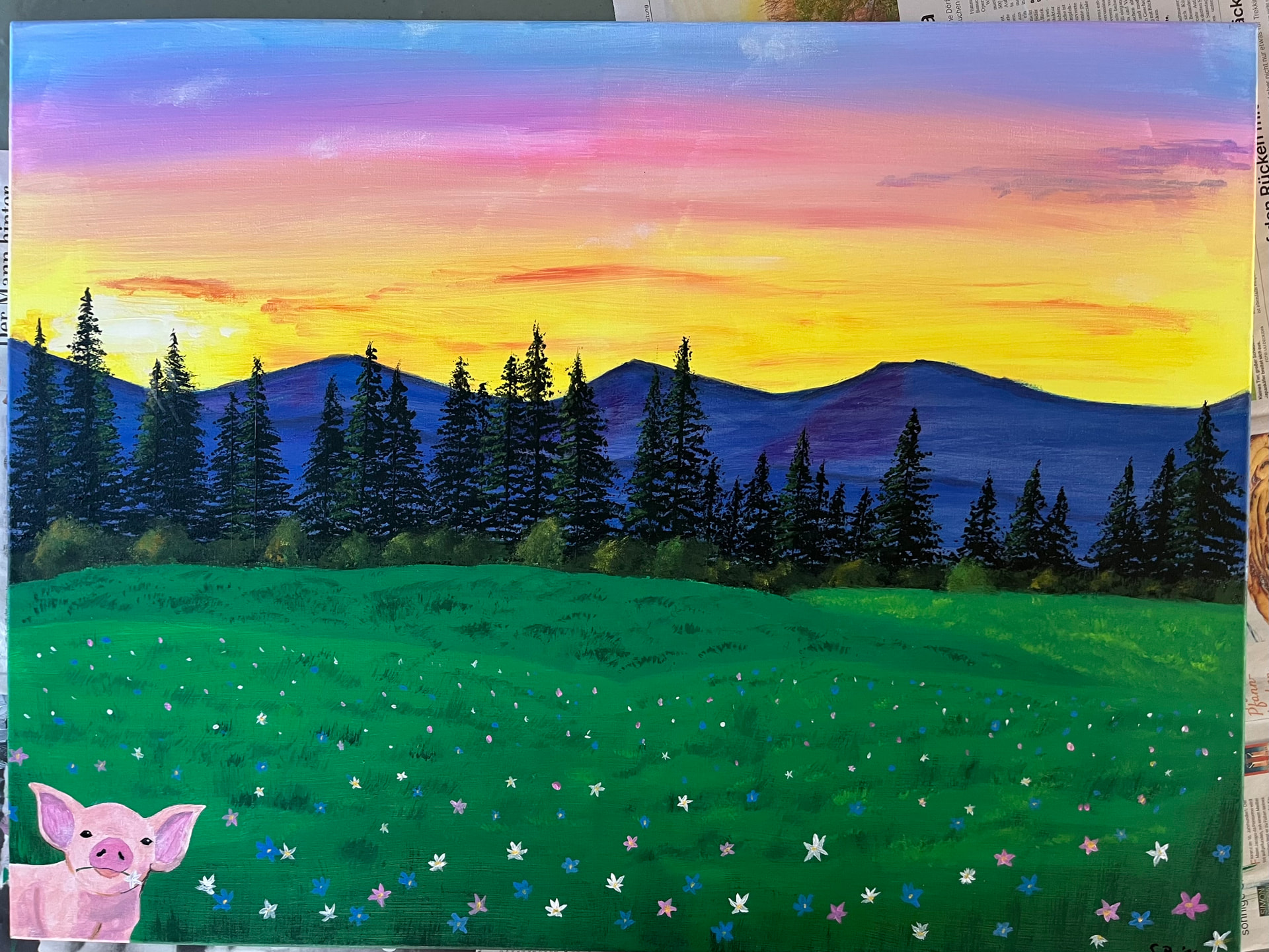 For the background I loosely followed this video and then somehow made up the field. And added a small version of the piggy to the corner.