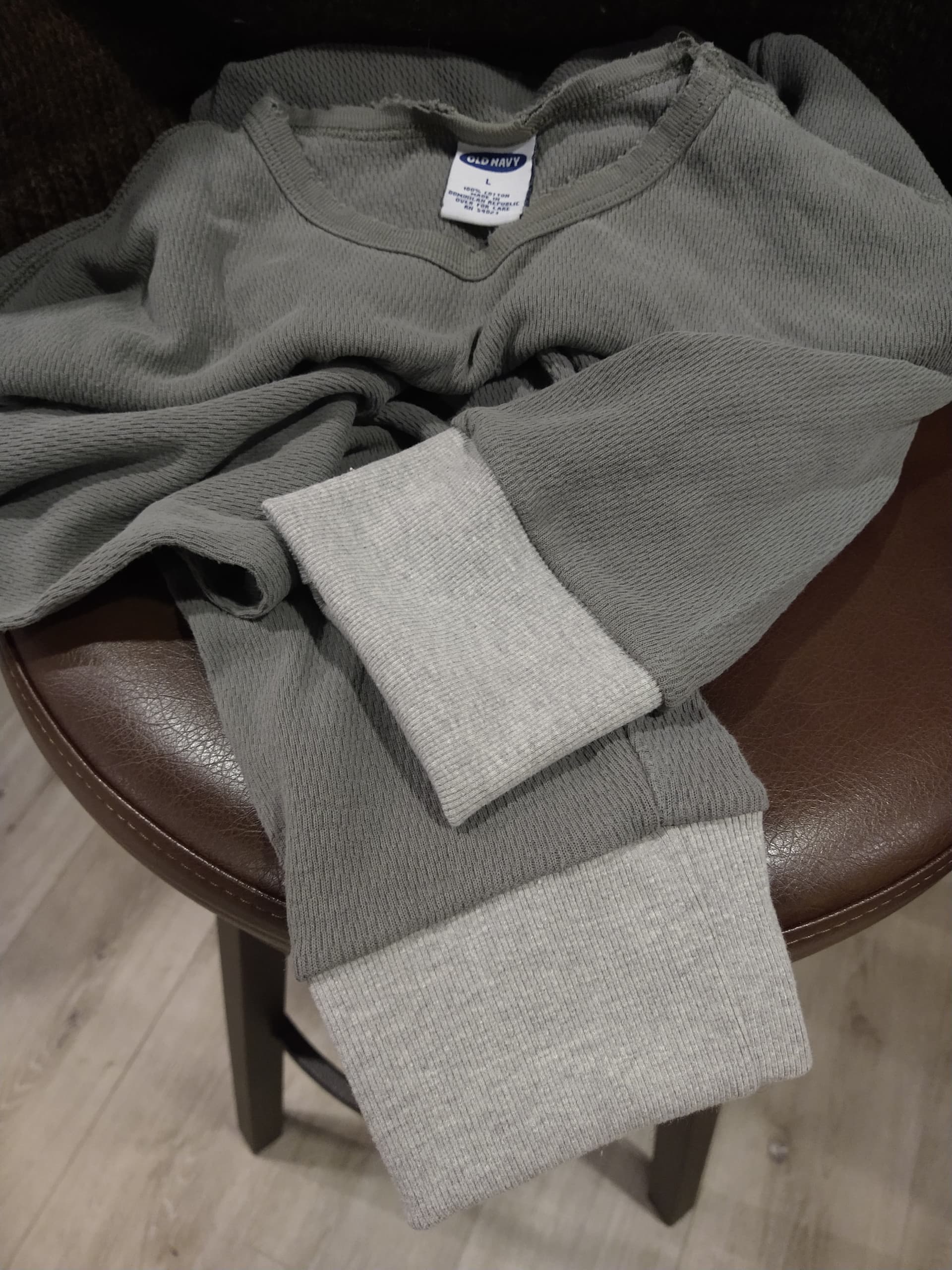 My DH has a couple long sleeve cotton shirts from Old Navy that we have been ‘sharing’ for over twenty years. They’re perfect for sleeping or as undershirts, but one has been loved to tatters. The sleeve cuffs were falling off, stitched back on in places, but still holey and getting runs in the knit fabric. The neckline isn’t much better, but I’ll leave that alone unless there are actual holes. I cut the old cuffs off and used a ribbed knit fabric from my stash to make new ones. Quick fix and my favorite sleep shirt is cozy again.
