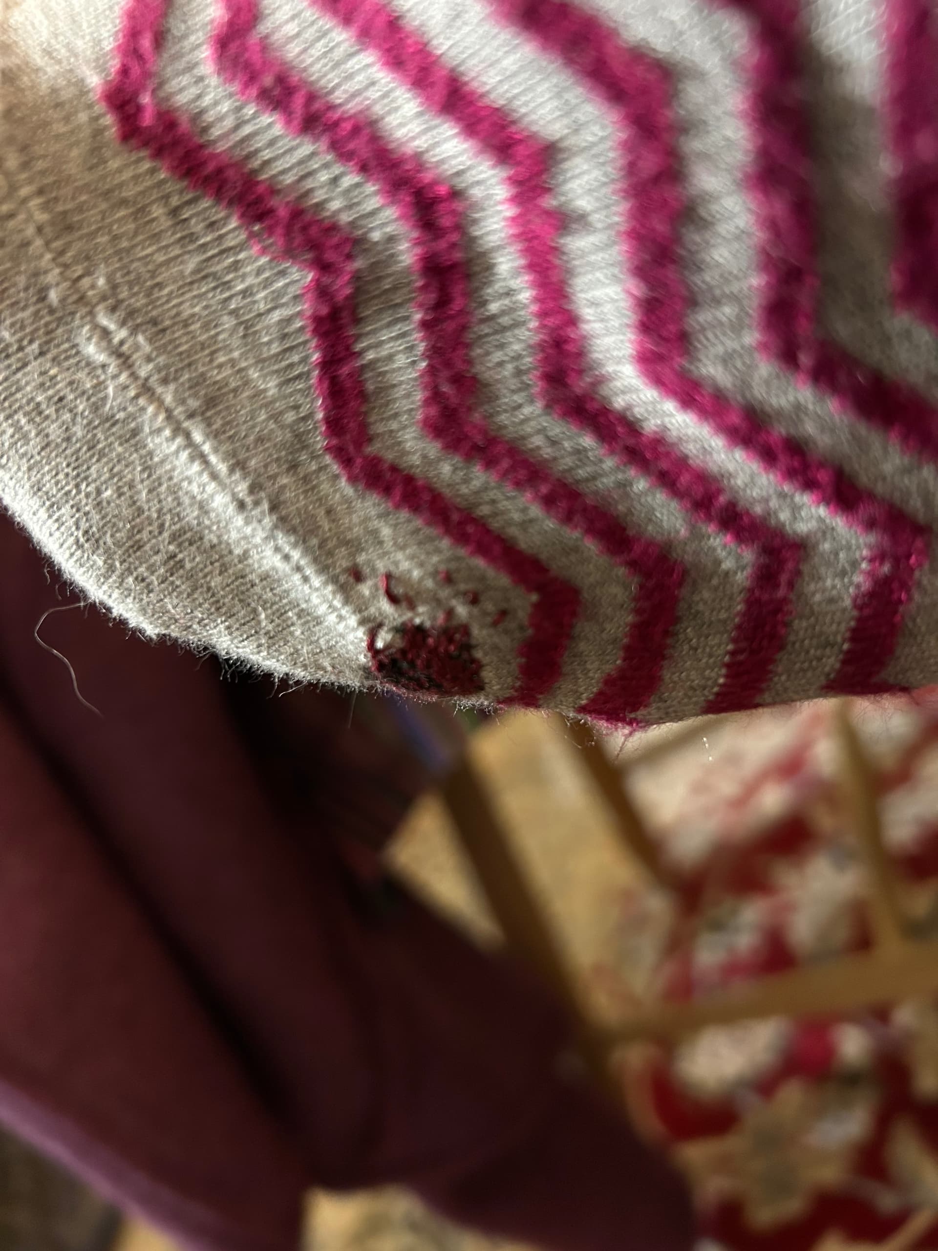 Two holes fairly close together, so I trimmed away some frayed bits and went with a piece of fabric behind the holes and stitching over with split embroidery thread. I can’t see what I’m doing (black on black) but neither can anybody else so I’m calling it good.
