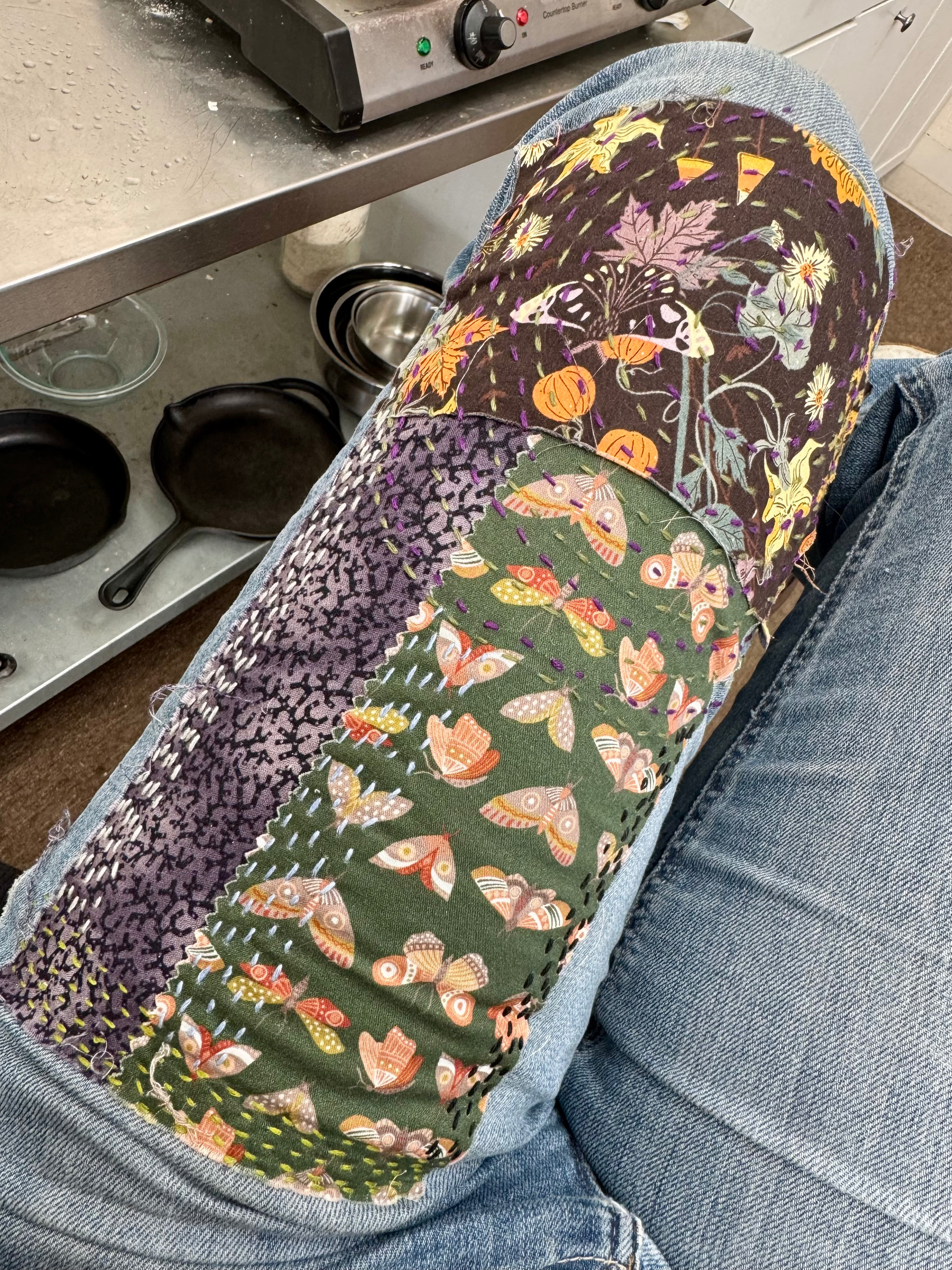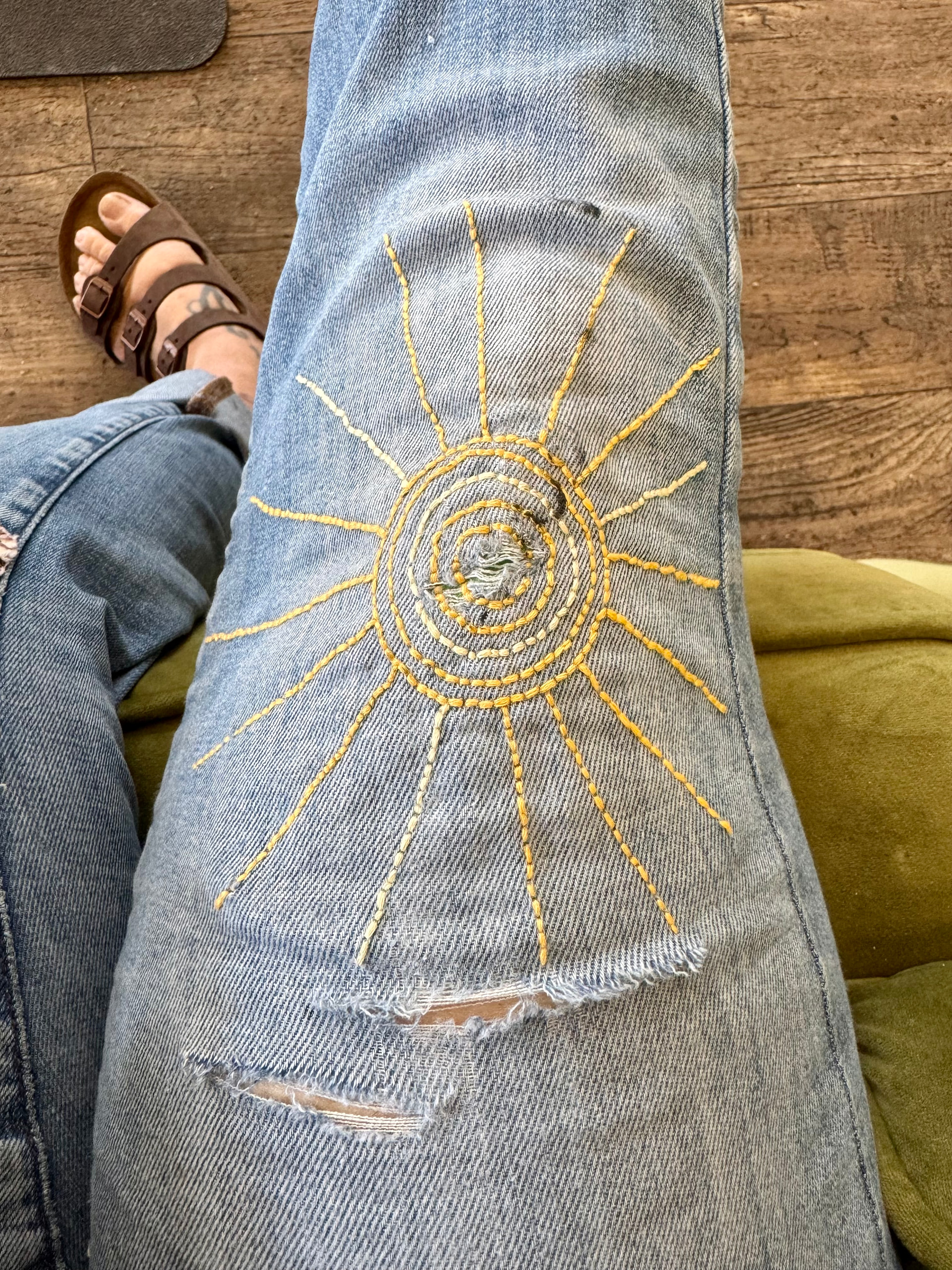 ALL of my jeans have been falling apart over the last year. I have been creatively patching jeans instead of buying new ones (till they just totally give up) since high school. My mom didn’t have a lot of money for clothes for us so as soon as I was old enough to realize that, I was buying thrift store jeans and patching them up to make them last and make them more beautiful. So here’s the middle age version of that (except that I bought all these jeans new)…
