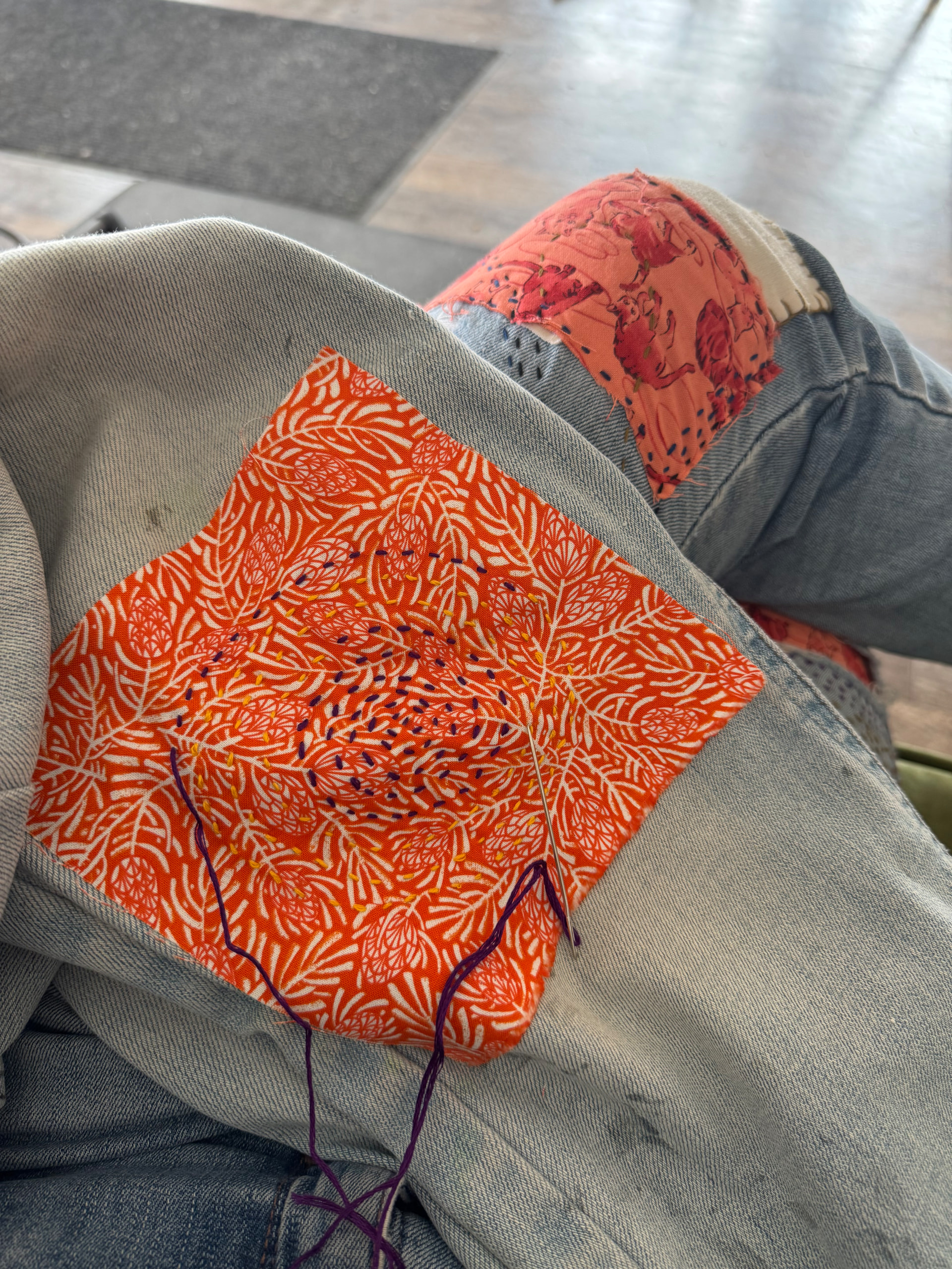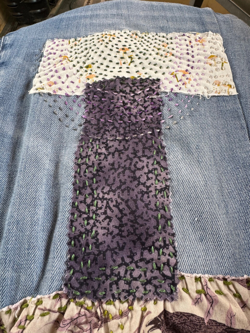 I am more like @MamaRhi …just do visible mending and enjoy the hand stitching! I love your jeans and wish I could still fit my old, ratty, patched up ones…is it too late to start a “new” pair at 72? ha ha ha