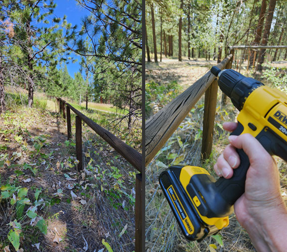 Mostly maintaining by reoiling the rail on our lonnnnng fence, but also mending by adding a screw where the fencing contractor seemed to have missed one and I hadn’t noticed when I originally oiled the fence way back then.