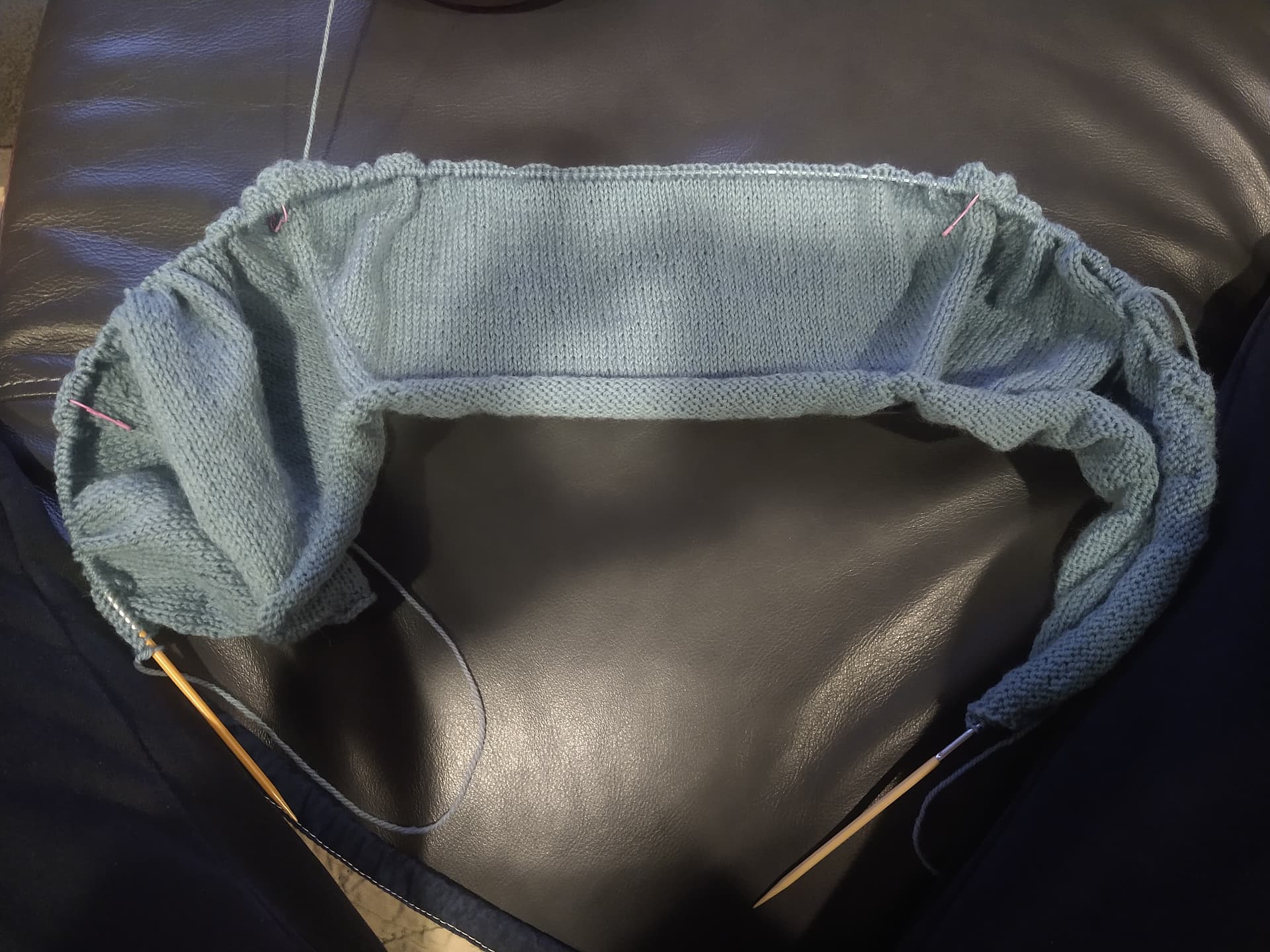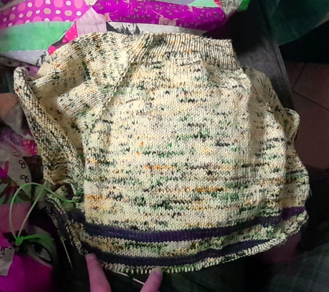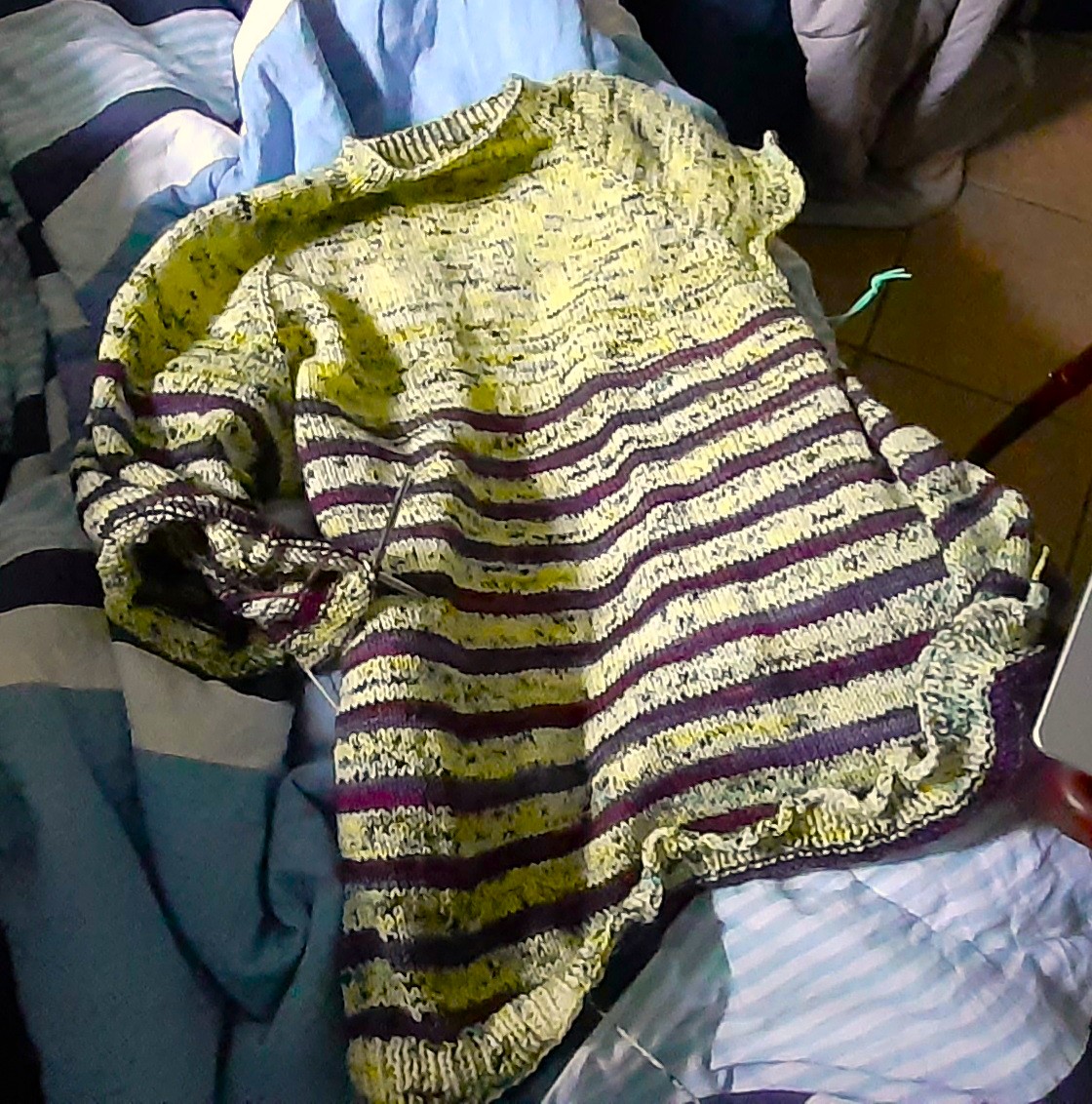 I started on another stashbuster sweater - basic raglan with stripes that start after the sleeve-split.