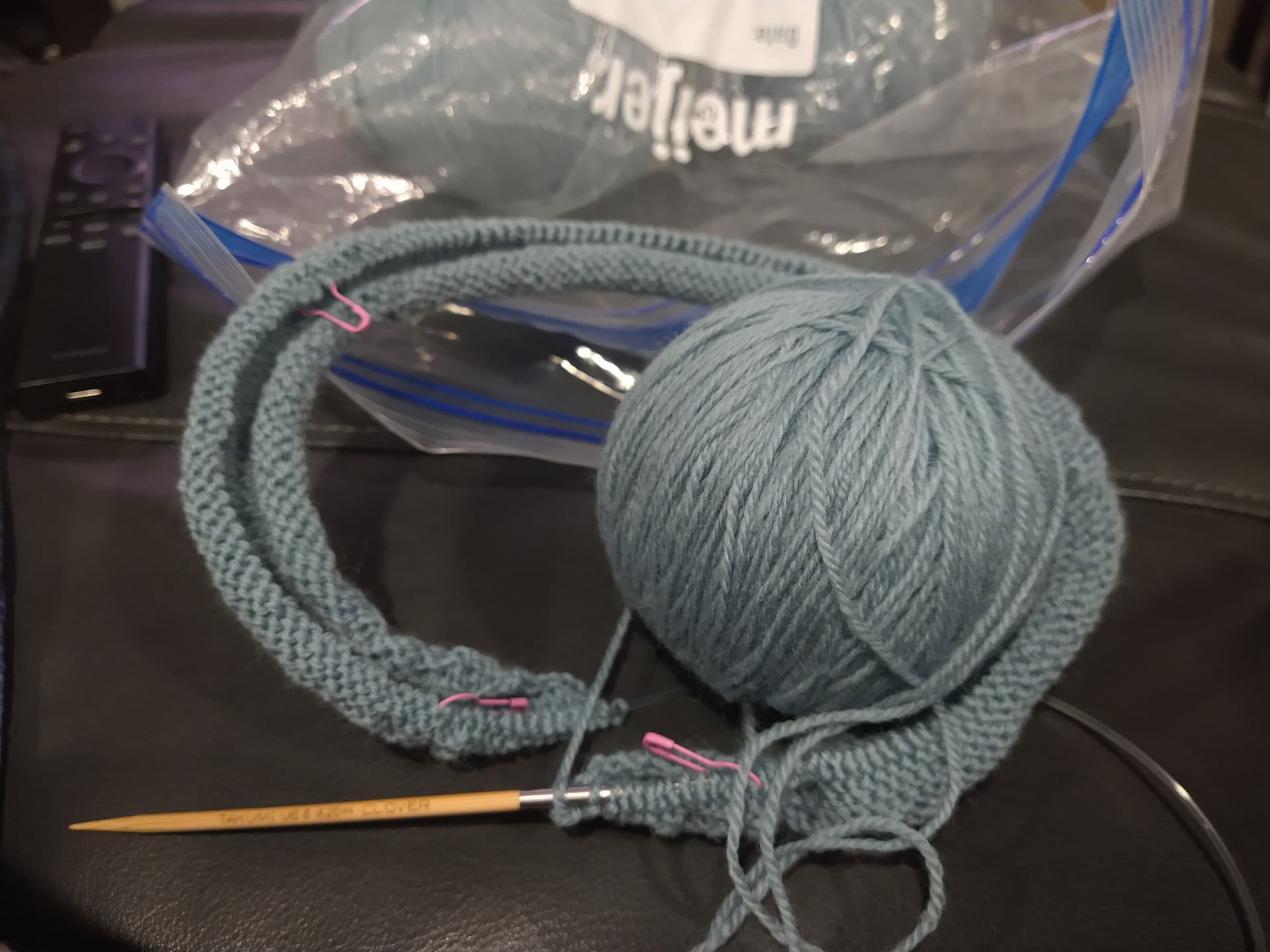 I’m almost 50g in, about 55 rows. I really like this yarn and am regretting not buying more before it was discontinued. It’s Hobbii Evergreen, a fingering weight, organic wool.