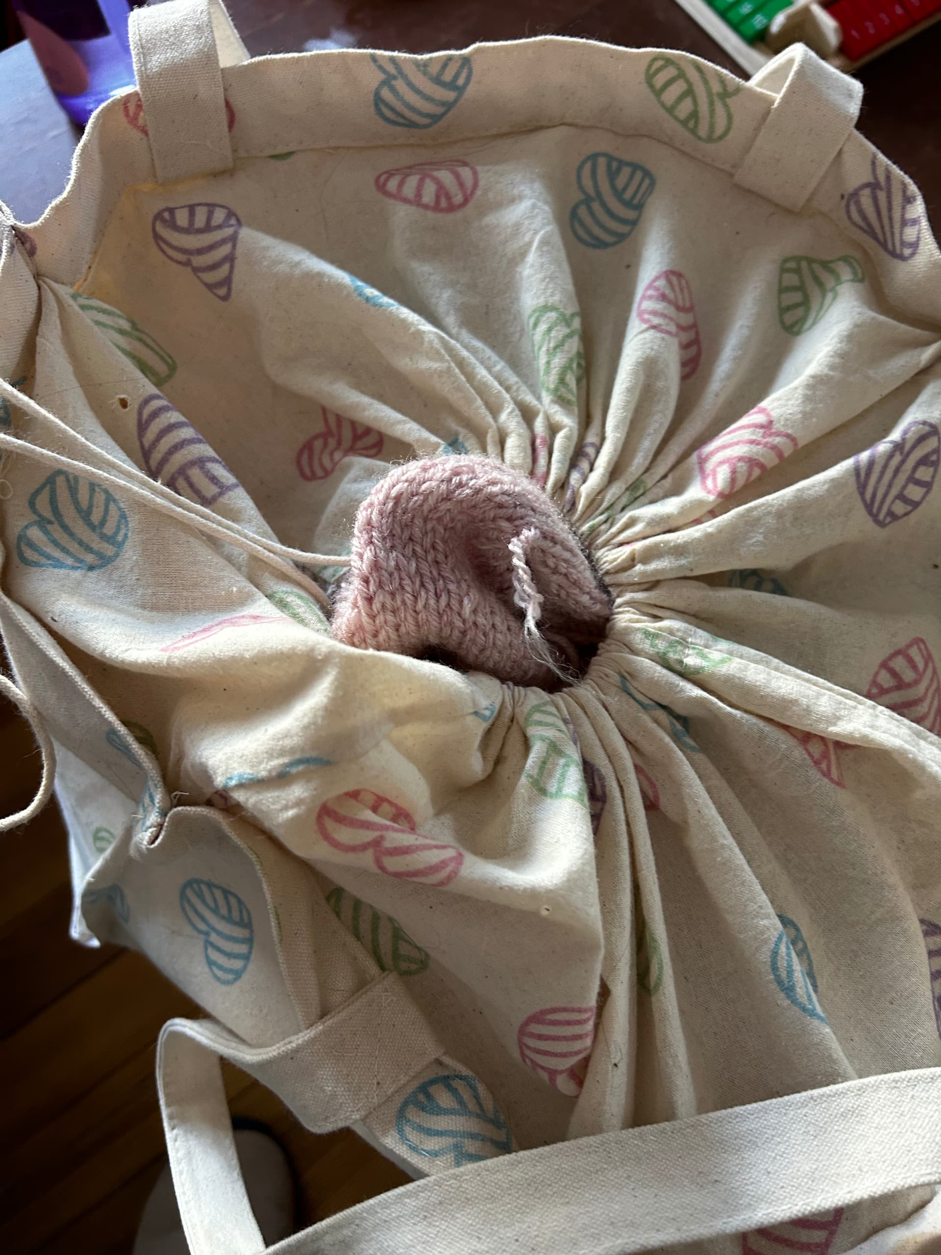 This morning I found my knitting bag in a whole different room from where it was left. The bad bugger had dragged it by the sweater back panel he had snagged through the drawstring closure. C’mon!