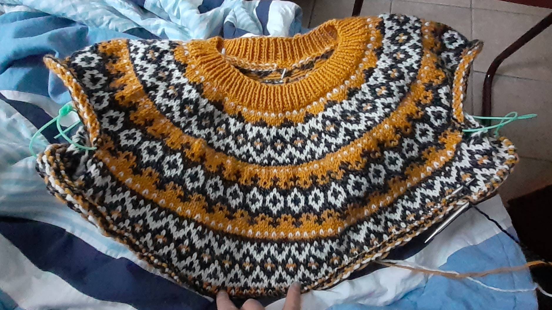 I’m using the Thelma Pullover (free) pattern by Sari Nordlund with some modifications since it’s written for more of a Sport/DK weight yarn, and I’m using worsted with larger needles. Not 100% confident it won’t end up too big, but we’ll see - I sized down from what I normally wear, and split the sleeves off earlier than the pattern would normally call for. I’m almost done with the colorwork yoke, then it’ll just be mostly stockinette for the rest of the body.
