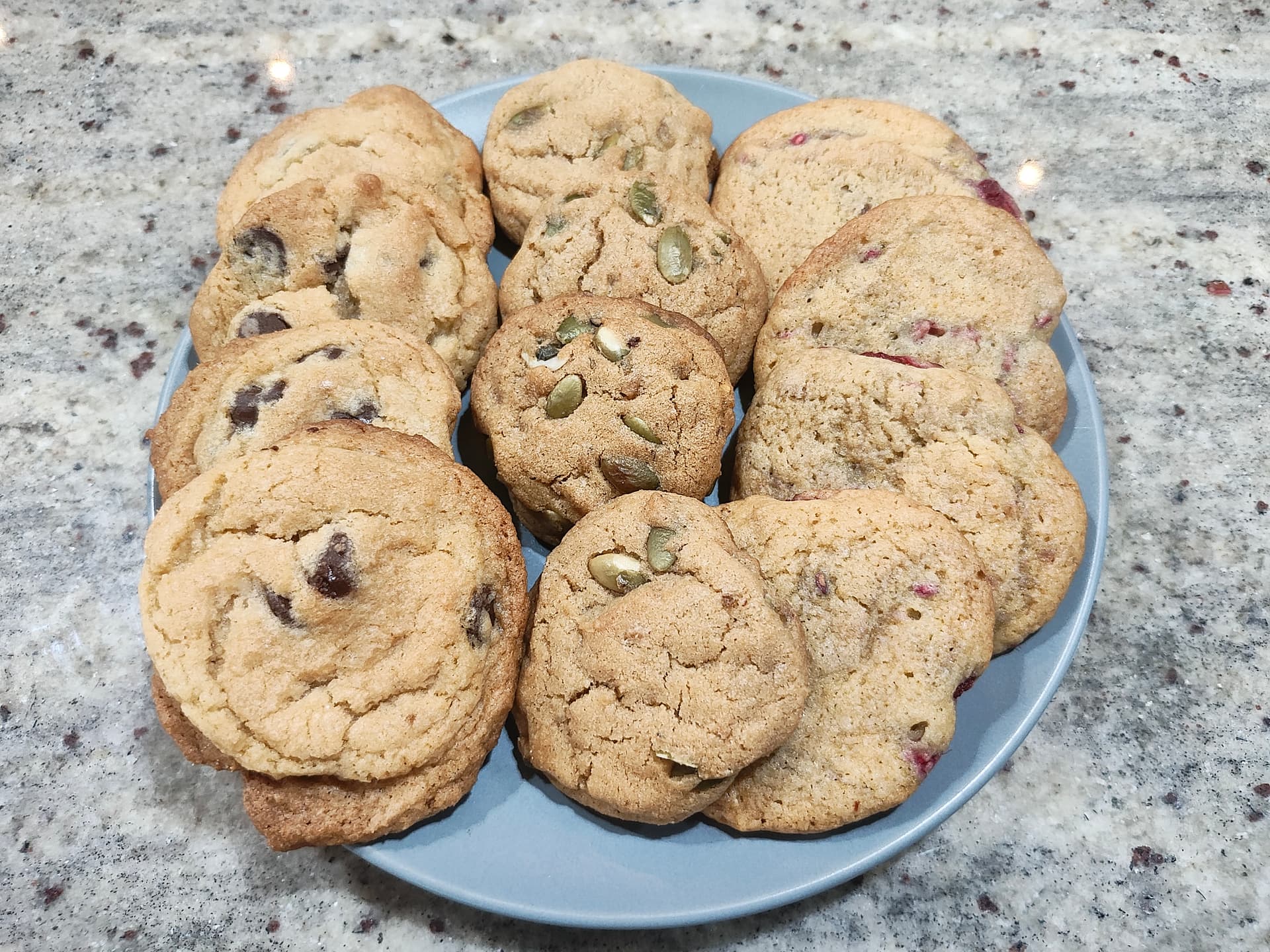 So after a couple hours mucking about we have chocolate chip cookies, brown butter and pumpkin seed (with cranberry and ginger) and raspberry orange. The raspberry orange were supposed to be raspberry white chocolate. But i was out. Then raspberry lemon, but i didn’t have a lemon, plan C was raspberry lime, but, shockingly we were out if limes as well…