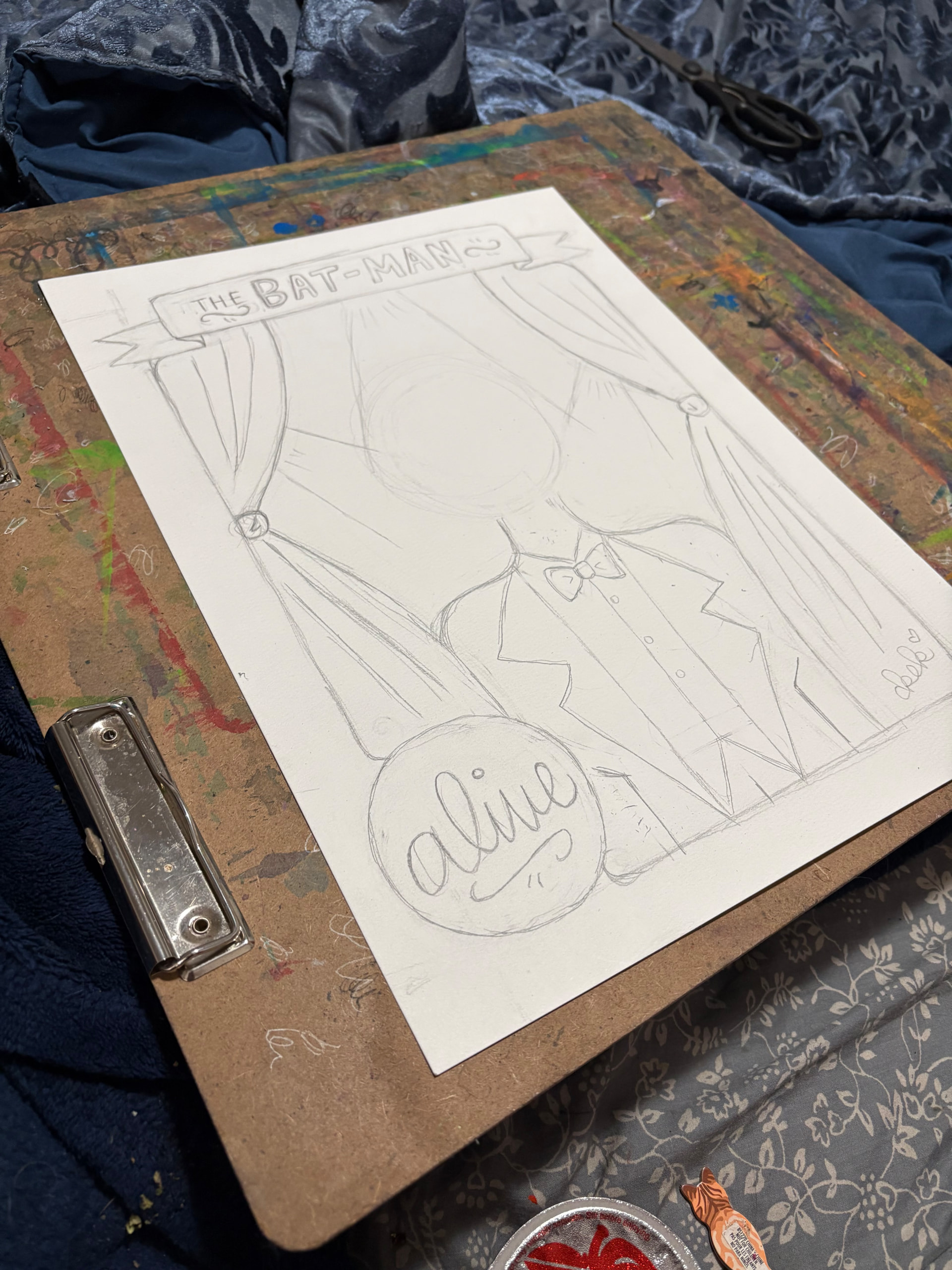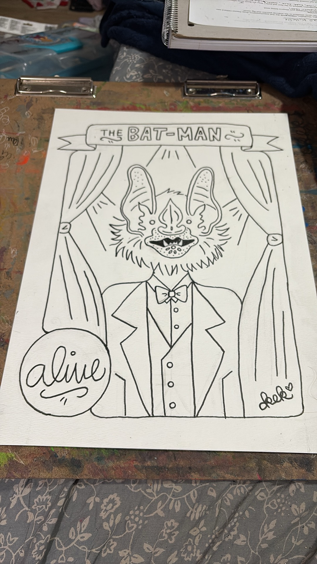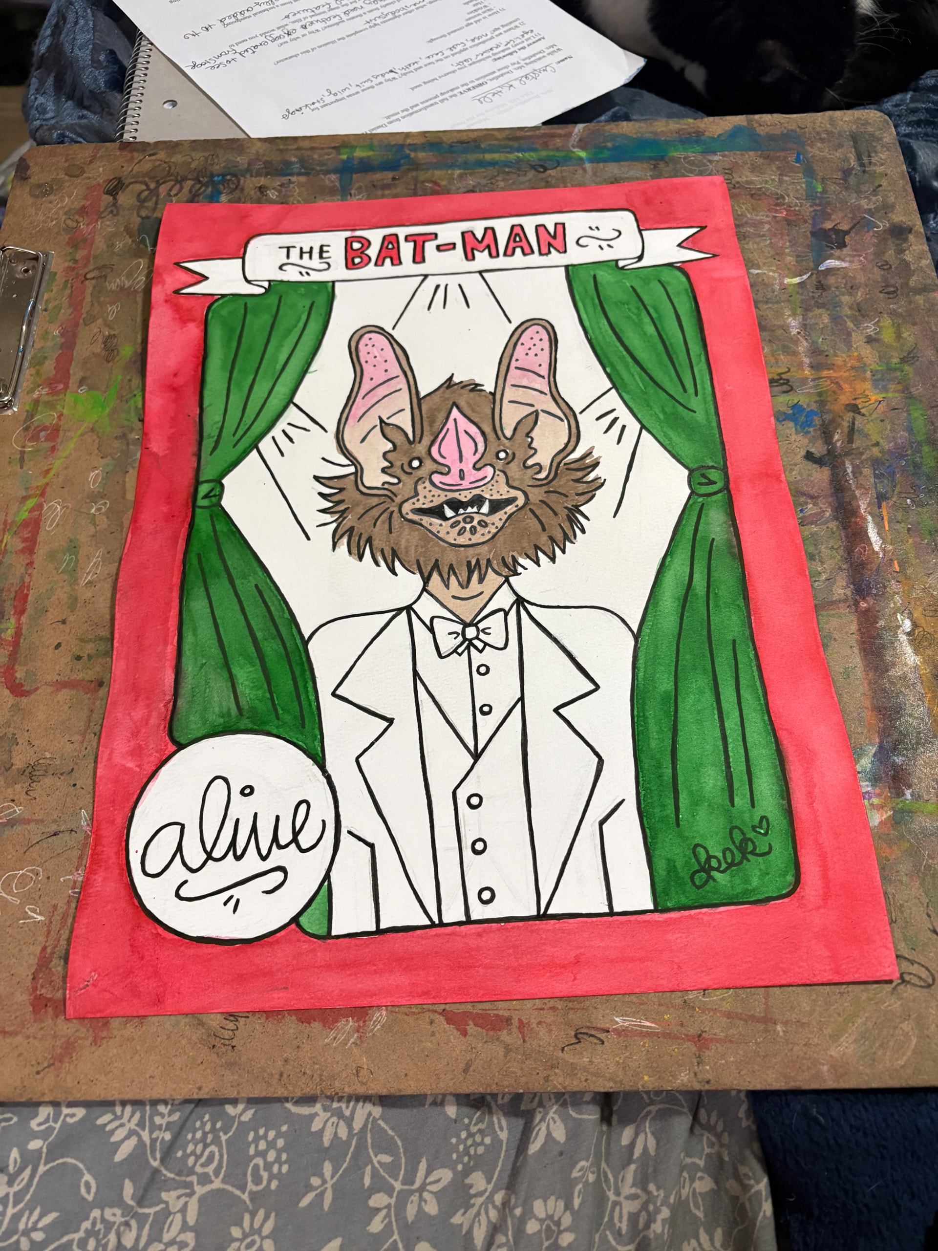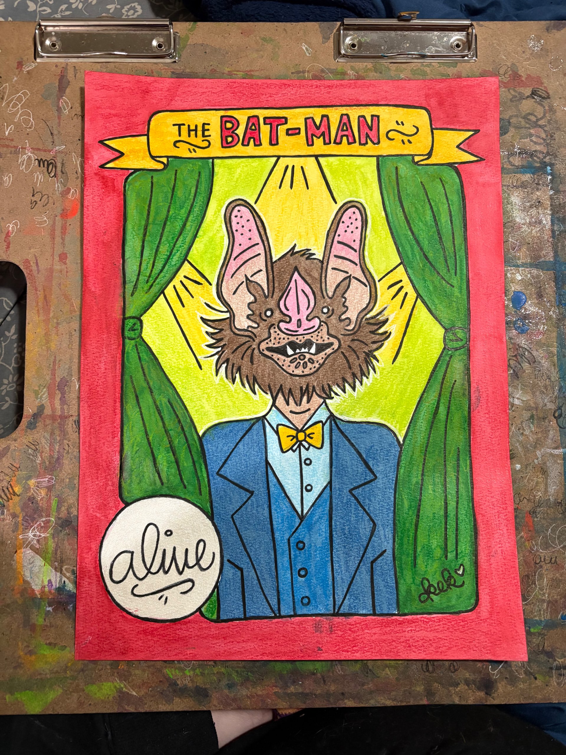 I made this Bat-Man sideshow poster artwork for an upcoming Vintage Circus themed show next month at the community art gallery. I used a scientific illustration of a bat as a reference for the bat head. I tried to included as many elements I saw on other sideshow banners. It’s watercolor and crayon per usual. I’ve chosen not to share this to facebook until after the show starts. I’m very happy with how he came out.